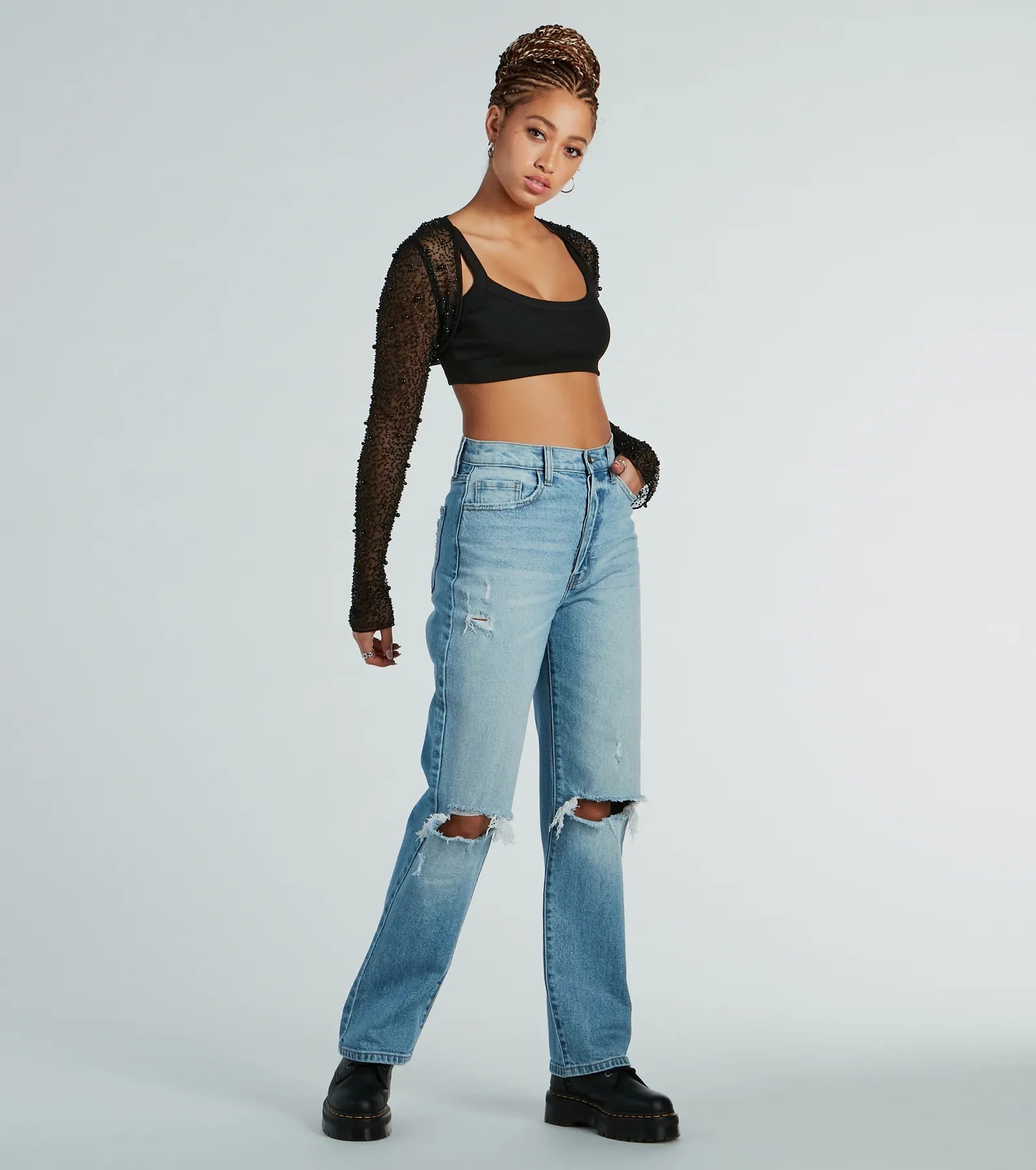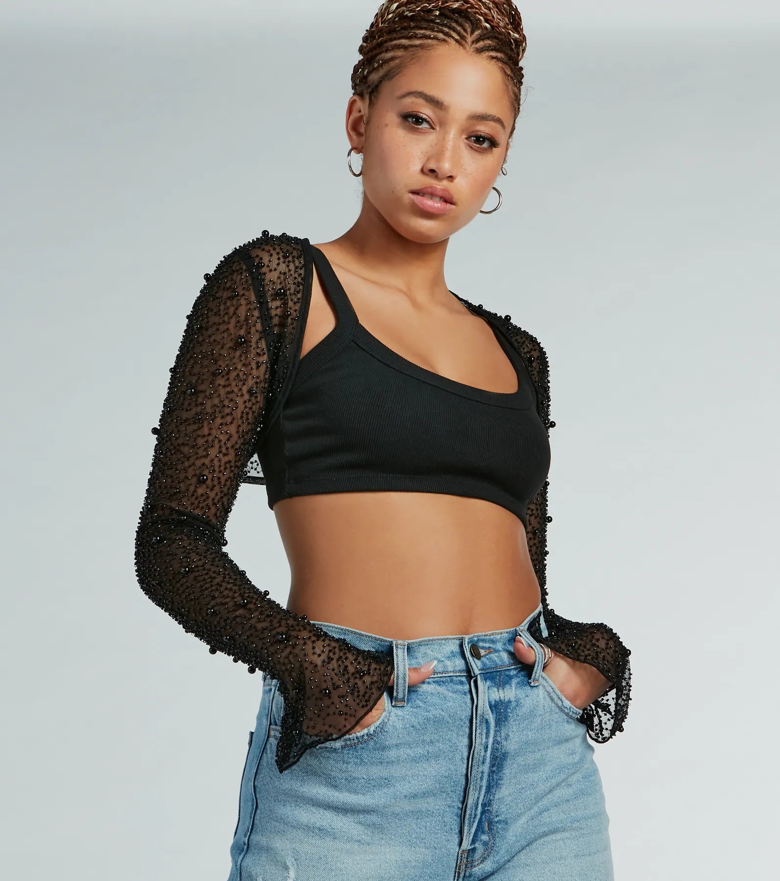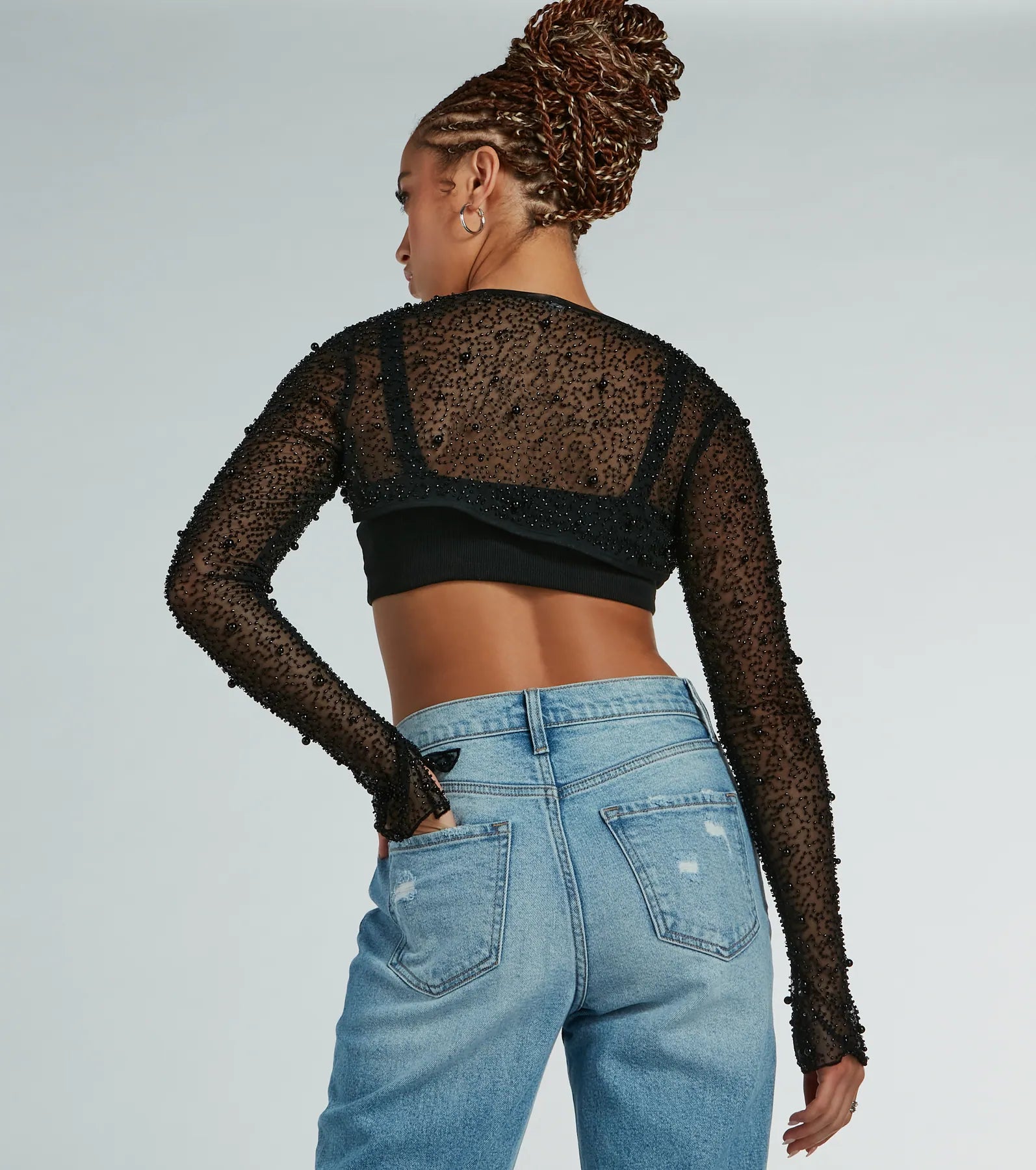 Perfect for any special occasion, this mesh bolero is the epitome of luxury! This sheer mesh bolero is designed with fitted long sleeves with flared slit cuffs, an open front design, and an ultra-cropped hem for a delicate yet modern touch. Adorned with faux pearl and beaded embellishments, this bolero shrug exudes sophistication and elegance. Complete the look in dressy .