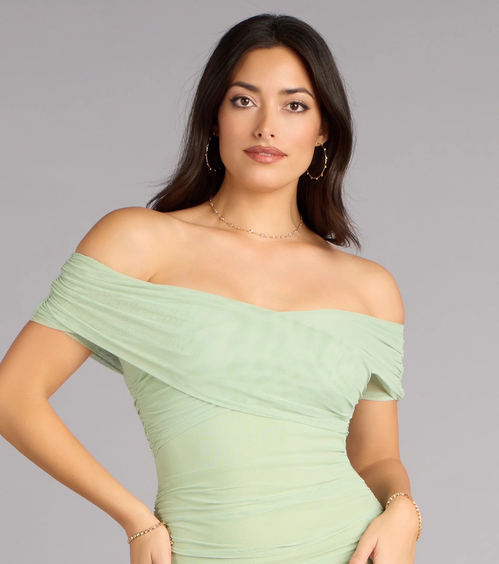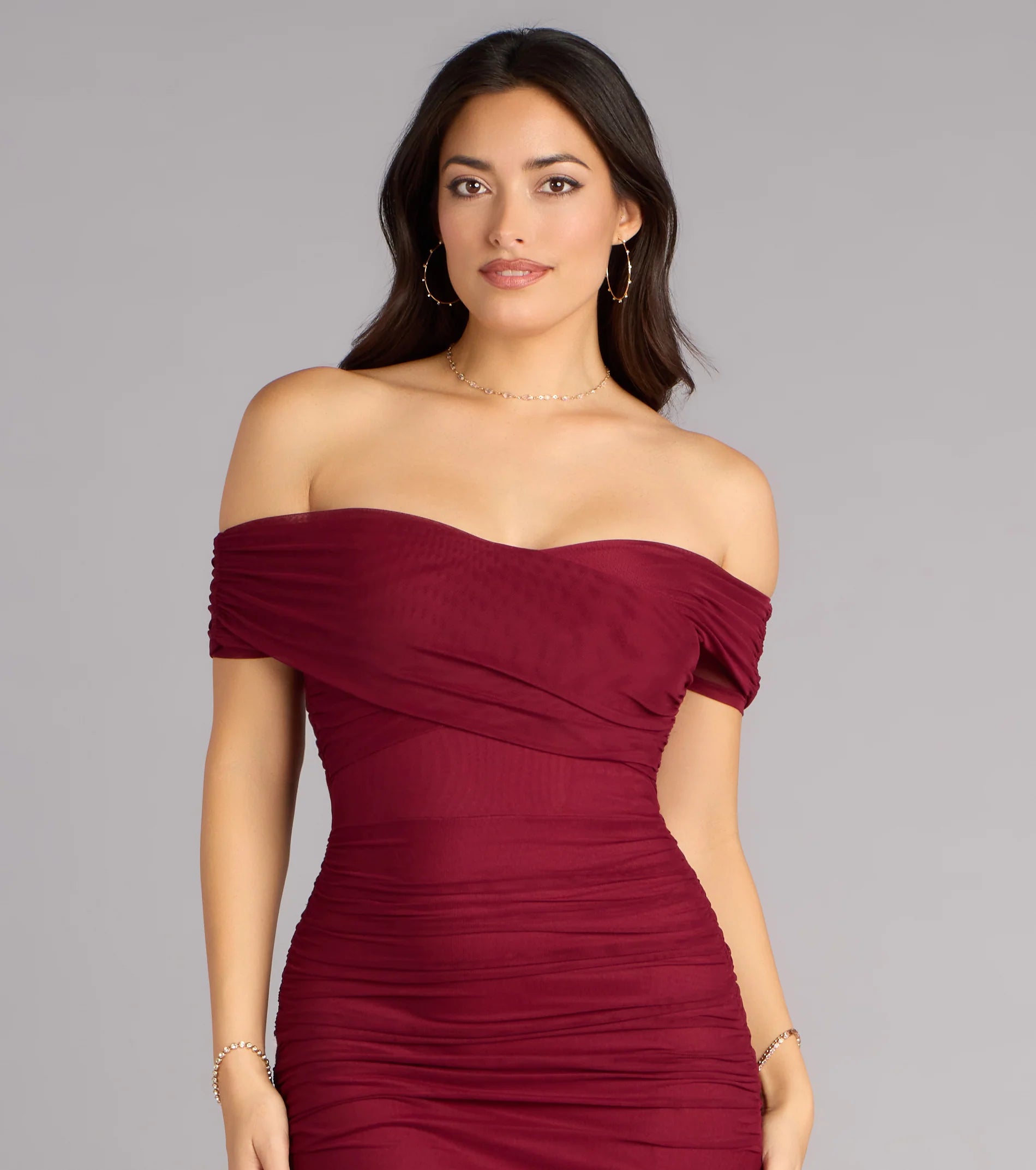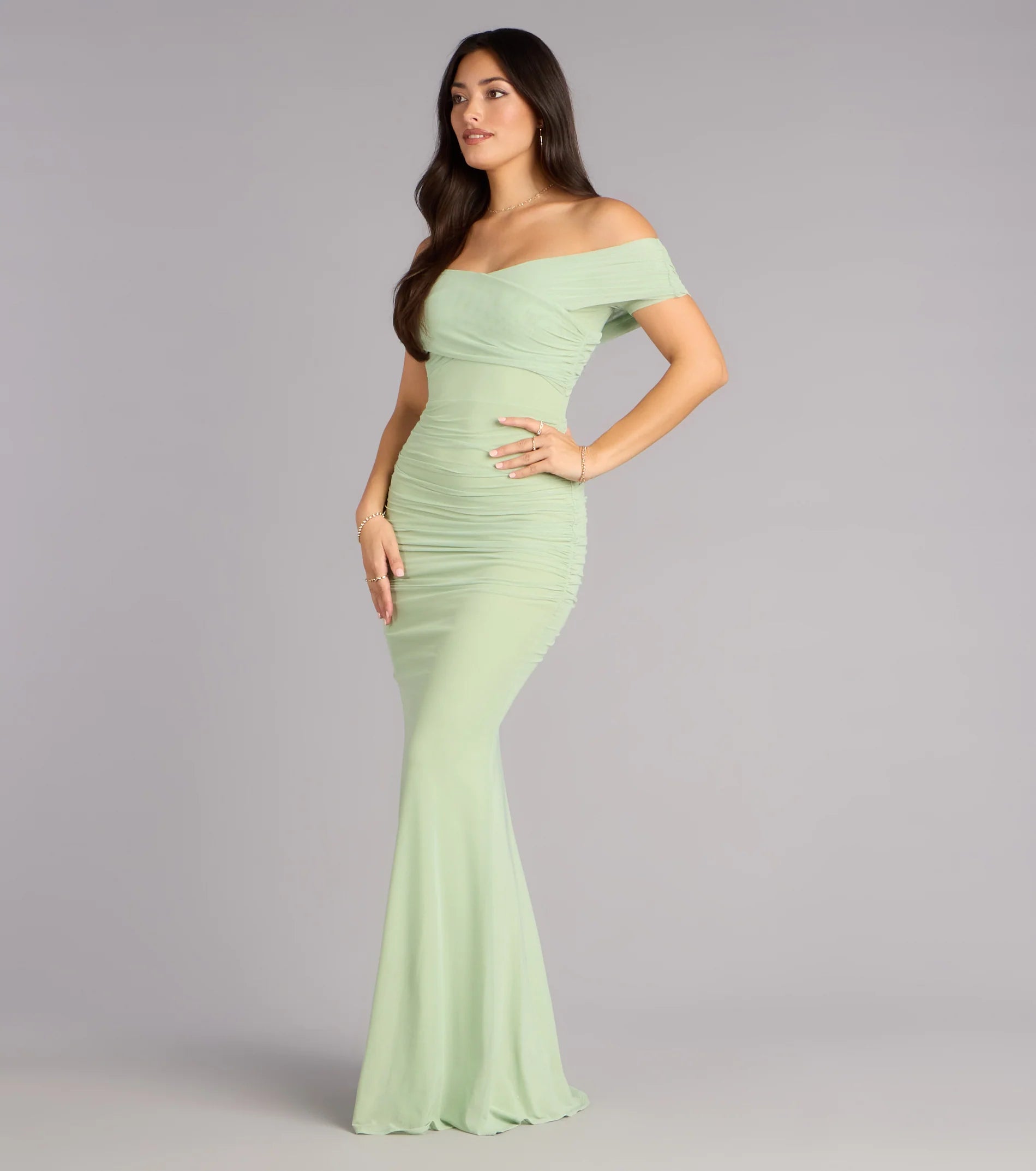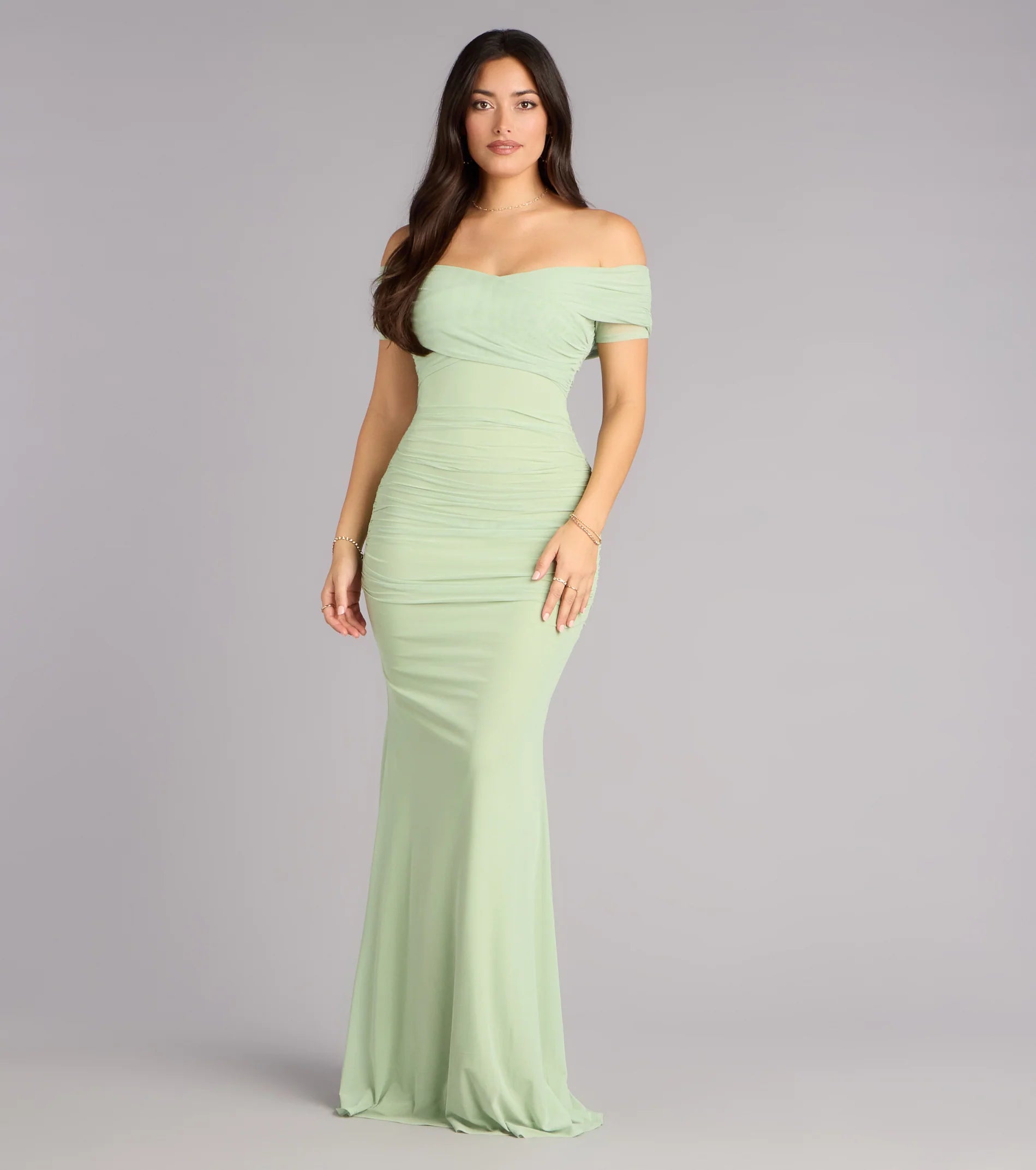 Made for the spotlight and sculpted to stun, the Allison gown is your red carpet moment. Crafted from curve-hugging mesh with allover ruching and an elegant off-shoulder neckline, this mermaid dress brings just the right amount of drama.