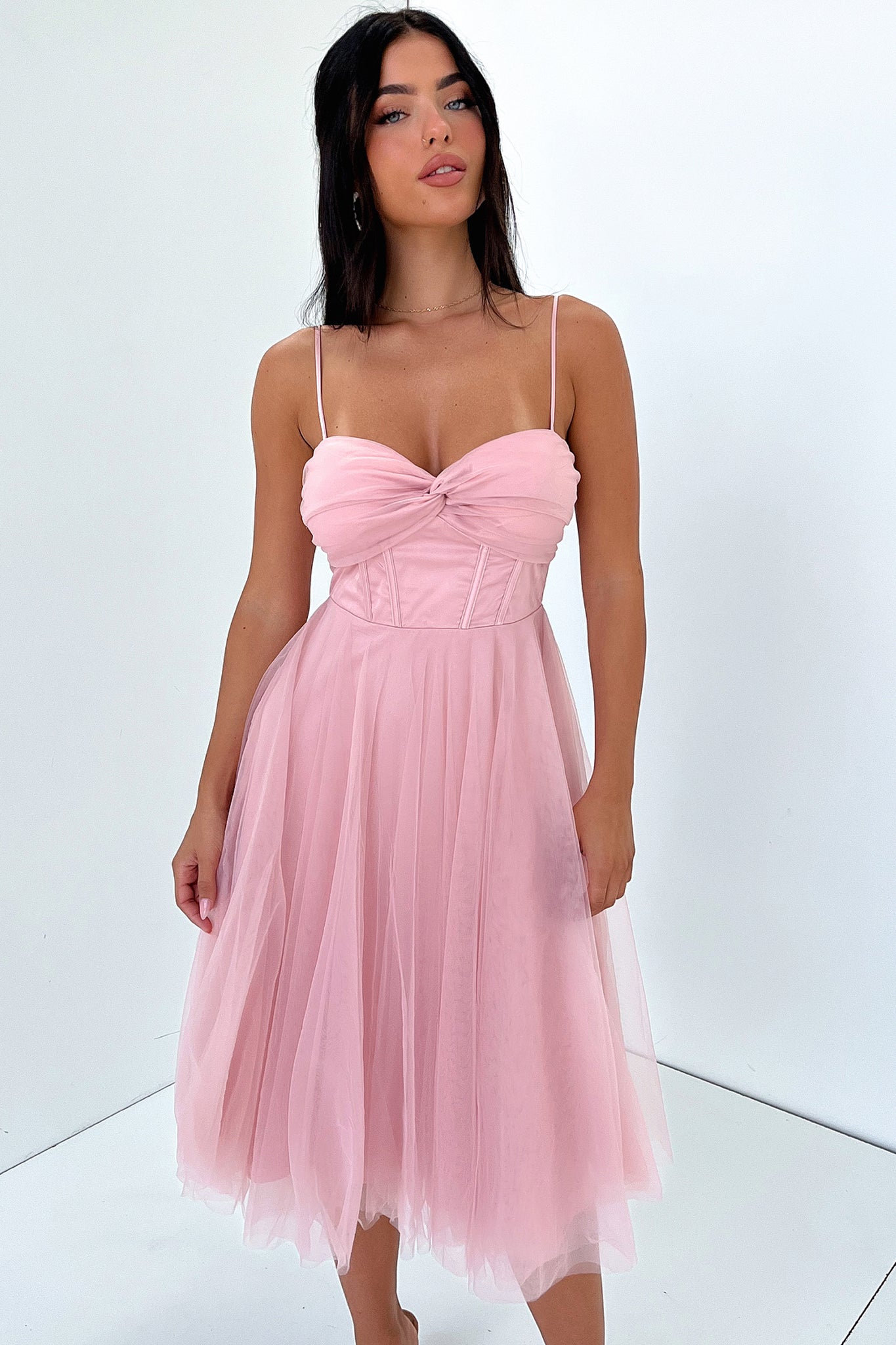 Stand out in the Angelique Dress! She offers a corset style top with padded busts, adjustable shoulder straps, double lining with a top mesh layer, and an invisible back zipper. Style her with heels and a simple clutch for a look that radiates sophistication!