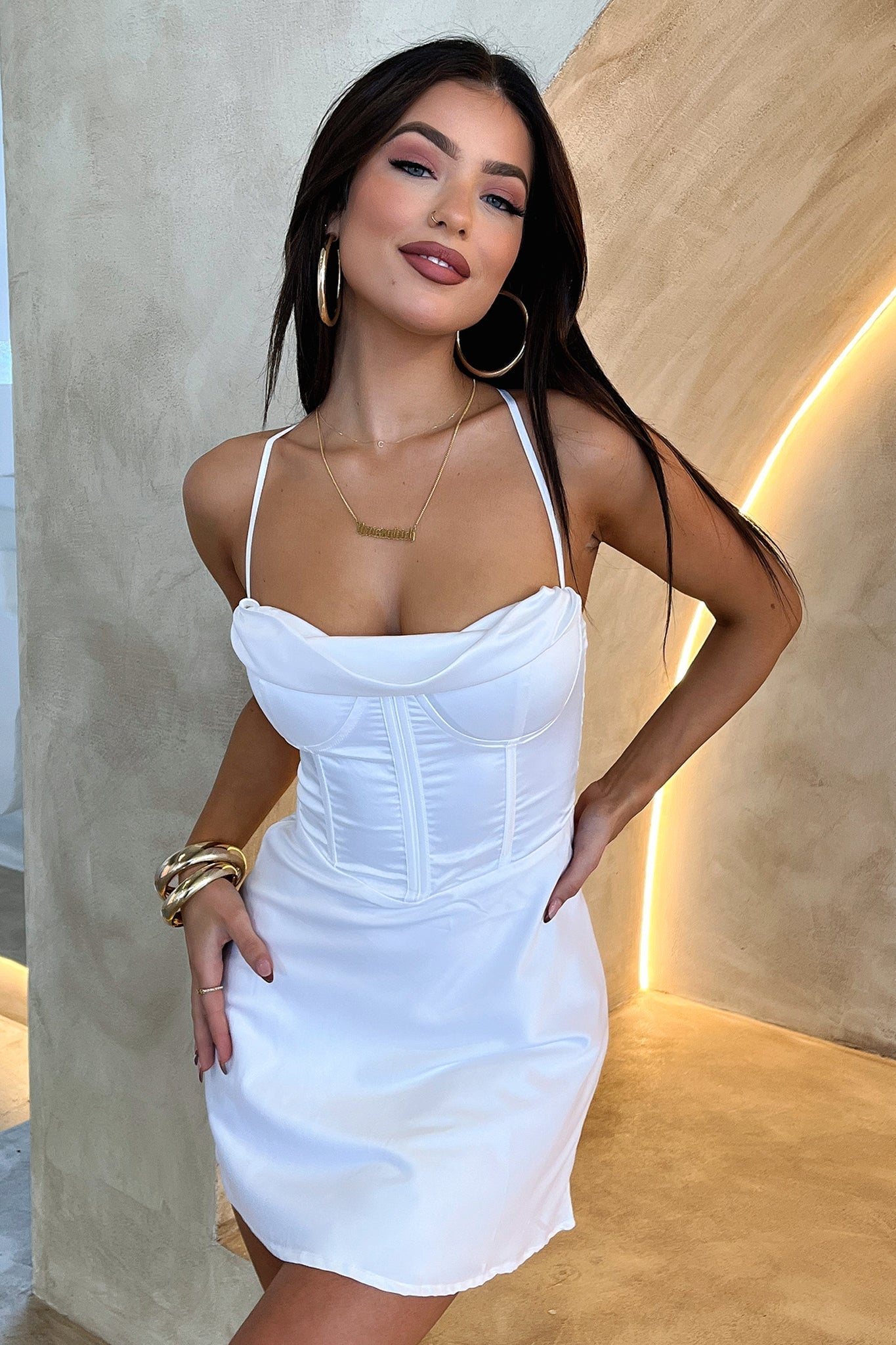 If this isn't the IT dress you've been looking for, then we don't know what is! She comes featuring a sweet A-line fit, a silky soft satin like material with double lining, a corset style top with padded busts, an overlaid cowl neckline, thin shoulder straps that tie down at the back and an invisible side zipper. Style her with nude heels and dainty jewellery for an enchanting look.