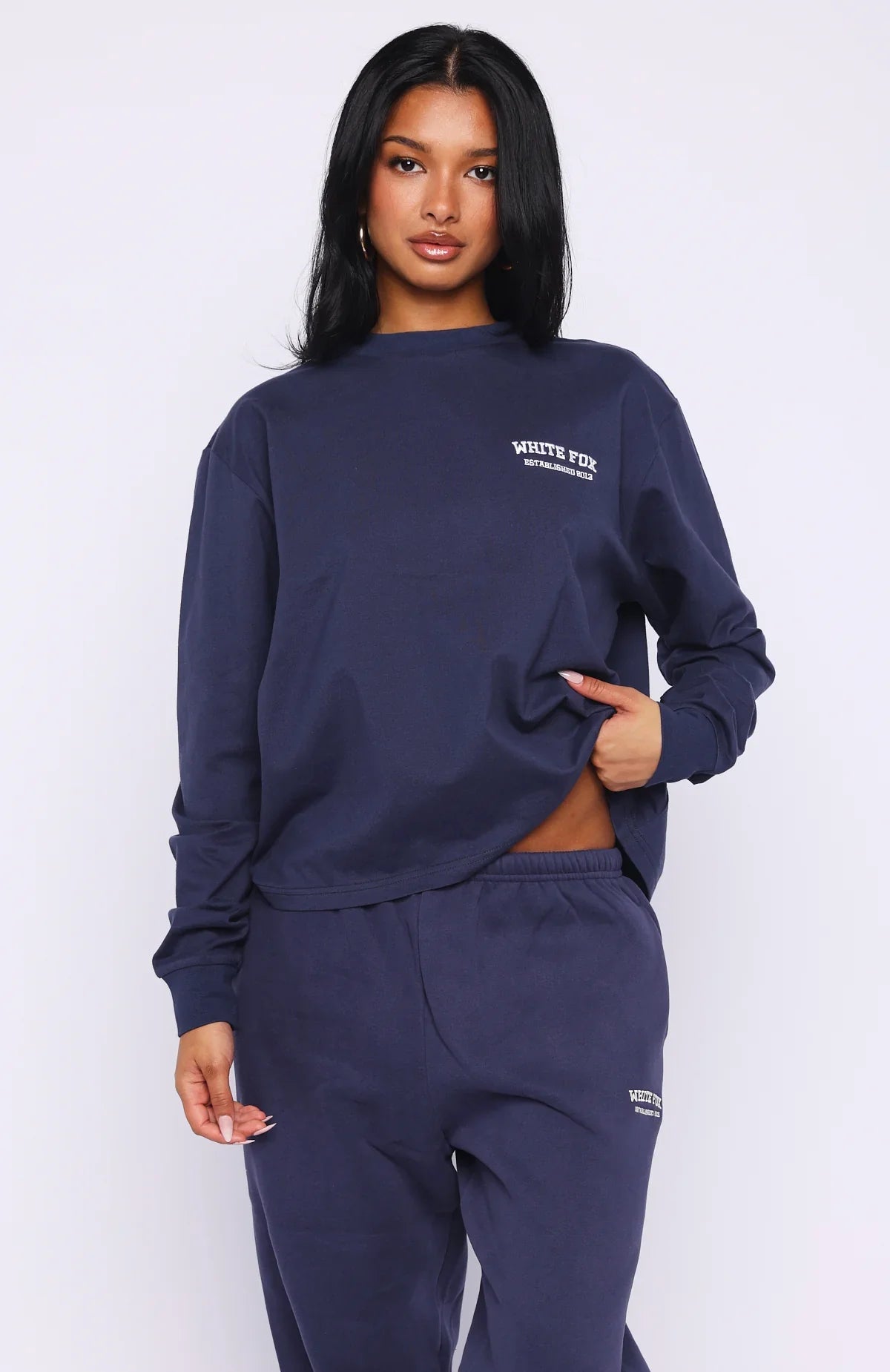 Where words fail, your fit speaks! The Can't Miss It Long Sleeve Tee Navy features a classic crew neckline, drop shoulders and rib-cuffed sleeves. This relaxed silhouette drapes casually and is finished with subtle White Fox embroidered side-front text. Style with the matching bottoms and your go-to sneakers for a cute casual fit.