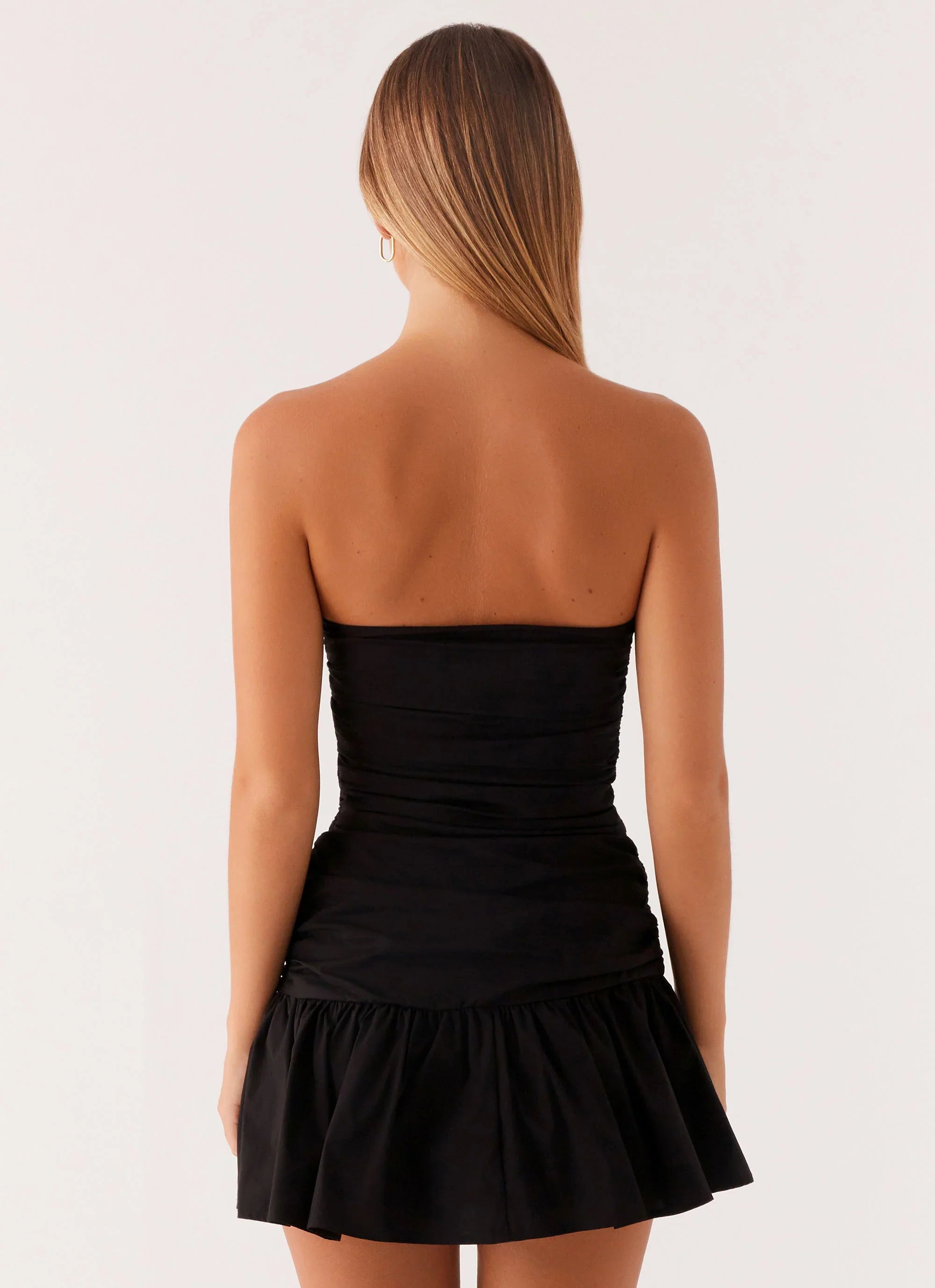 The Carmel Mini Dress features a strapless neckline with ruched sides and a flattering drop waist. This mini dress combines comfort and style, offering a chic, form-hugging fit with a touch of elegance. Fully lined for a smooth finish, it's perfect for any occasion.