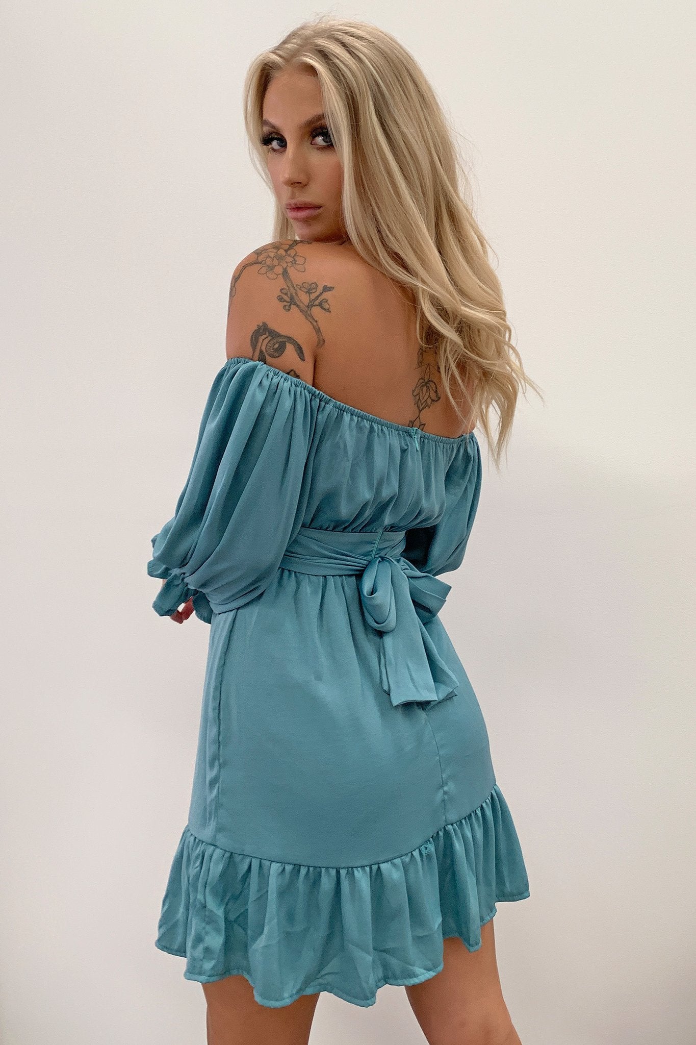Day dreaming of special nights out in the Cheve Dress. This beautiful dress is made from a soft silk like fabrication with 3/4 sleeves, off the shoulder sleeves, waist tie under the bust and flowing skirt with large frill detail along the bottom hem. She is perfect for your next special occasion when paired with Black heels.
