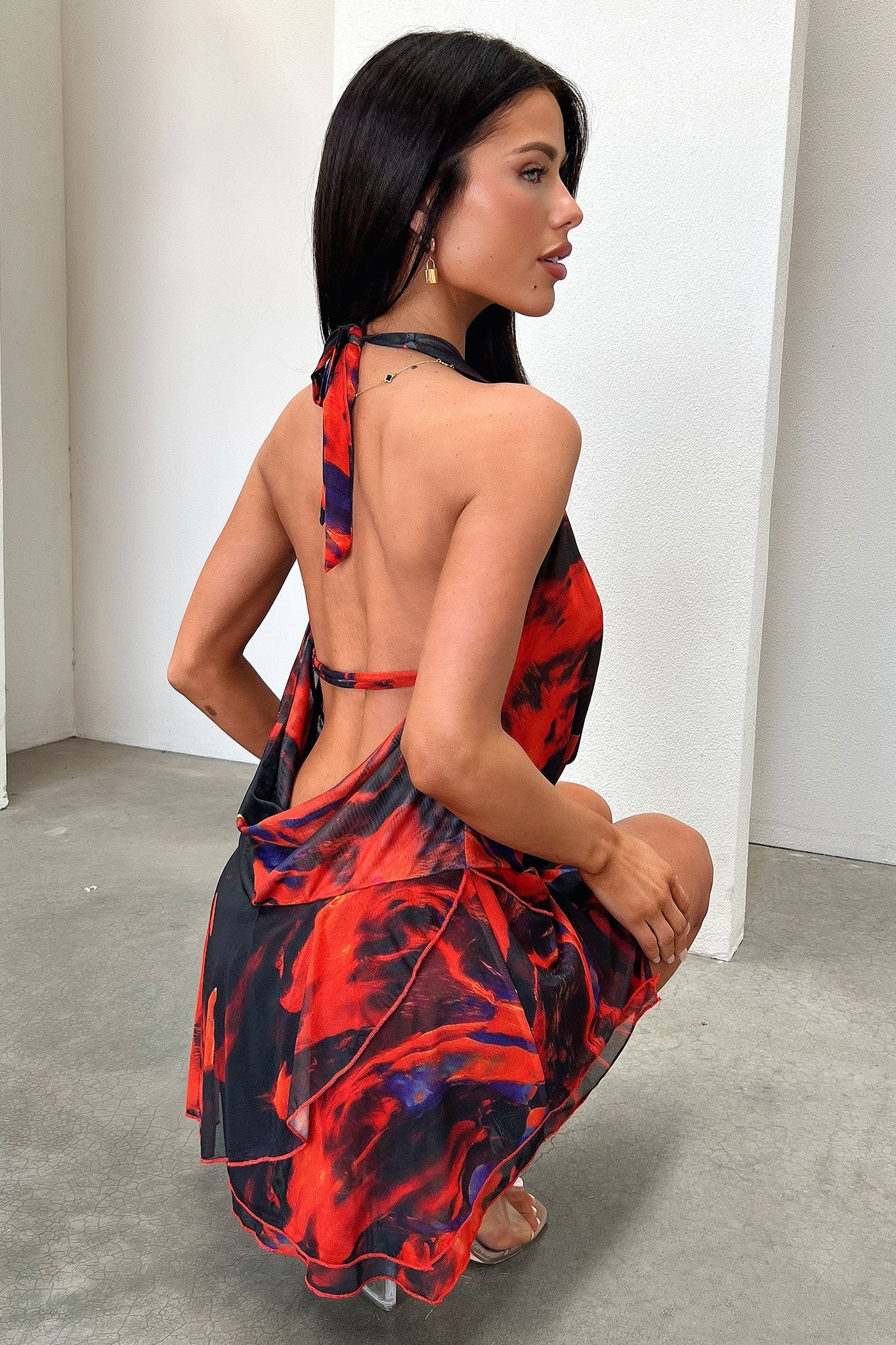 Introducing our Cleo Dress! This layered mini dress features a plunge neckline and open back for a sexy yet sophisticated look. Complete the ensemble with the included neck tie and adjust the back for a perfect fit. Pair with heels and gold jewelry for a stylish and chic outfit!