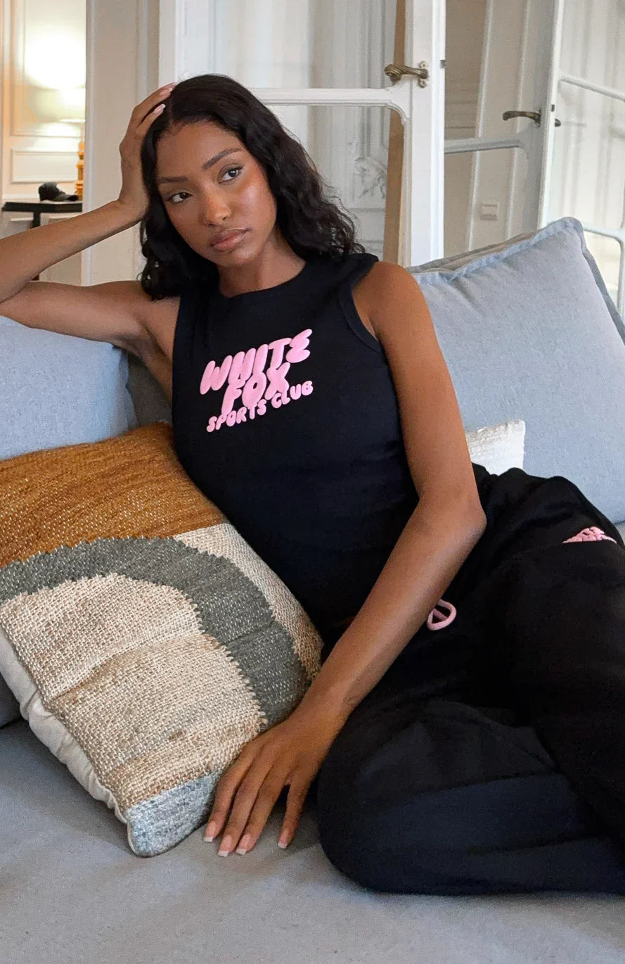 Team energy in the Club 14 Allie Tank Top in Black! Crafted from thick, unlined ribbed fabrication, this tank features a classic high neckline, thick shoulder straps, and a fitted silhouette. Finished off with "White Fox Sports Club" text at the centre front, it brings a sporty edge to your everyday wardrobe. Pair with Club 14 Allie Wide Leg Sweatpants, your fave sneakers and sunnies.
