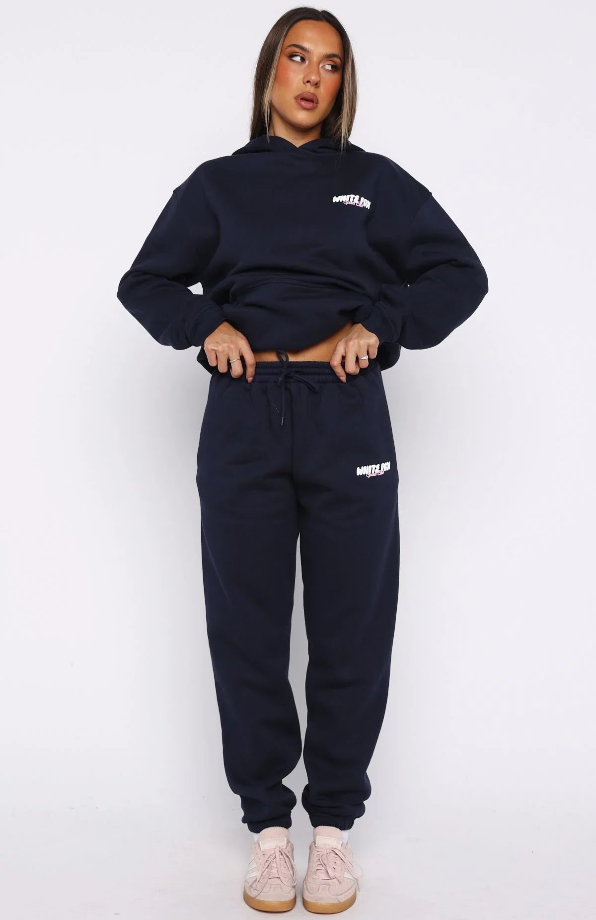 Rainy days call for the Club 14 Trinity Sweatpants Navy. Designed with a thick elasticated waistband featuring an external drawstring tie, side pockets, elasticated cuffed ankles, and a slightly oversized silhouette. The White Fox puff-print text at the side adds a signature touch, while the unlined fleece interior ensures a cozy feel. Style with the matching Club 14 Trinity Oversized Hoodie for the perfect lounging all day fit.