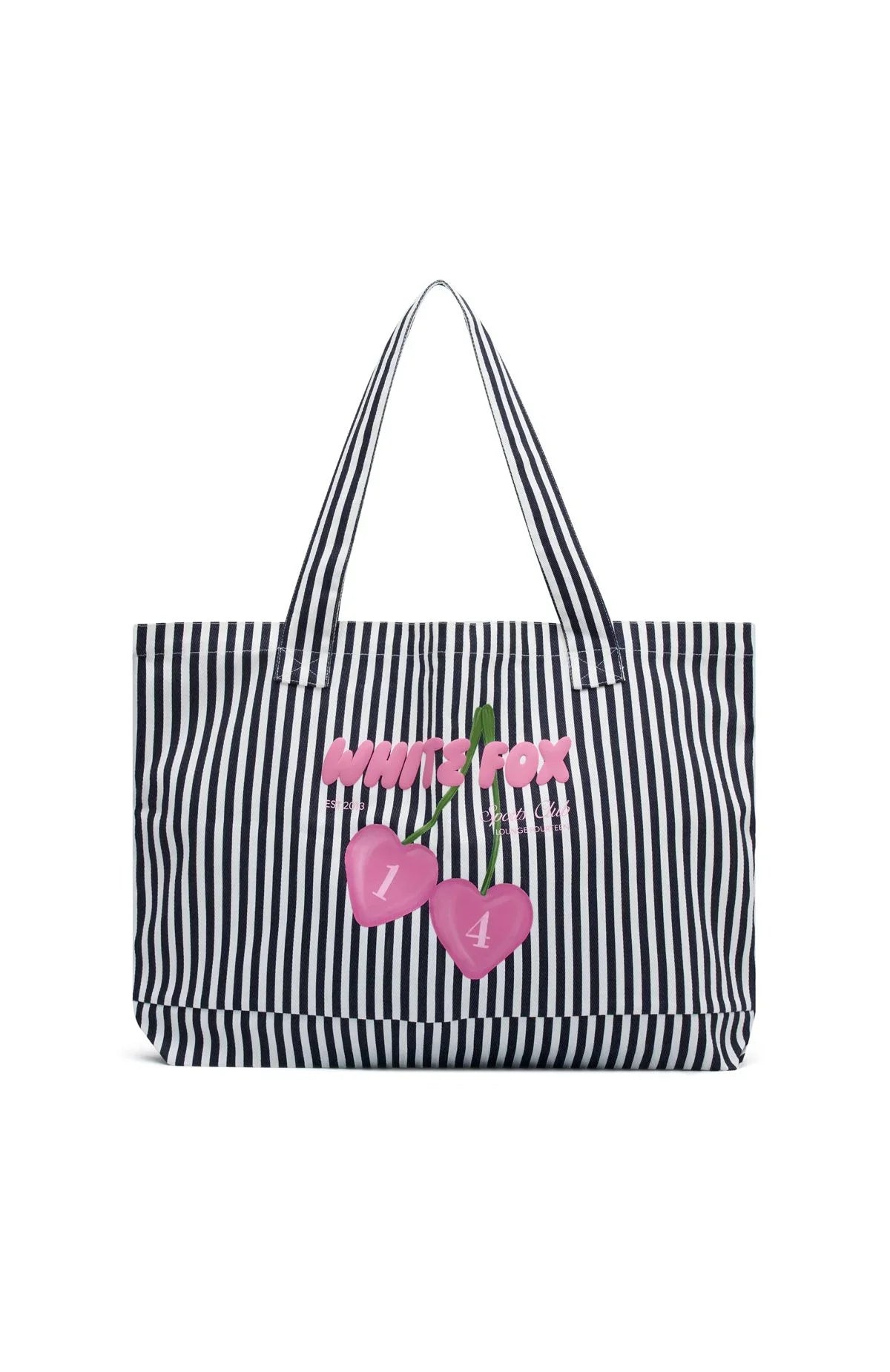 BRB adding to cart! The Club 14 Trinity Tote Bag in Navy features comfy shoulder straps and bold White Fox text with cherry graphic. Simply pair with your fave Club 14 lounge set for a cozy look.