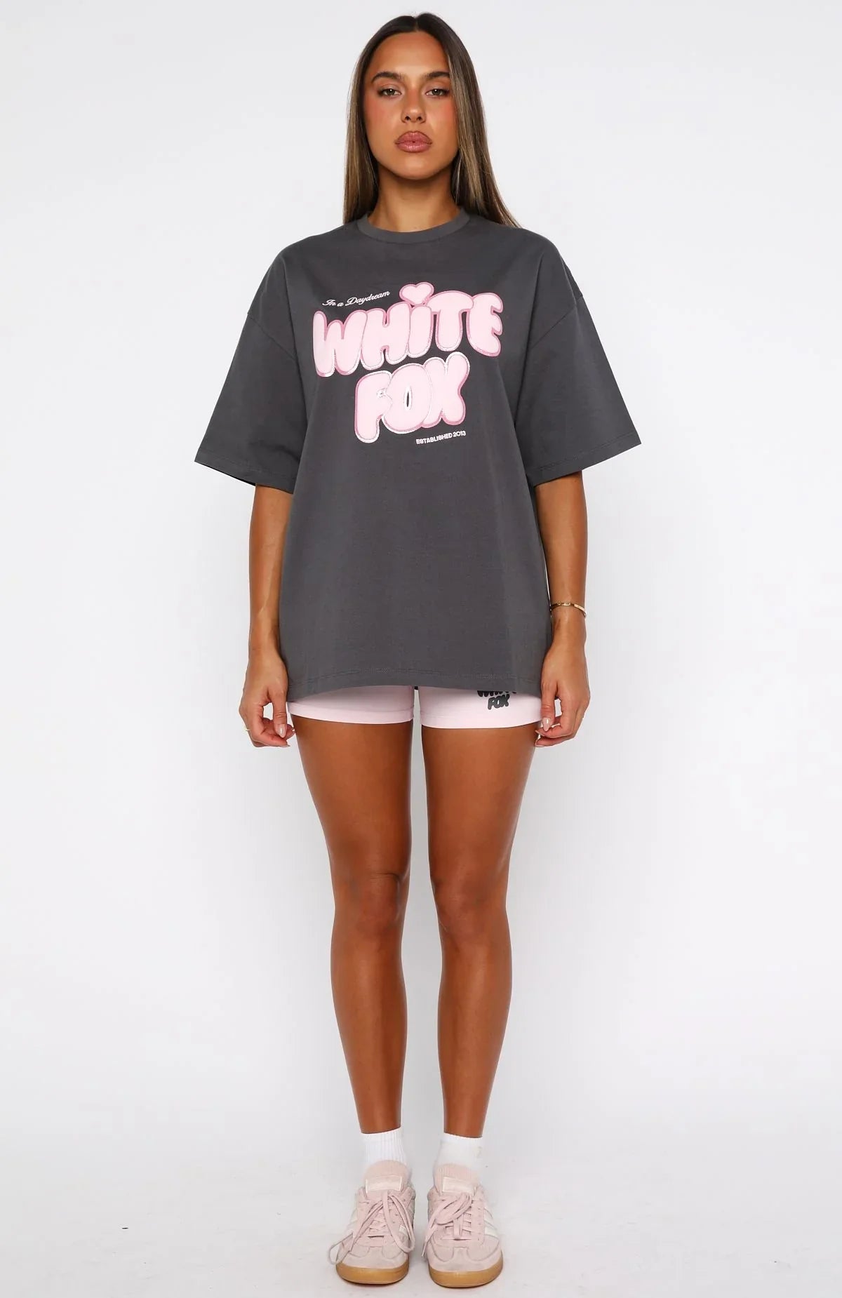 The Daydreamers Angelina Oversized Tee Volcanic is for the ones who glow even in their off duty hours! Featuring a ribbed crew neckline, relaxed drop shoulder design, breezy short sleeves an over sized silhouette. Finished off with a White Fox puff print text centre frontwith glitter outlining detail. Pair with the matching Daydreamers Angelina Bike Shorts Soft Pink for an outfit worthy of stares!