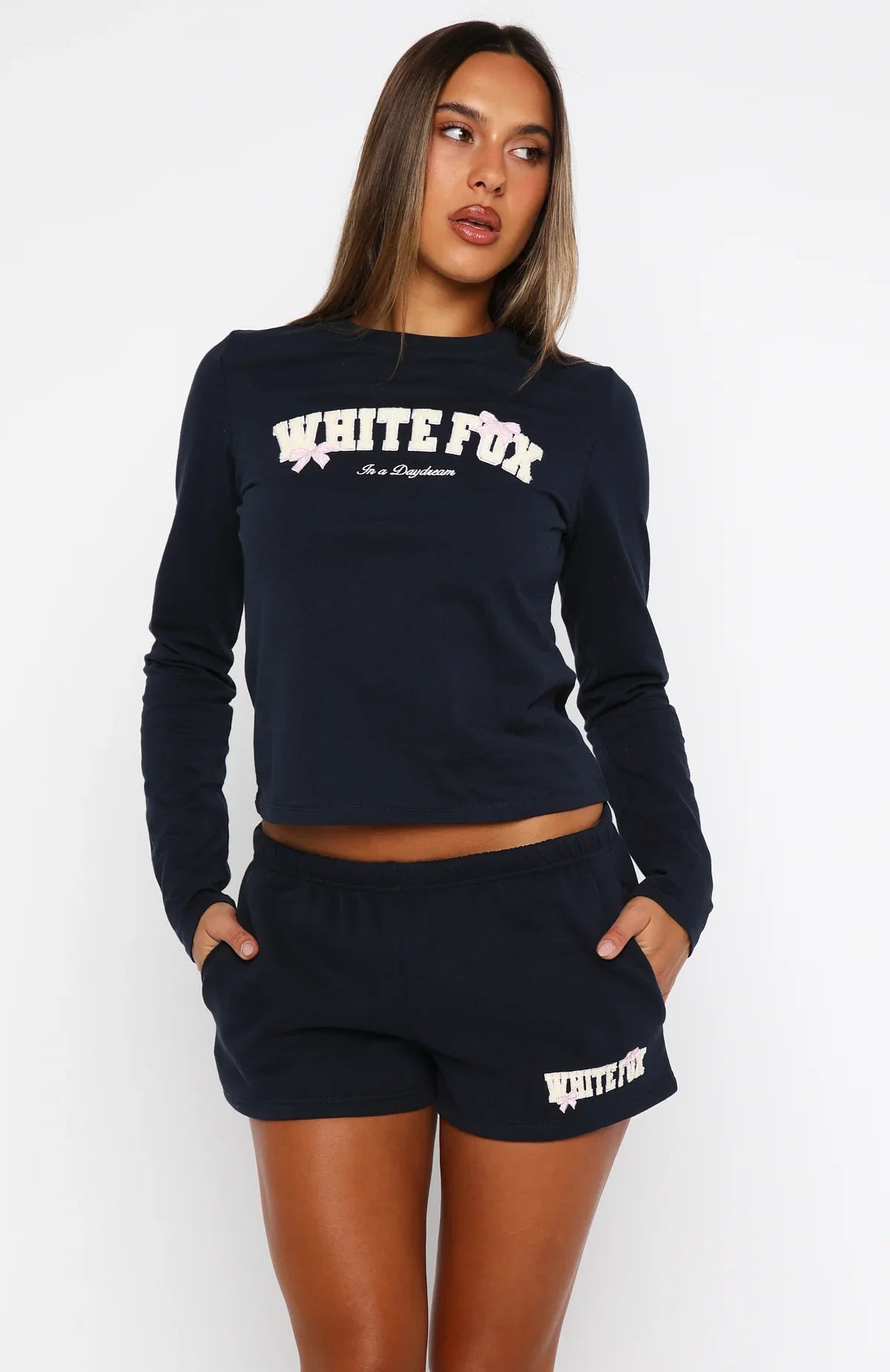 Sweet, comfy and made for your soft girl routine…The Daydreamers Madeline Lounge Shorts in Navy are designed with a thin elasticated waistband featuring an internal drawstring tie, side pockets, and a relaxed silhouette. The Borg White Fox text at the side adds a signature touch, while the unlined fleece interior ensures a cozy feel. Keep it cute and comfy by pairing with our Daydreamers Madeline Long Sleeve Baby Tee Navy!