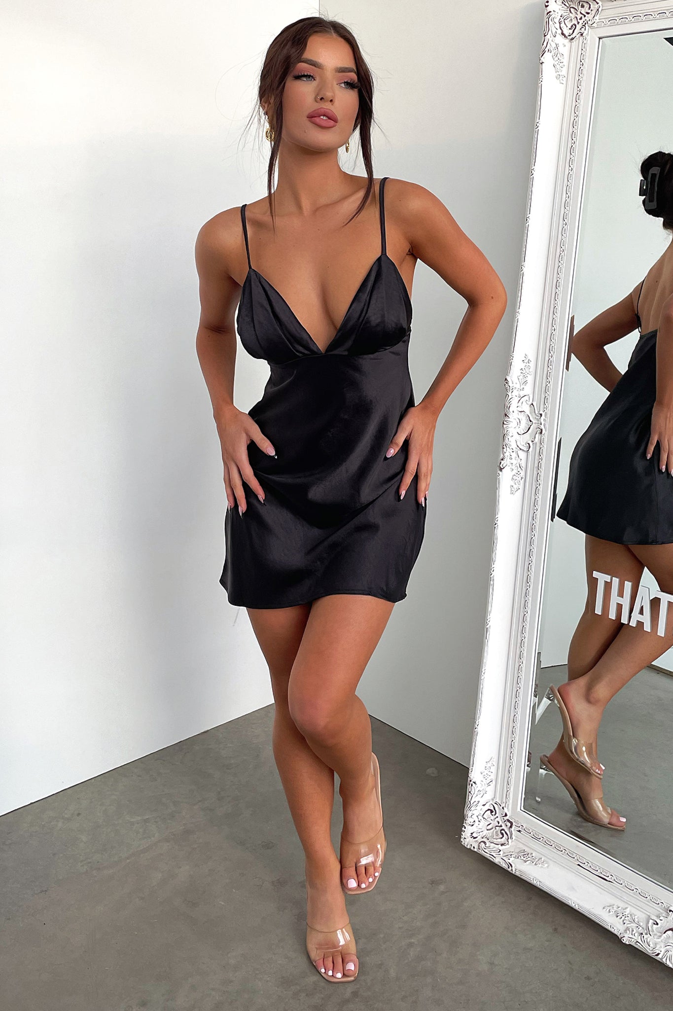 Look absolutely fire in the hot new dixie Dress in Black. This babe of a dress features a pleated bust with a curved v-neck line, adjustable spaghetti straps, a super silky soft satin material and an elegant slip on, a line fit. Match her with some dainty gold jewellery and a pair of heels for a romantic dinner date.