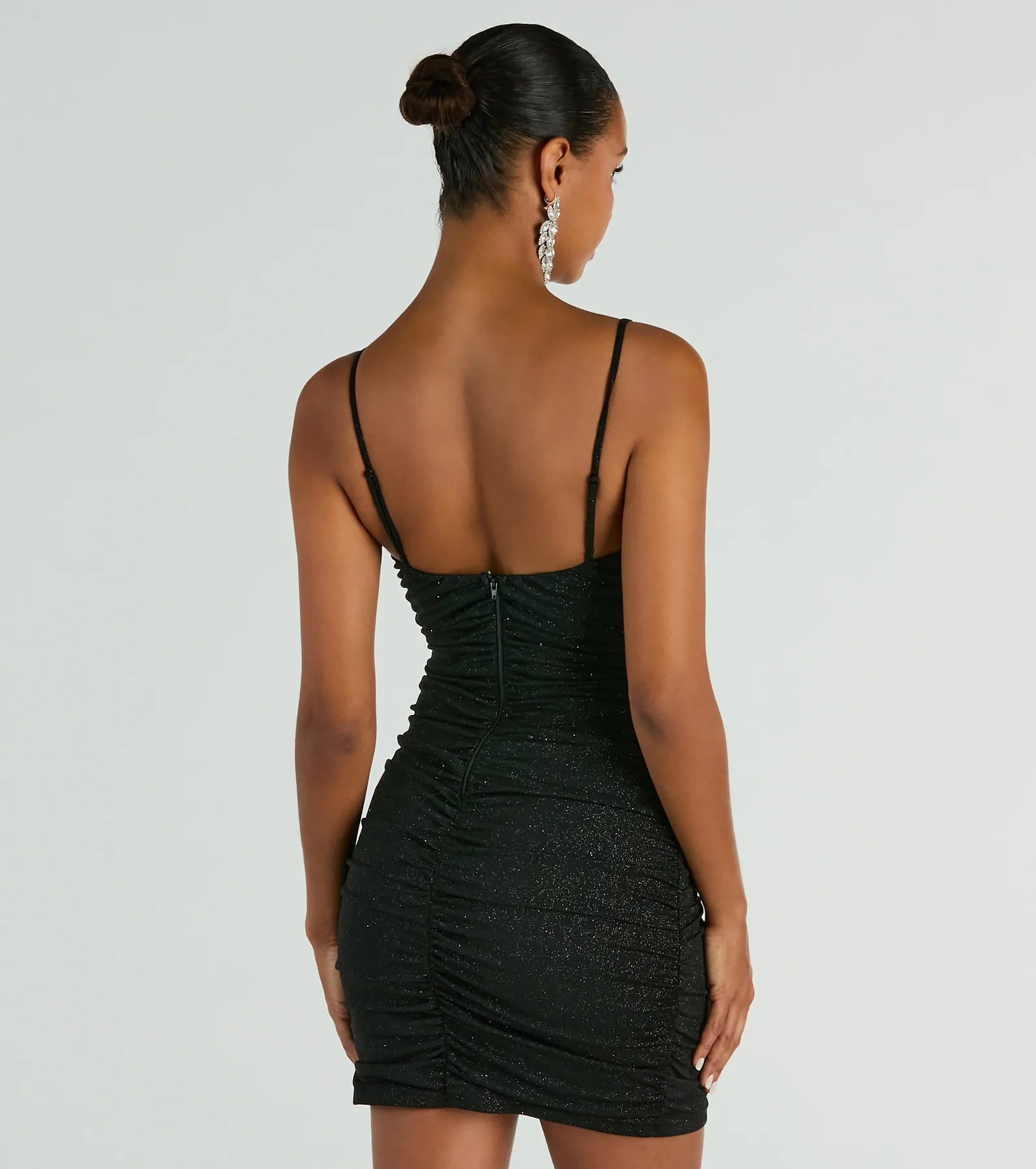 For the bride-to-be or birthday babes! The Elsa party dress will elevate your celebration. She features a sleeveless V-neckline, adjustable spaghetti straps, and side and back ruched seams that accentuate your curves along the bodycon silhouette and flirty mini-length hem. The formal dress is composed of a glitter knit fabric with a stretchy knit lining. Complete the look in sassy