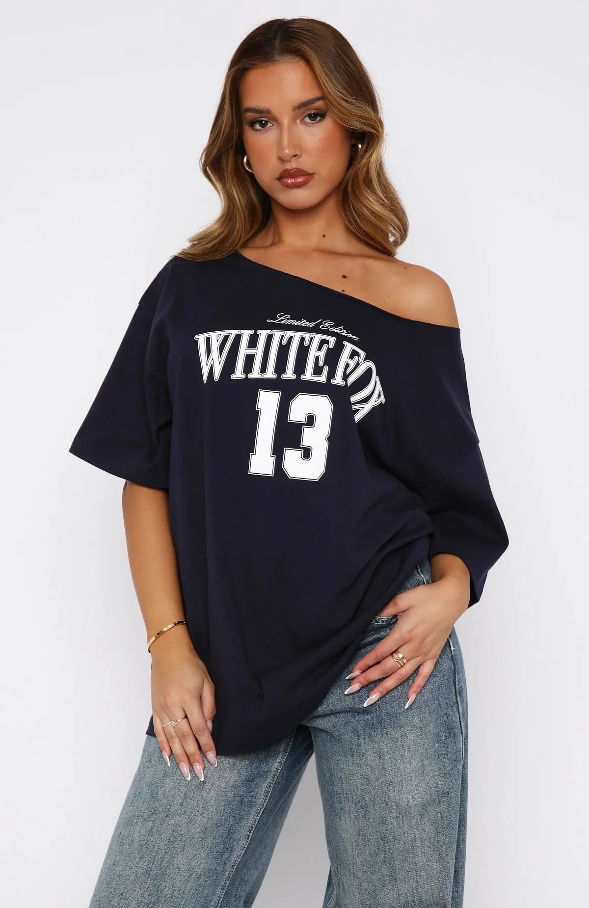 The Everything In Time Off Shoulder Oversized Tee Navy features an off the shoulder design, oversized fit, slouch shoulders and printed logo design centre front. Team with a skort and your favourite sneakers for the ultimate chic and sporty look!