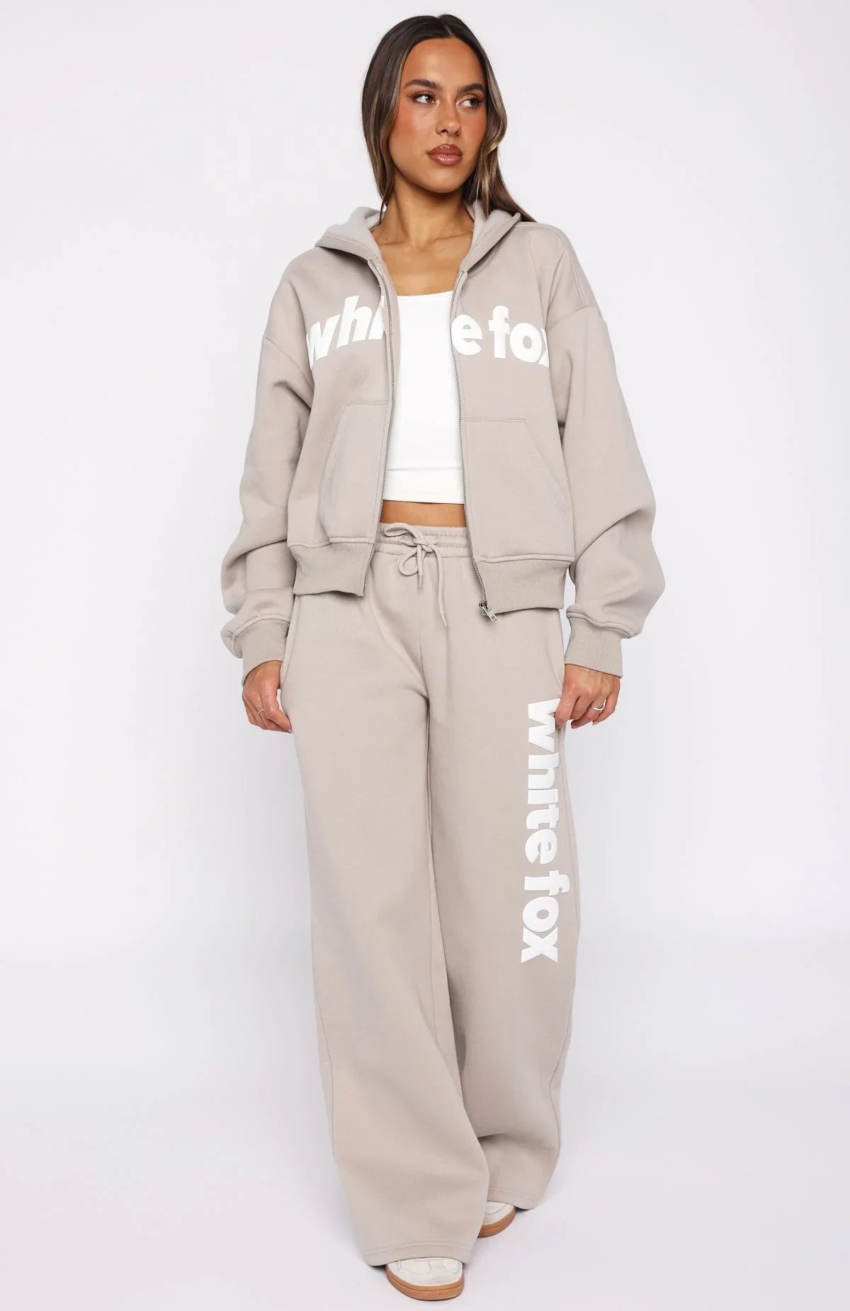 Sundays just got a whole lot cooler and cosier! The From The Archives Kenzie Boxy Zip Front Hoodie Grey Marle is designed with a relaxed hood, slouched shoulders and ribbed hems which round out a boxy silhouette. Featuring long sleeves, front zipper closure, a roomy front pocket, and an unlined fleece interior, this hoodie delivers a cozy feel. White Fox distressed text embellishes the front. Style with the matching From The Archives Kenzie Wide Leg Sweatpants Moon.