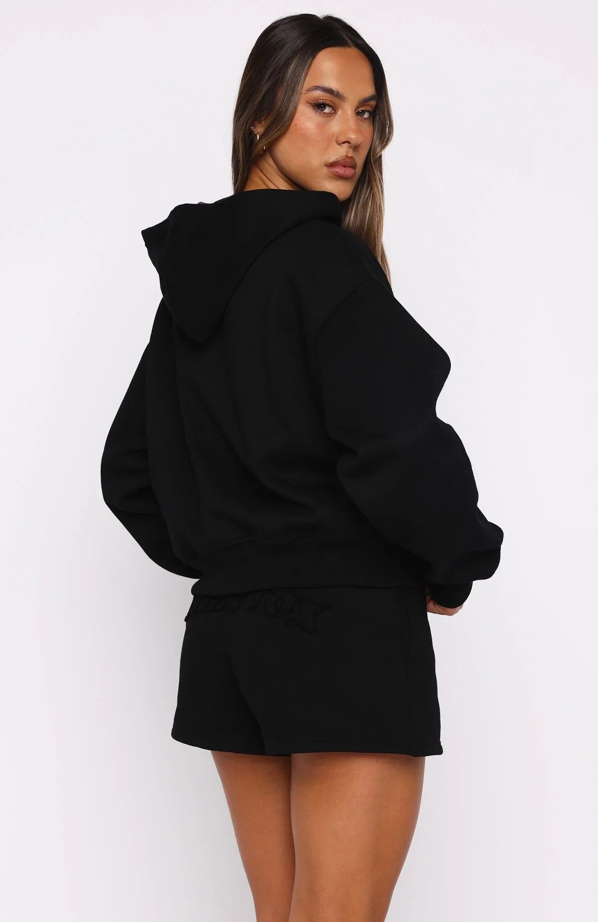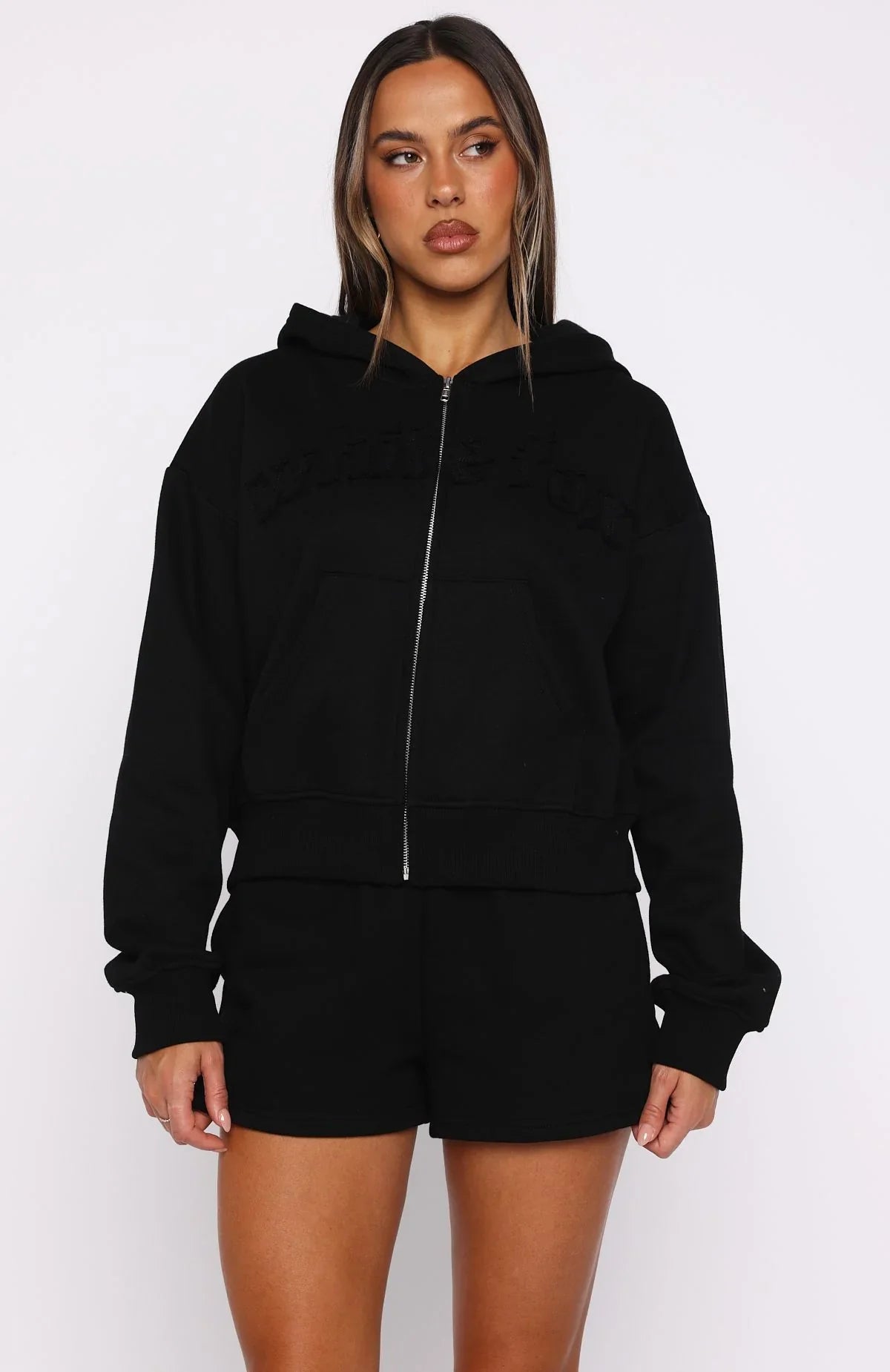 Sundays just got a whole lot cooler and cosier! From The Archives Lexi Boxy Zip Front Hoodie Black is designed with a relaxed hood, slouched shoulders and ribbed hems which round out an boxy silhouette. Featuring long sleeves, front zipper closure, a roomy front pocket, and an unlined fleece interior, this hoodie delivers a cozy feel. White Fox distressed text embellishes the front. Style with the matching From The Archives Lexi Sweatpants Black.
