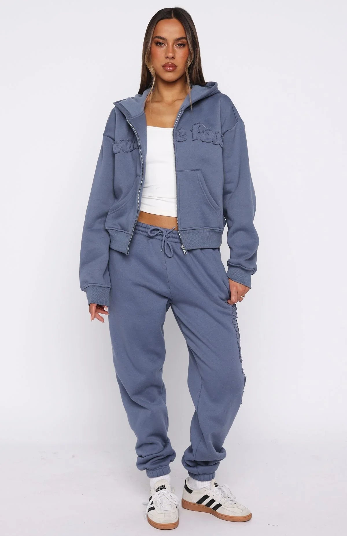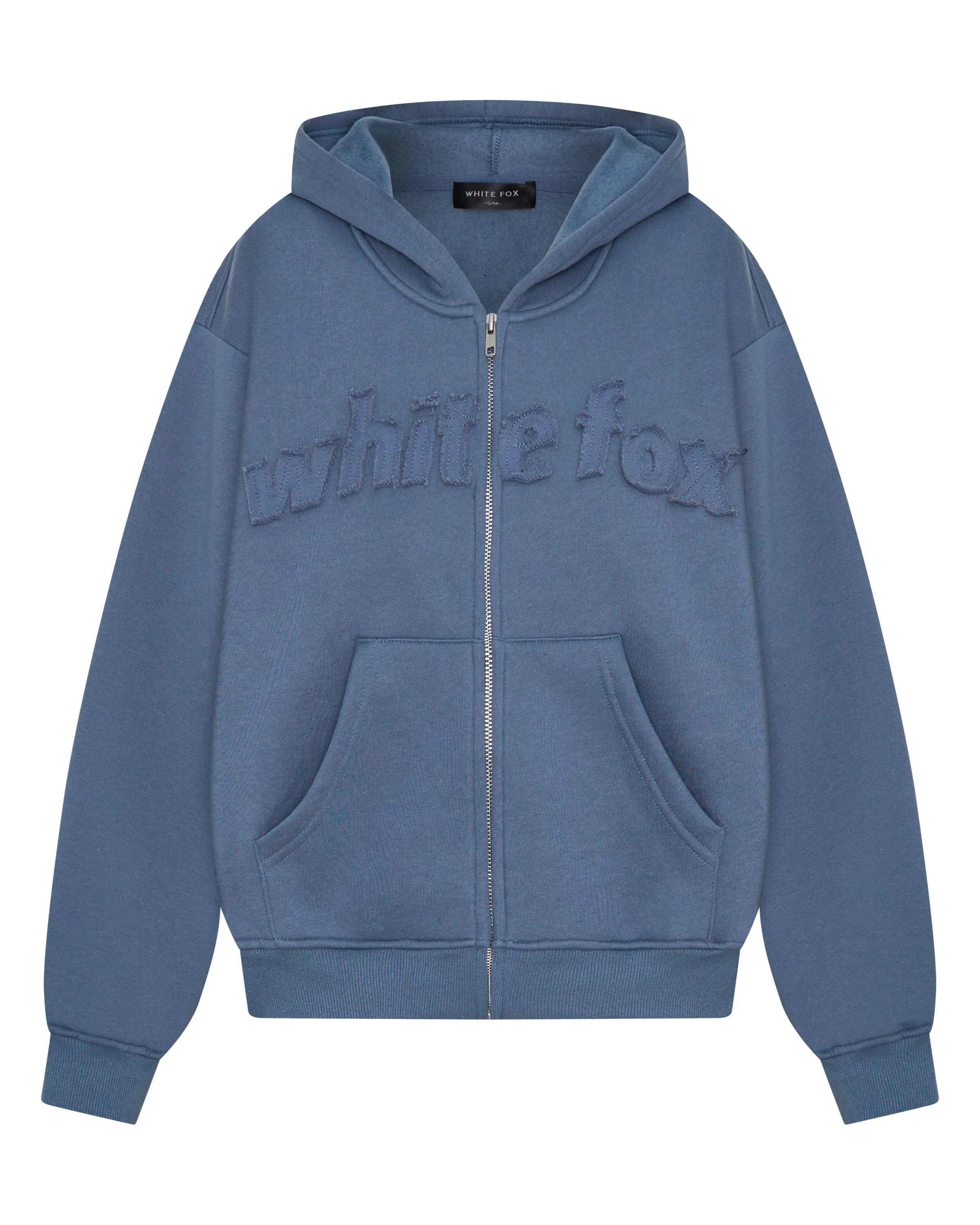 Sundays just got a whole lot cooler and cosier! From The Archives Lexi Boxy Zip Front Hoodie Ocean is designed with a relaxed hood, slouched shoulders and ribbed hems which round out an boxy silhouette. Featuring long sleeves, front zipper closure, a roomy front pocket, and an unlined fleece interior, this hoodie delivers a cozy feel. White Fox distressed text embellishes the front. Style with the matching From The Archives Lexi Sweatpants Ocean.