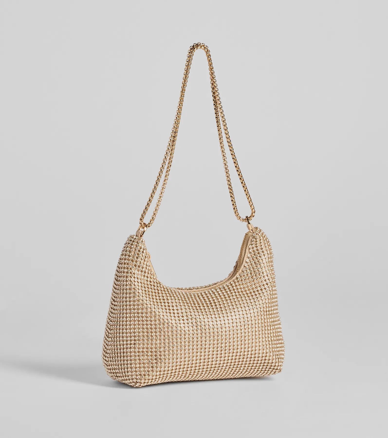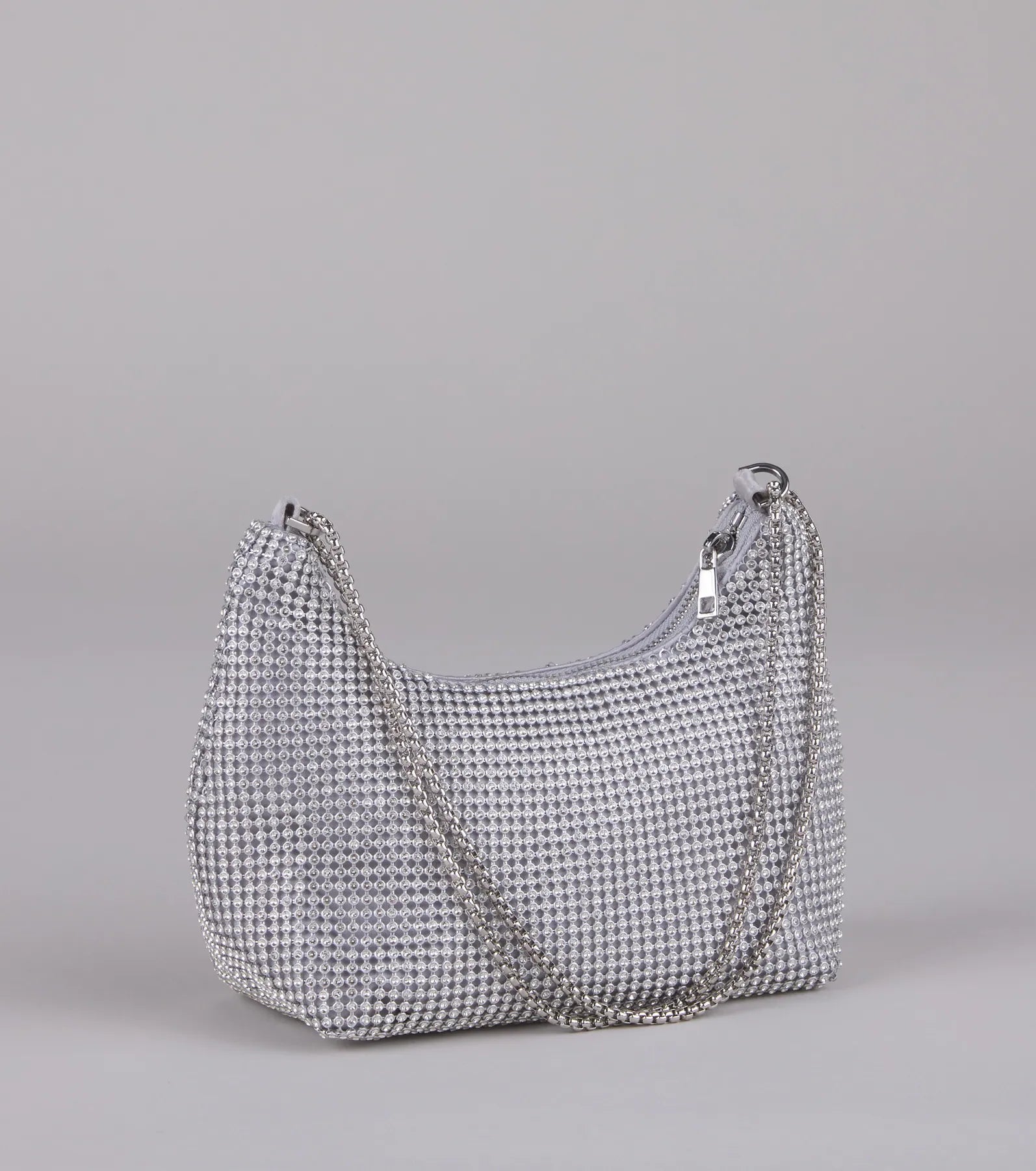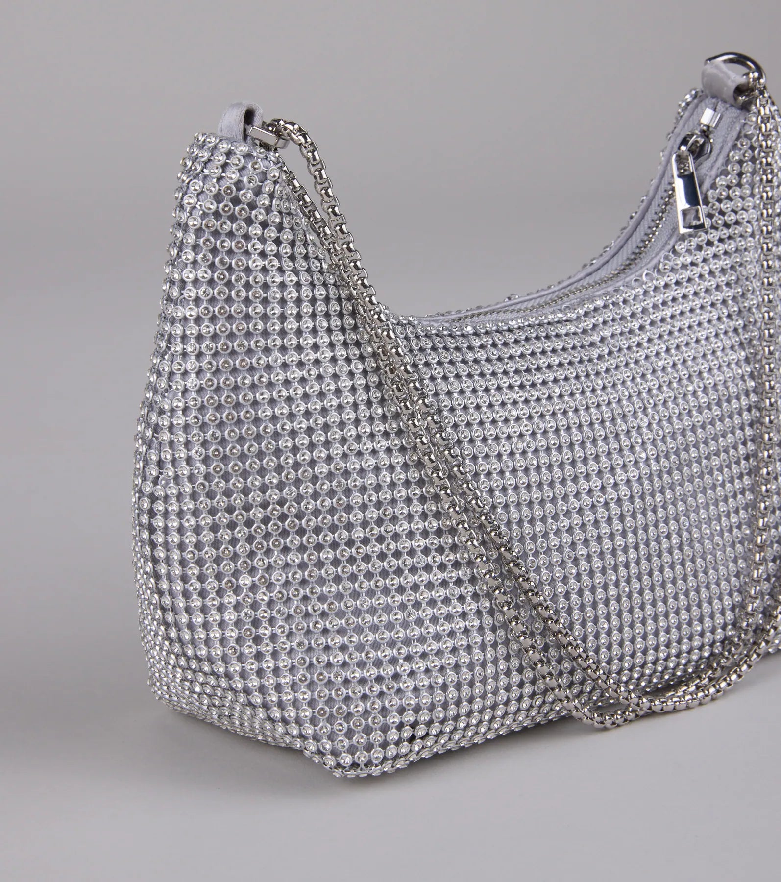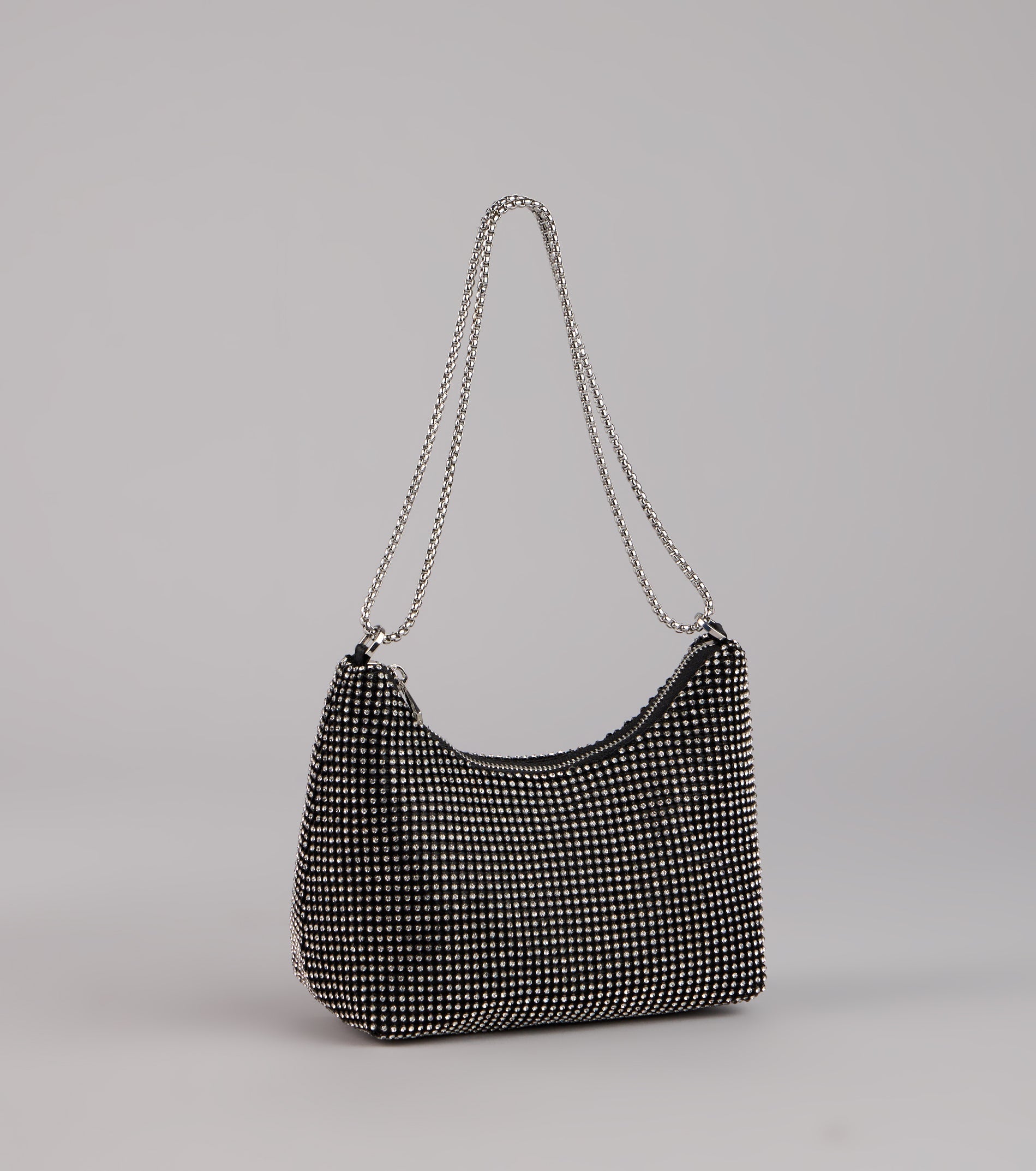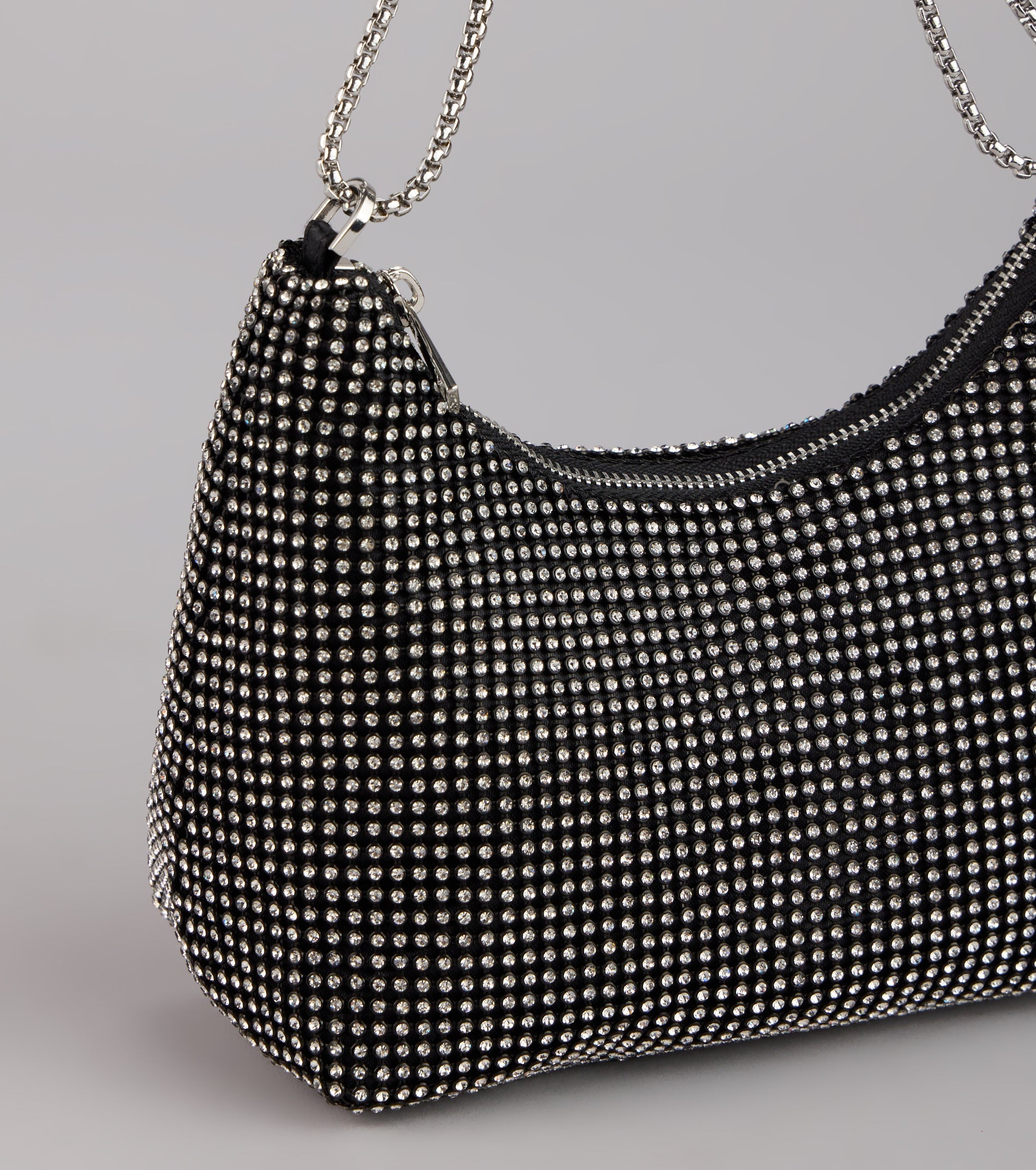 A glam rhinestone mesh shoulder bag for all the girlies out there! This exclusive bag offers a sparkling design, a convenient chain strap, and a spacious interior for your essentials. Pair with a satin dress.