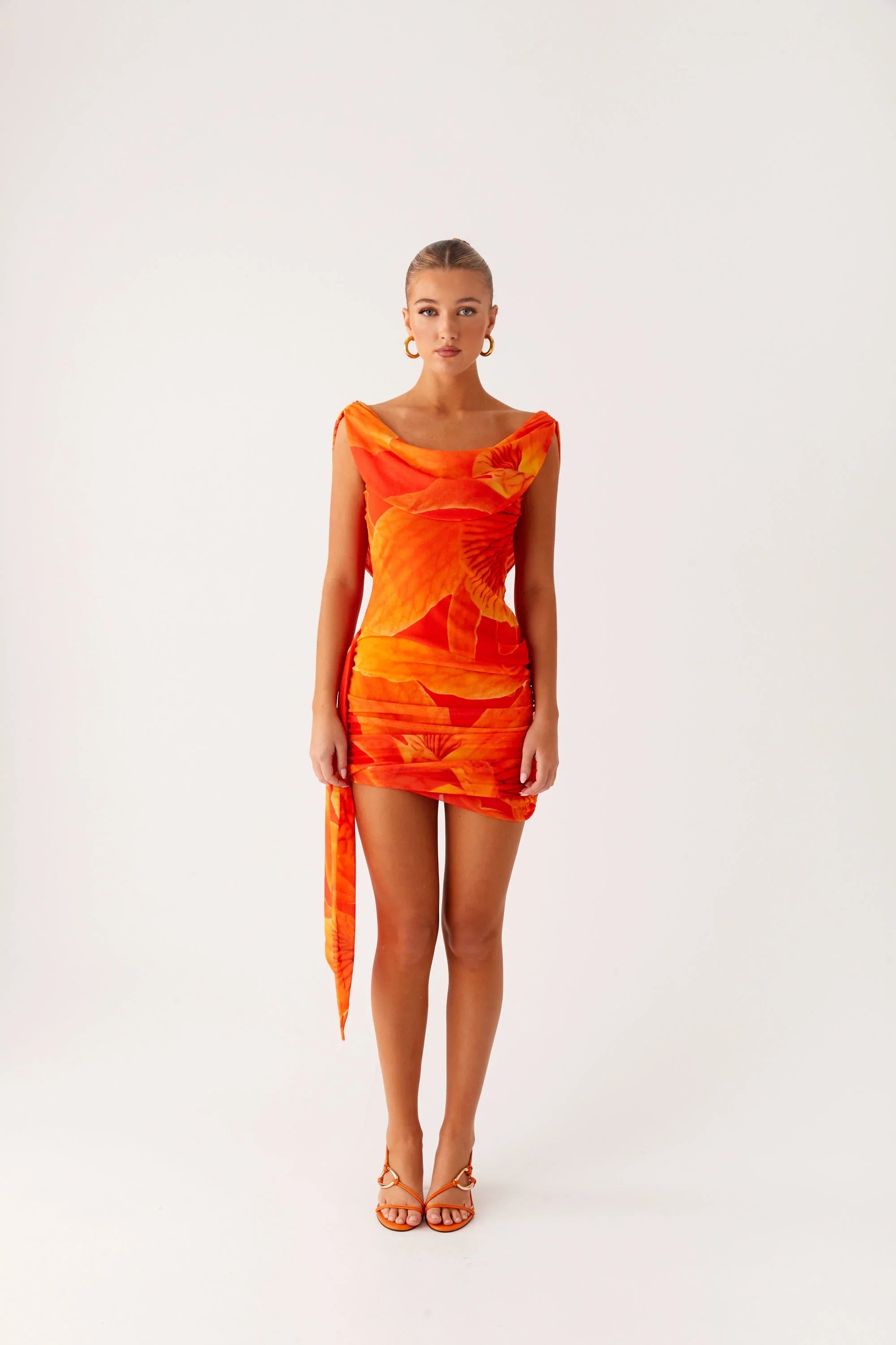 Designed for nights that start with cocktails and end with sunrise. The Good Fortune Mini Dress features an off-shoulder neckline and figure-hugging stretch mesh in a bold orange hue—made for turning heads from sunset to sundown.