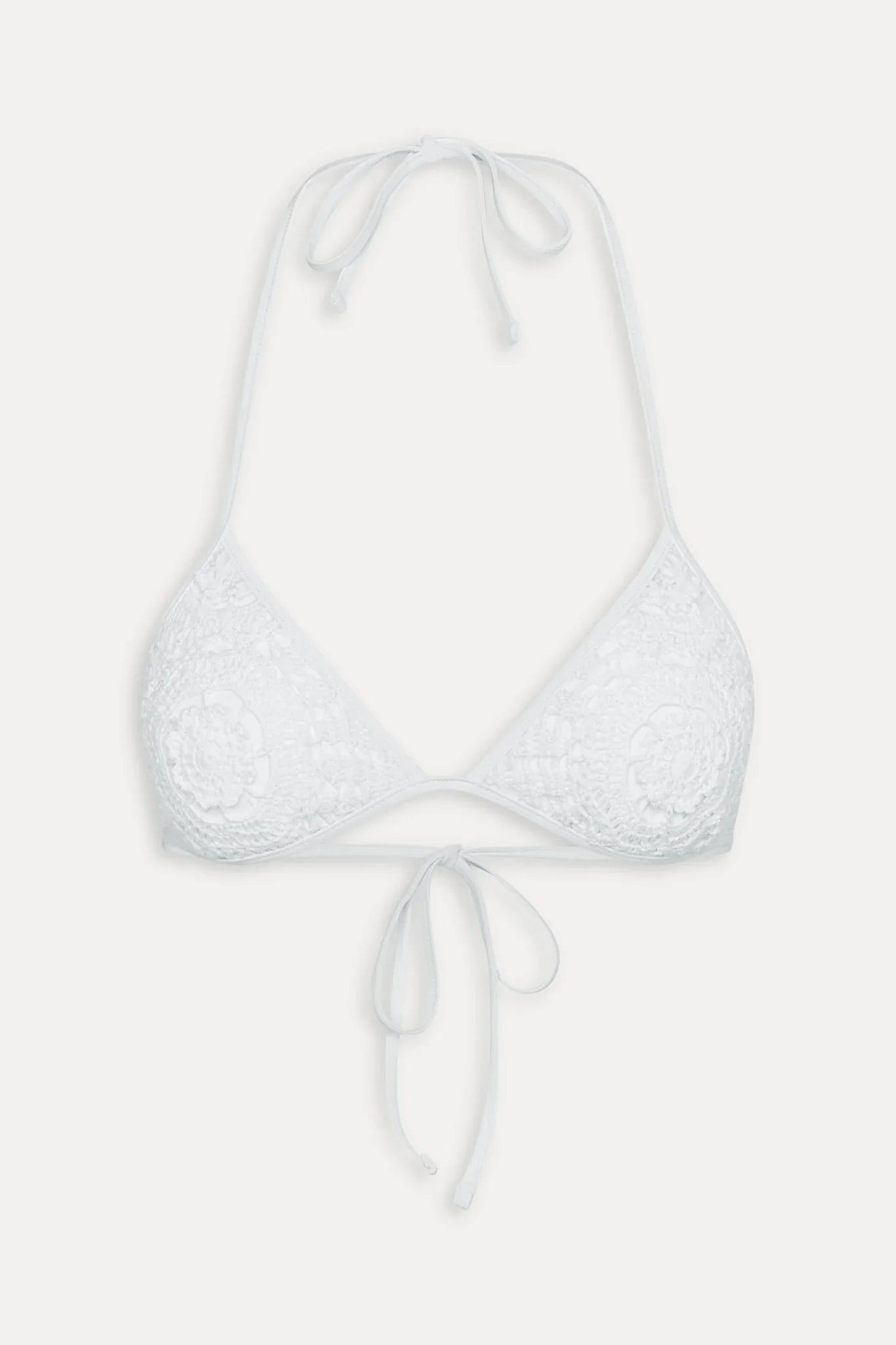 This halter bikini top is crafted with a custom crochet design and lined in our signature soft swim fabric. The Hudson triangle bikini top features string ties that wrap around the neck and back for adjustable comfort.