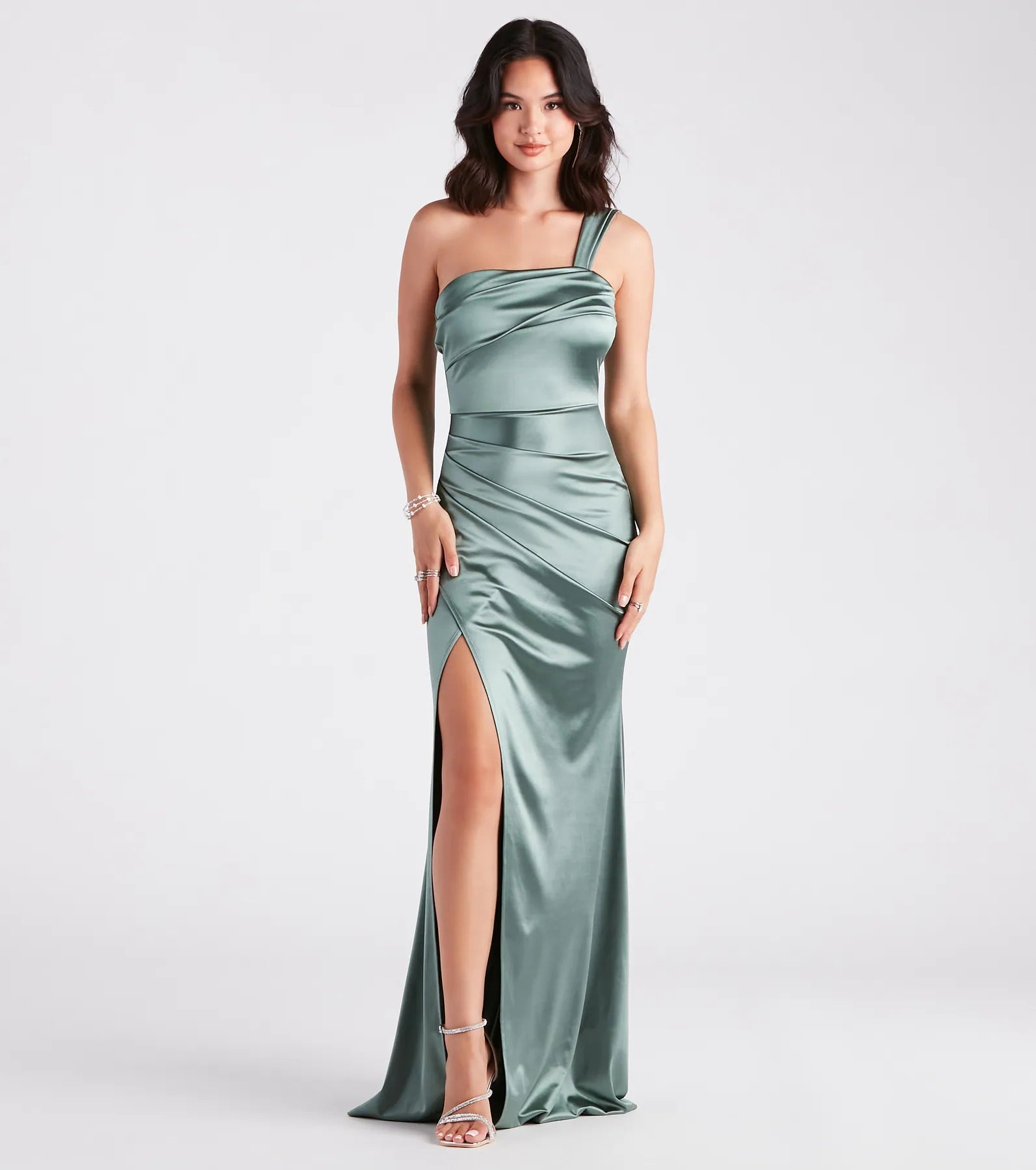 Sleek and sultry, the Kathie formal satin dress is destined to shine at banquets, galas, and black-tie weddings! She features a sophisticated one-shoulder neckline, a wide shoulder strap, a pleated side seam, a mermaid silhouette, and an asymmetrical high front slit along her graceful long hem. The formal dress is composed of luxurious satin-lined fabric with a sheen effect and minimal stretch. Complete the look with