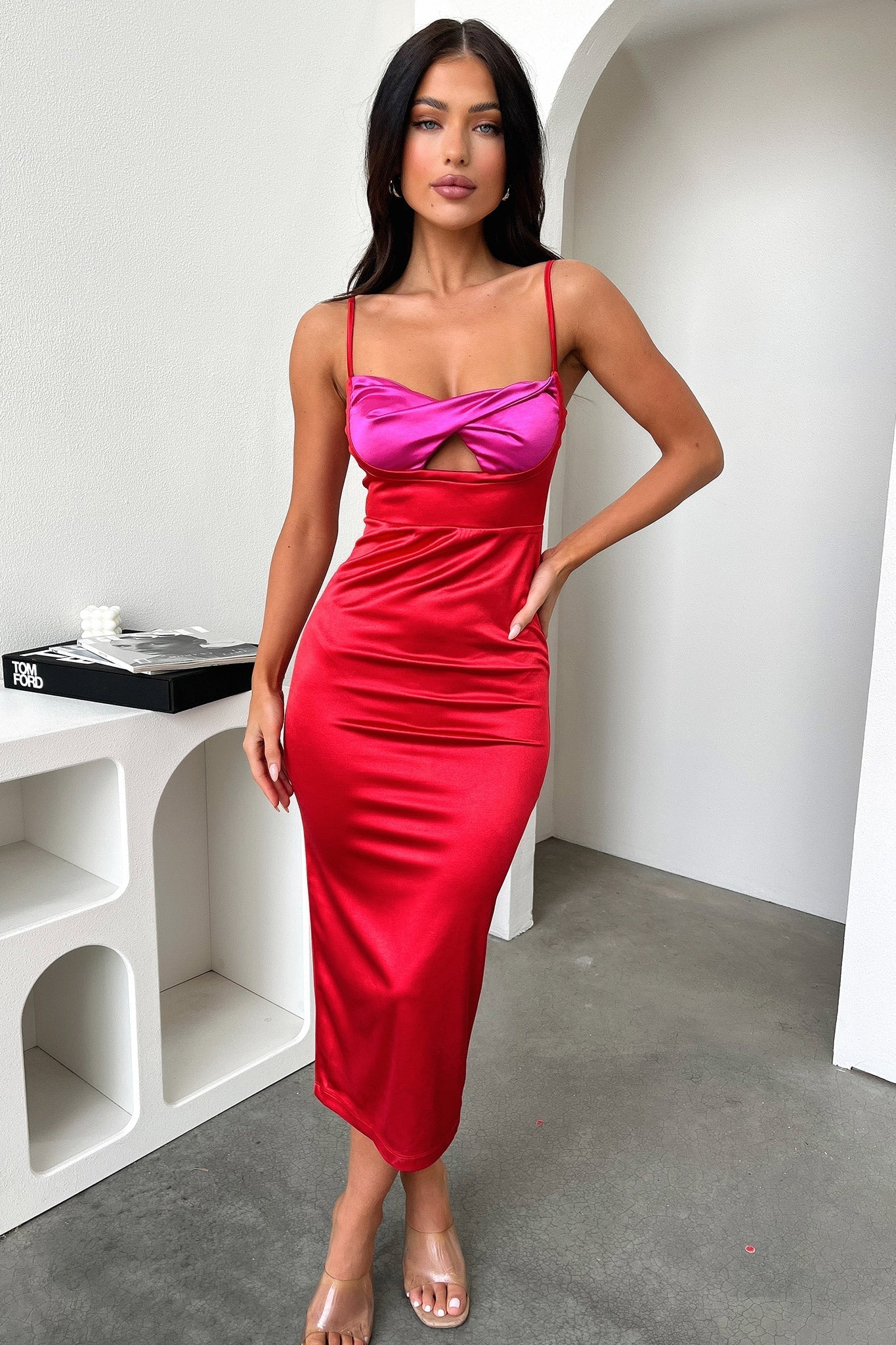 Classy with a hint of sass! The Krista Midi offers a satin like material, A pencil bodycon fit, a contrast coloured design bust area with a cut out detail, thin adjustable straps and a little slit down the back. Style this doll with nude heels and a bold red lip for an out there look.