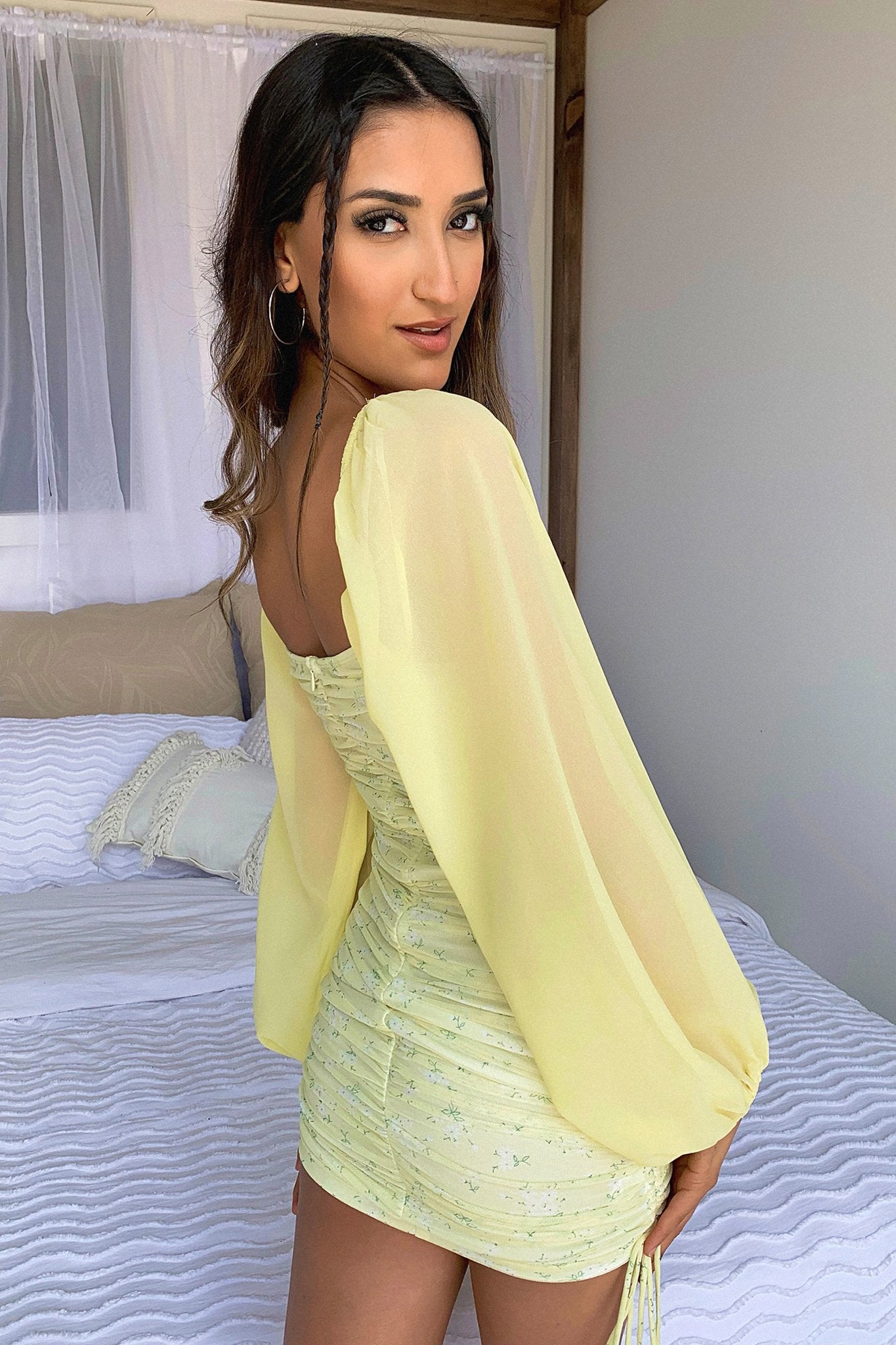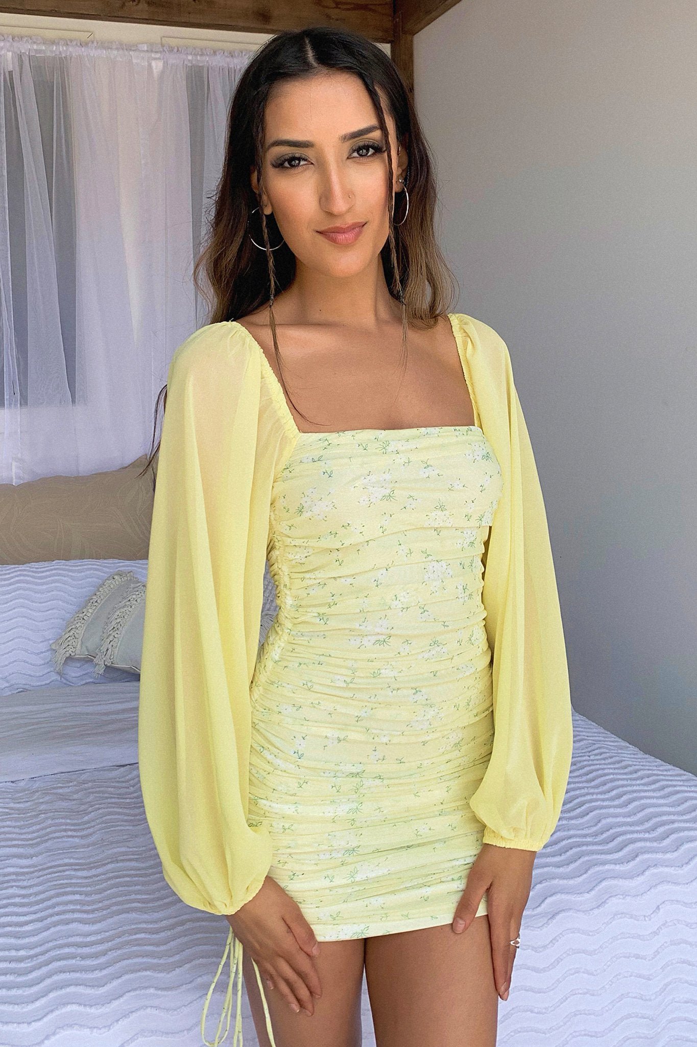 Stand out in the crowd in the Lorde Dress in Yellow Floral. This babe features an all over ruched fabrication with tie up detail on each side of the dress, off the shoulder, sheer long long sleeves and is completed with invisible back zipper. She looks amazing when paired with your go to nude heels and gold jewellery.