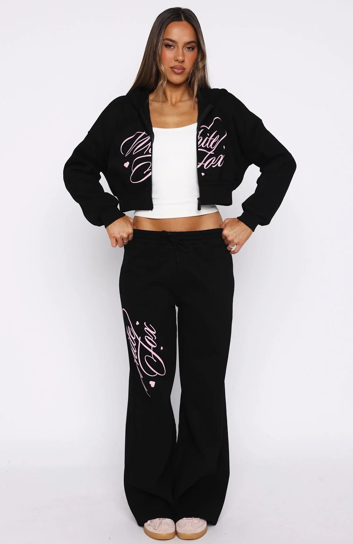 Cozy up in style with this dreamy duo. The Love You Regardless Cropped Zip Front Hoodie Black is designed with a relaxed hood, slouched shoulders, cropped length and ribbed hems which round out an boxy silhouette. Featuring long sleeves, front zipper closure, a roomy front pocket, and an unlined fleece interior, this hoodie delivers a cozy feel. White Fox cursive puff‑print text embellishes the front. Style with the matching Love You Regardless Wide Leg Sweatpants Black.