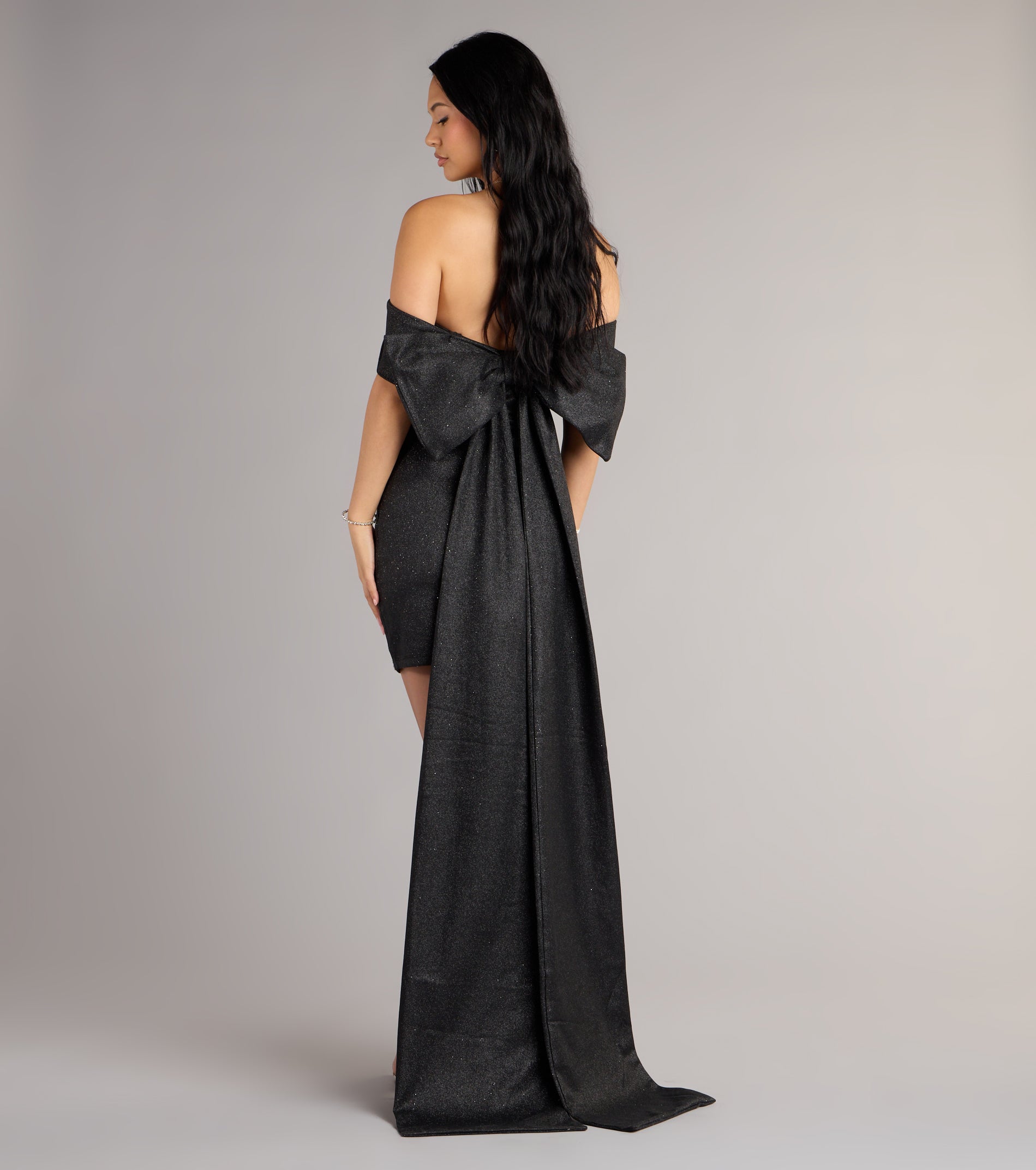 Made to turn every entrance into a moment, the Lucinda glitter bodycon mini captivates with its off-the-shoulder neckline and dramatic back bow with a sweeping train. A striking balance of polish and play, it’s the definition of unforgettable.