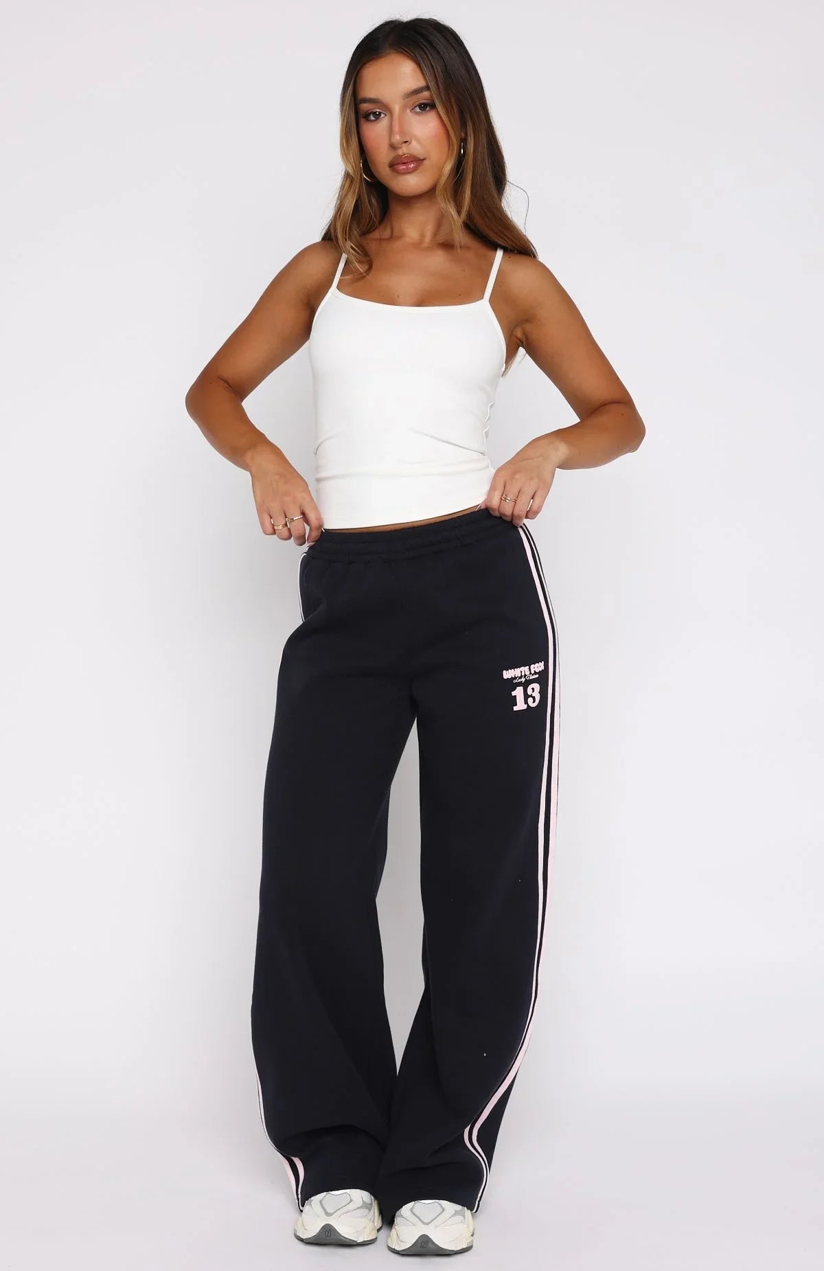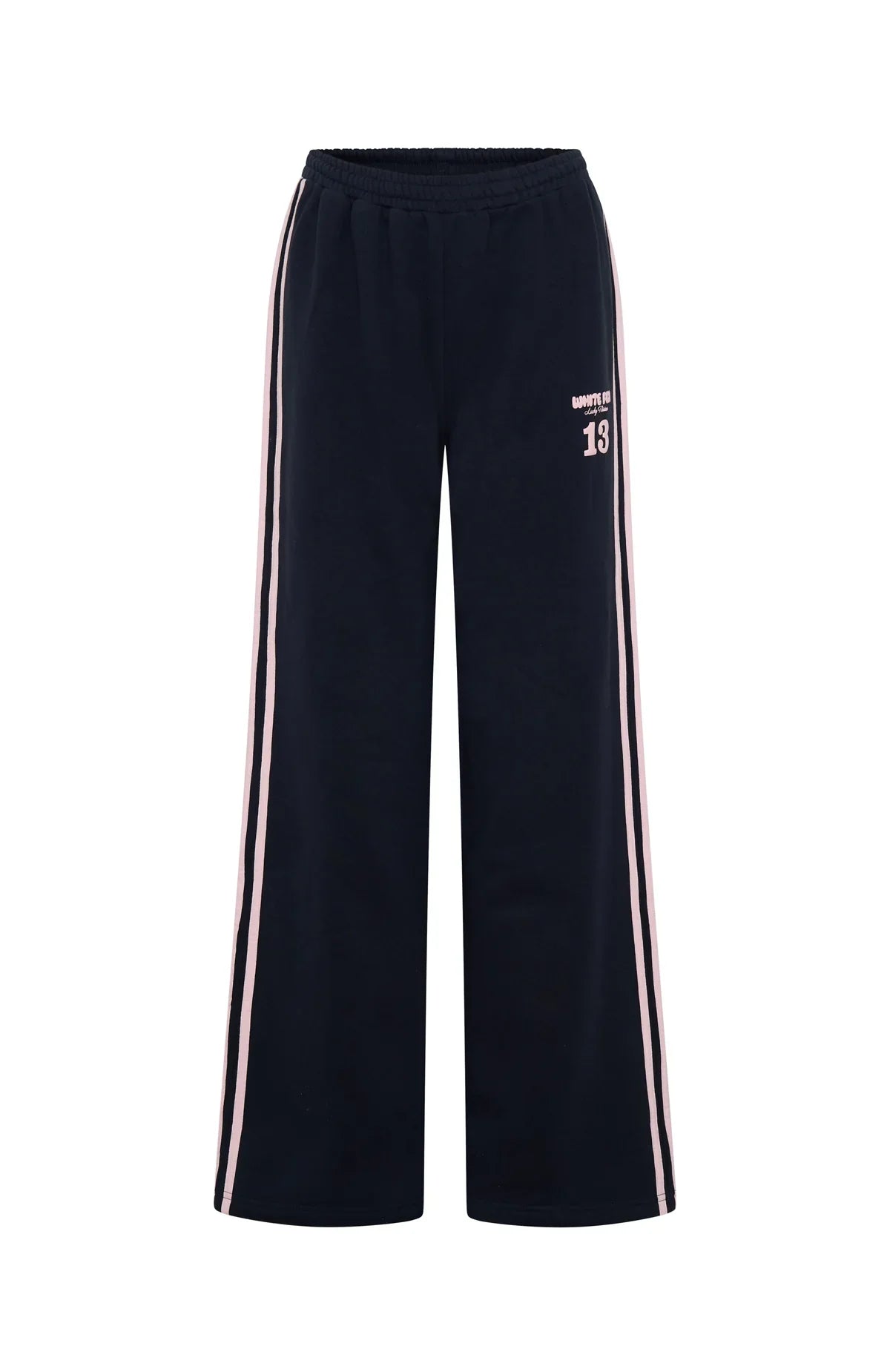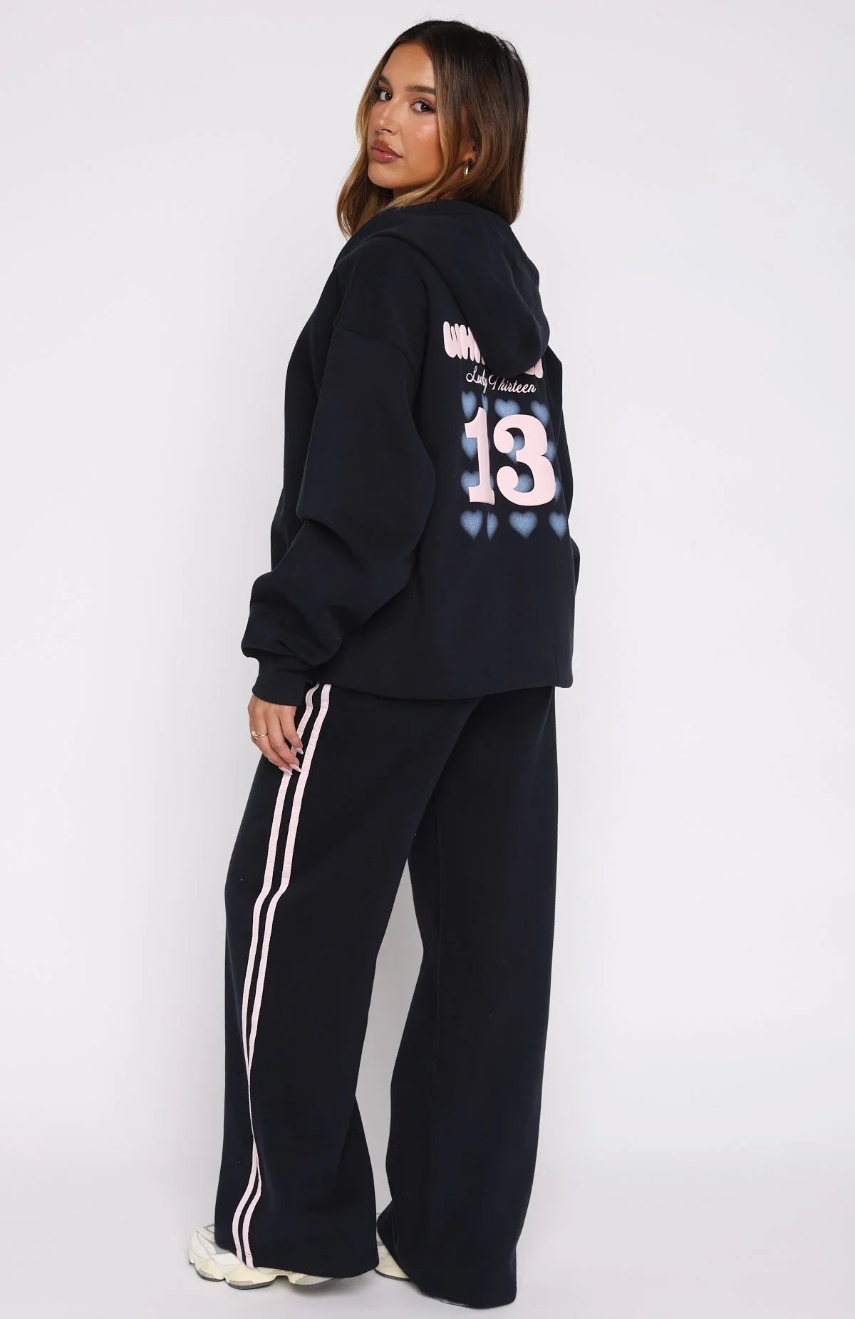 Lounge szn incoming! Introducing the Lucky Thirteen Charise Wide Leg Sweatpants Navy. Designed with a thick elasticated waistband, internal drawstring tie, and a wide-leg silhouette featuring double strip detailing. The White Fox puff-print text at the side adds a signature touch, while the unlined fleece interior ensures a cozy feel. Complete the look by pairing with the Lucky Thirteen Charise Zip Front Hoodie.
