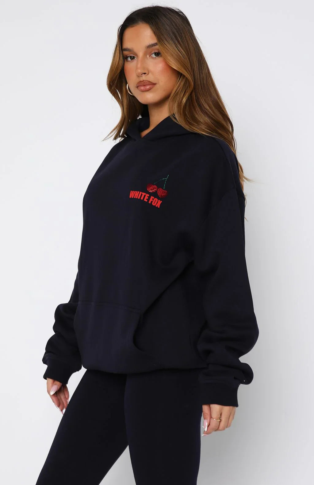 Stay snug without sacrificing style. The Made With Love Oversized Hoodie Navy features an oversized fit with a hooded design, drop shoulders, soft fleece lining for extra comfort, front side and centre back print/diamanté logo design and ribbed cuffs and hem. For a matching moment, pair with the Made With Love Flare Pants!
