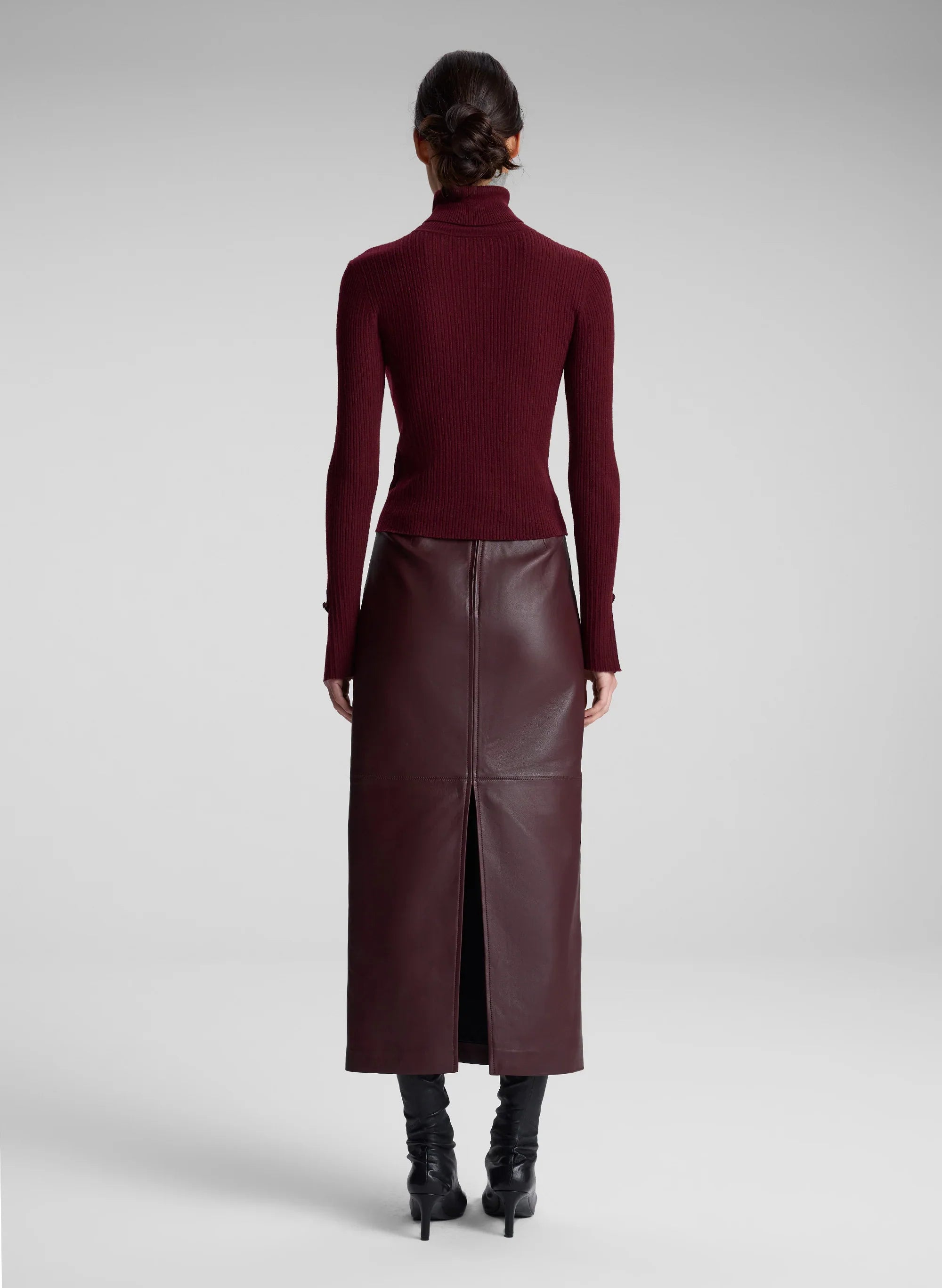 The Marta Skirt is crafted from 100% soft lamb leather in an umber hue. This long midi silhouette falls straight from hip to hem and features both a slit and zip closure in the back. Shop Bottoms.