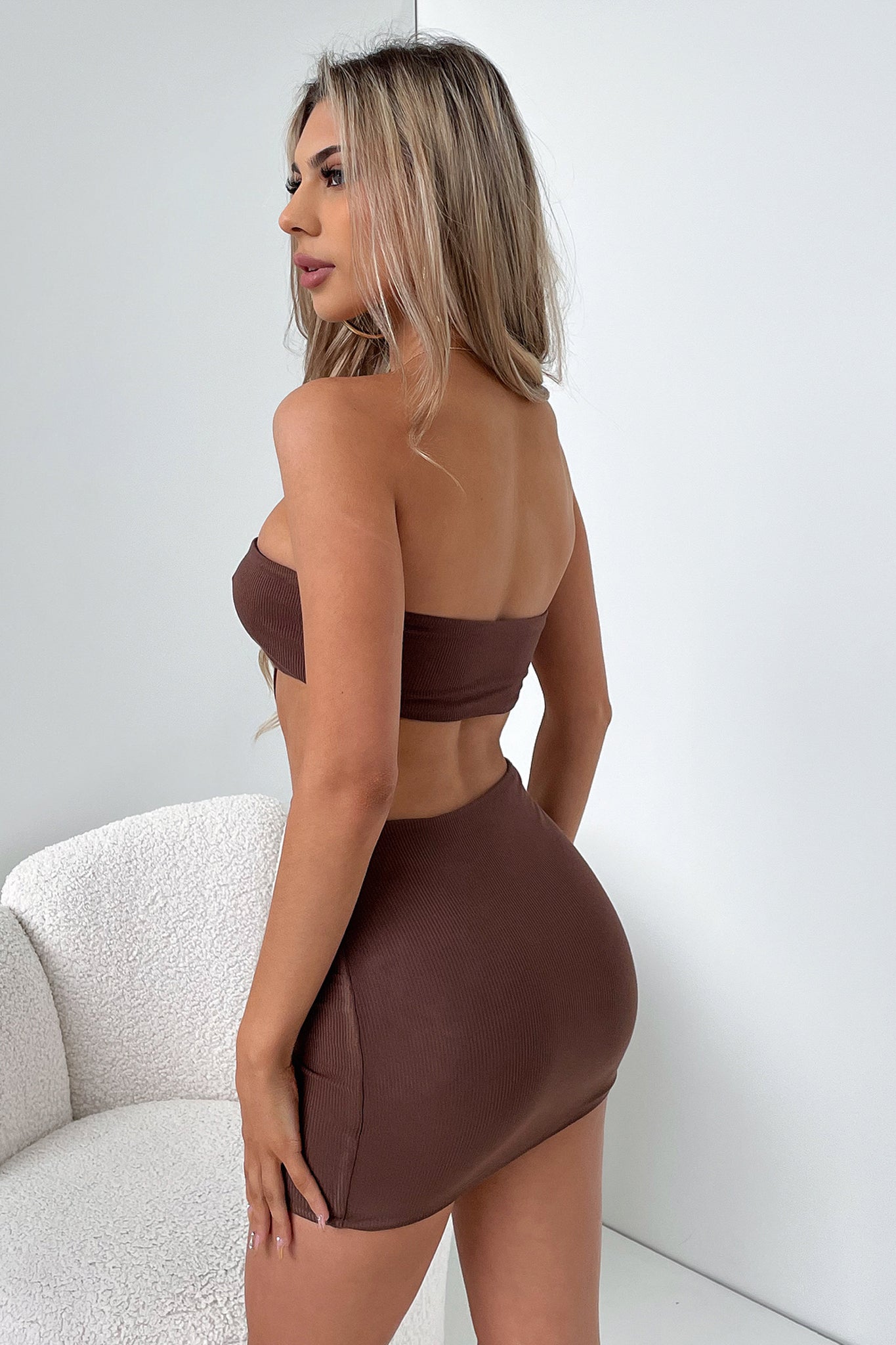 The dress of your dreams! Our Mehr Mini offers a bodycon fit, strapless cut, ribbed material with double lining, a cut out design across the waist with an O-ring detail and a backless cut. Style her with nude heels and gold accessories for a hot look.