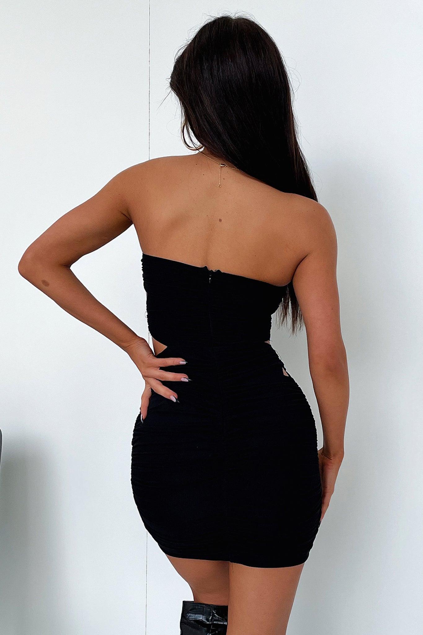 Snatched in all the right places! The Miexica Dress features a bodycon fit with cut out detailing down the sides, double lined material with a mesh top layer, a strapless neckline and an invisible back zipper. Style this baddie with black boots anda some hoops for a night out