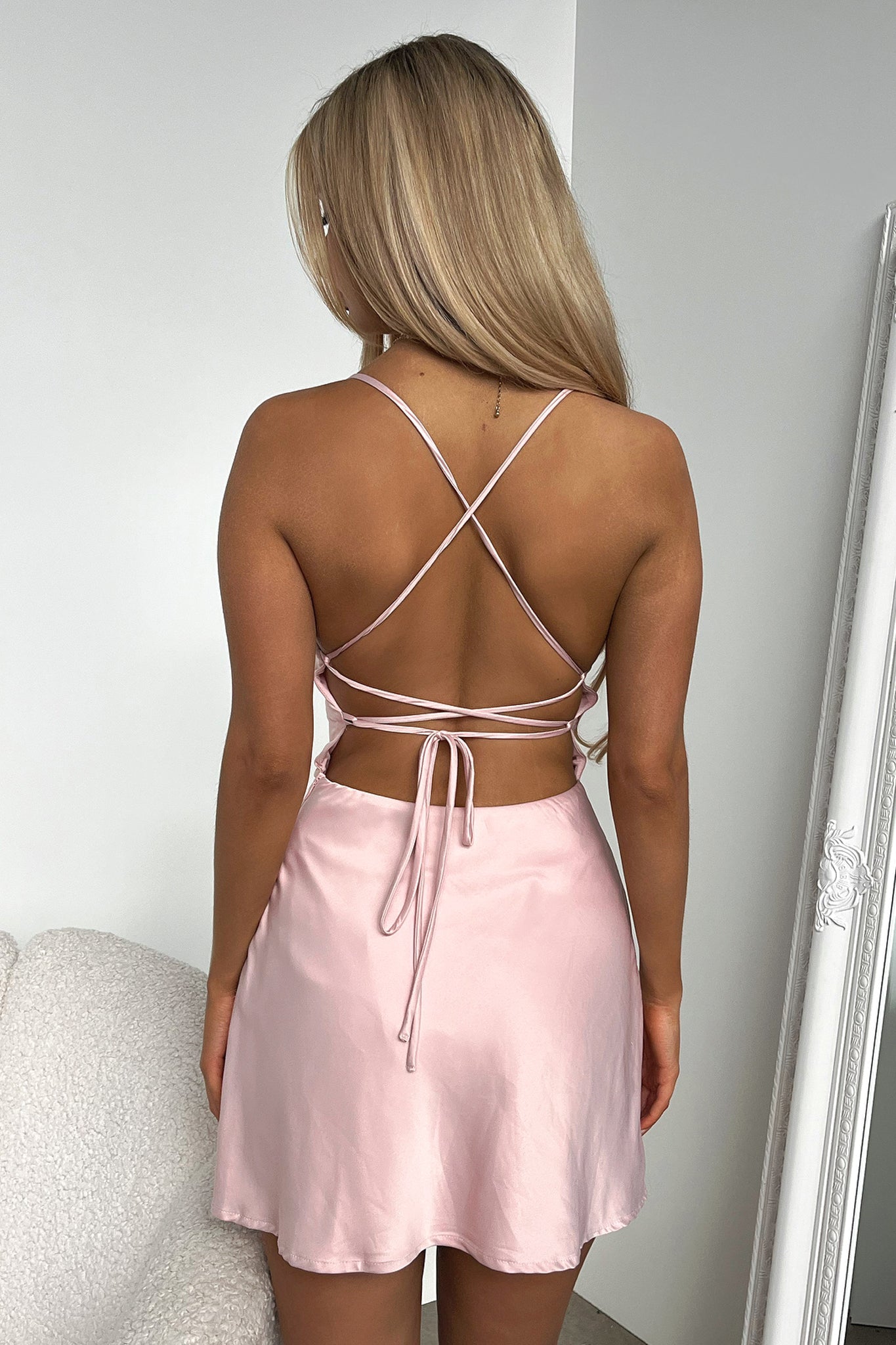 Can't get enough of sexy little satin dresses this season. The Olivia Dress in Blush is made from a soft satin fabric with a cowl neckline, thin straps that continue with the tie up detail on the shoulder and back, invisible side zipper with relaxed fit bottom skirt. Pair her with minimal jewellery and heels for a sexy look you can wear on repeat.