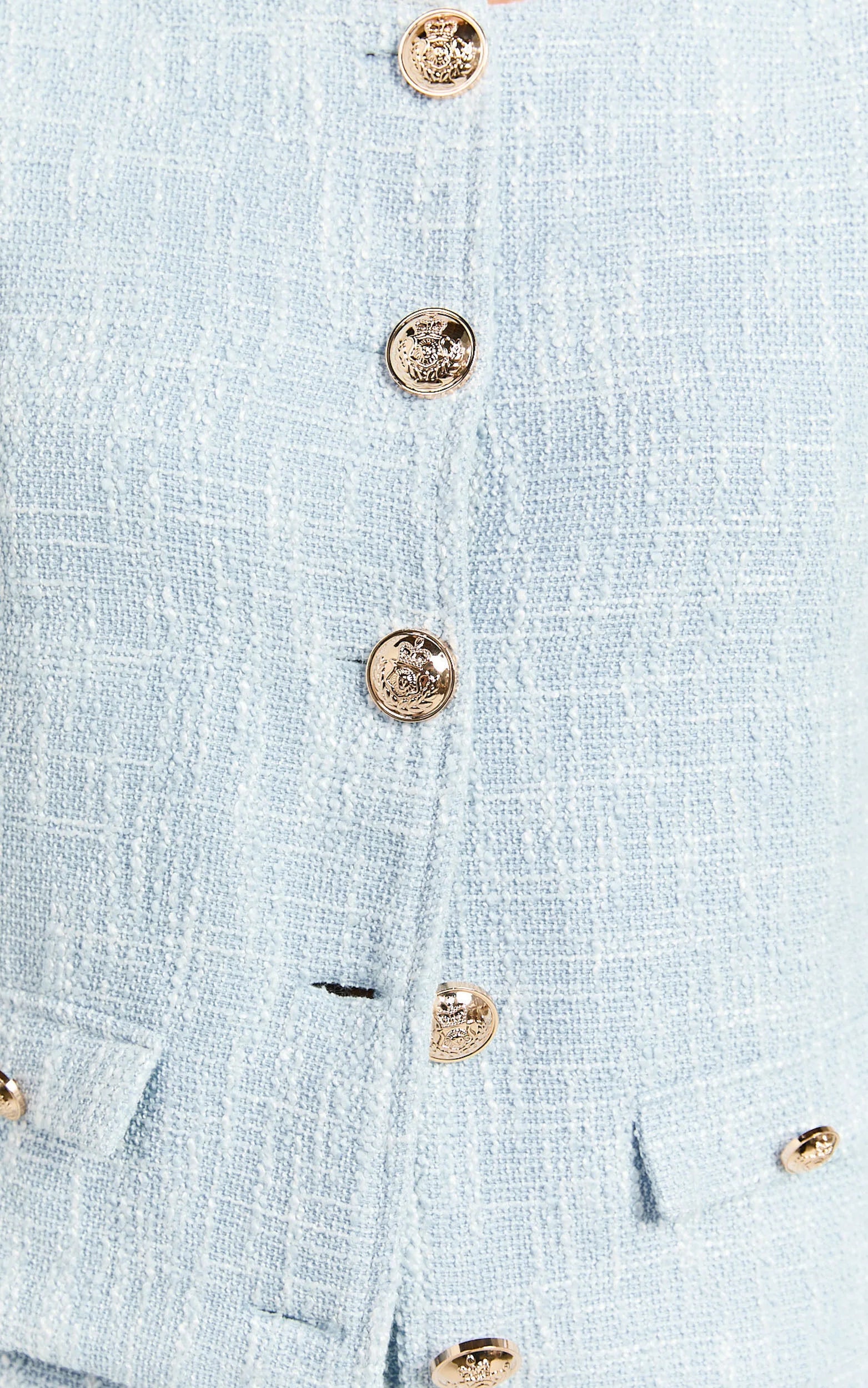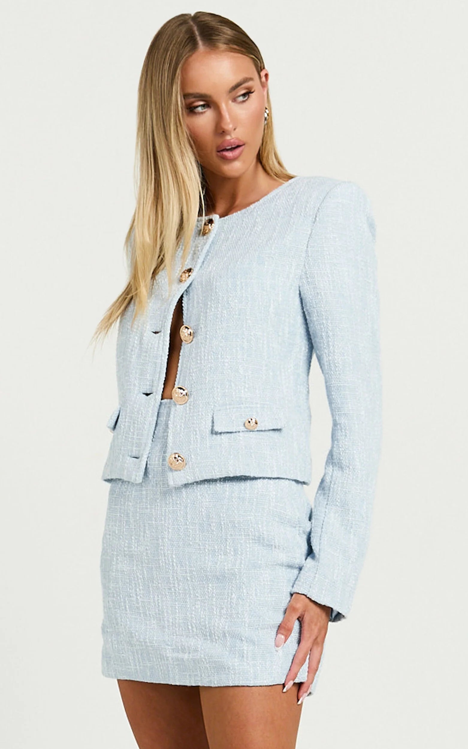 Elevate your wardrobe with the Olympia Jacket, a masterpiece of casual elegance intertwined with trendsetting design. This boucle scoop neck button-down jacket, rendered in a serene pale blue, is a flawless blend of comfort and sophistication, making it a must-have for any fashion-forward enthusiast.Product Details:Inner LiningButtons DetailBoucle FabricLong SleeveCasual UseStandard LengthPolyester MaterialSize and FitSize S / 8 length: 49cm / 19.29inMaterial and CareMain Fabric: 100% Polyester Lining: 100% PolyesterLow Stretch