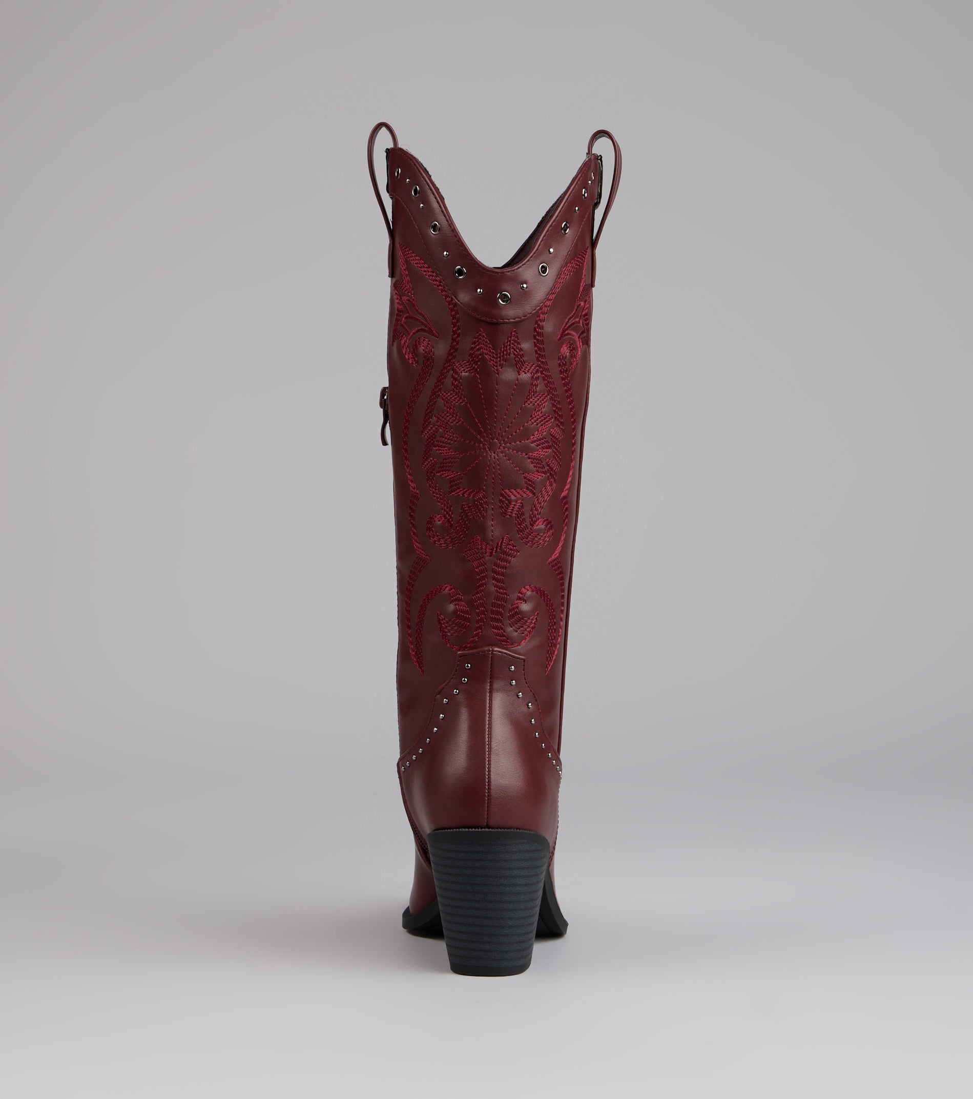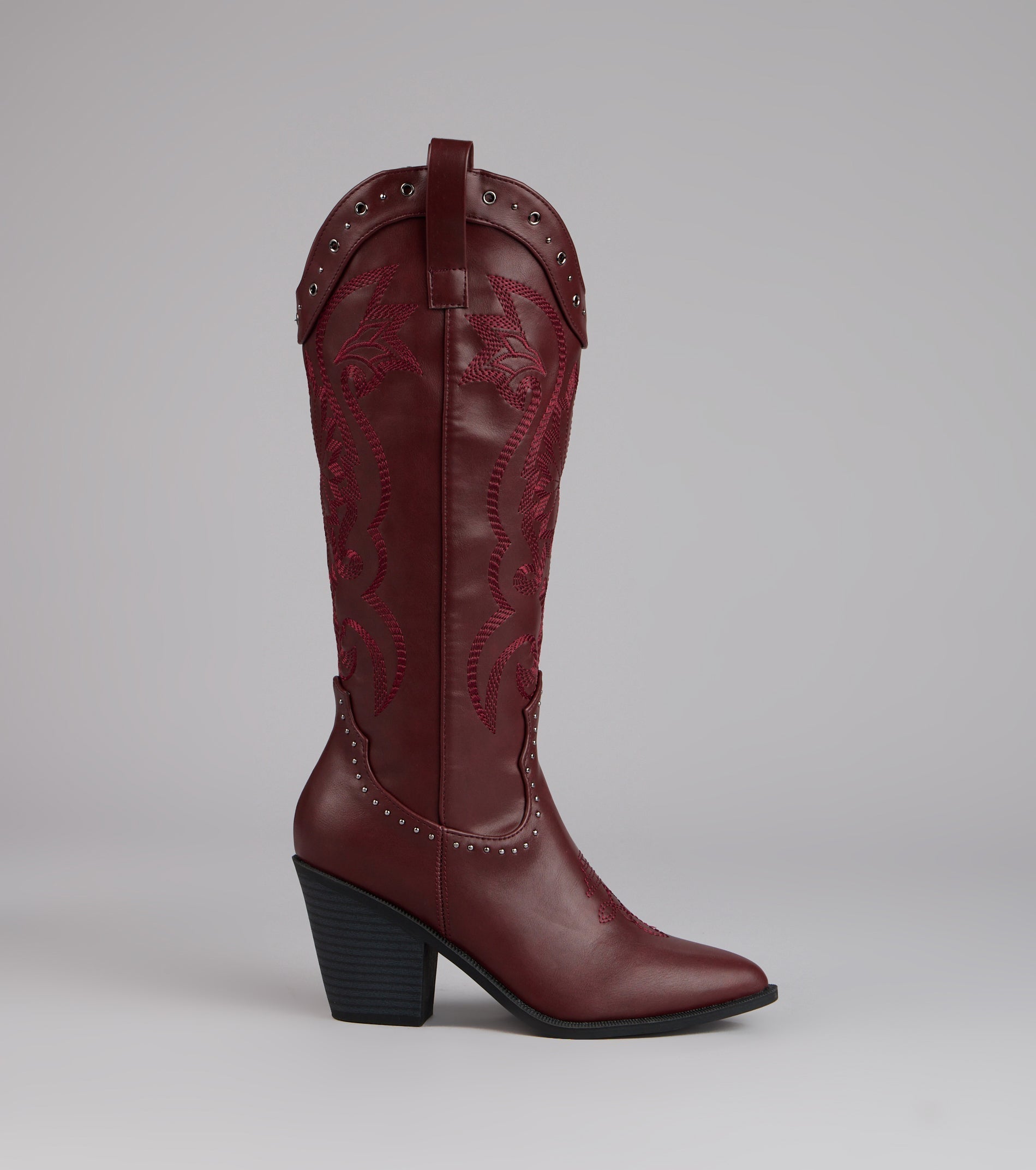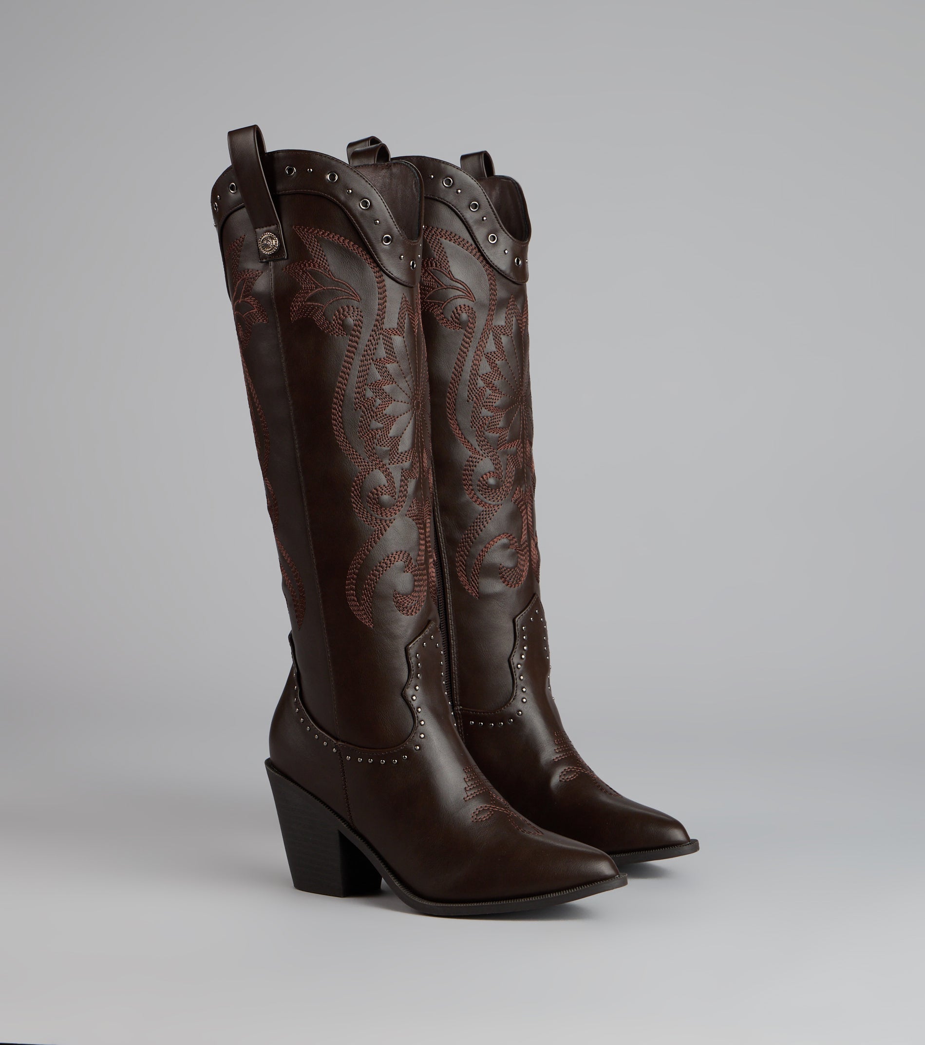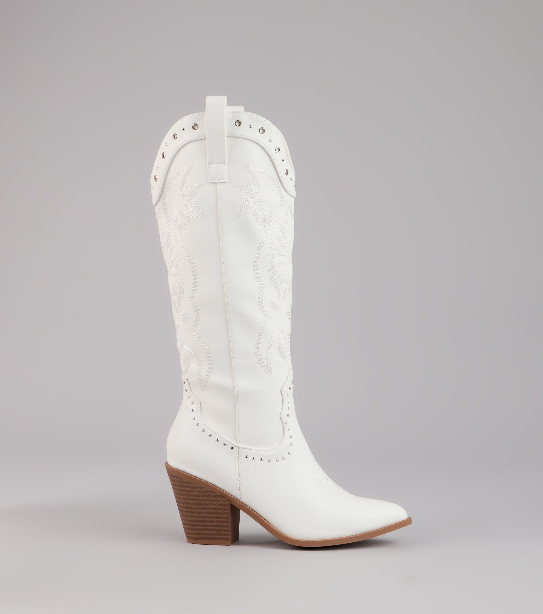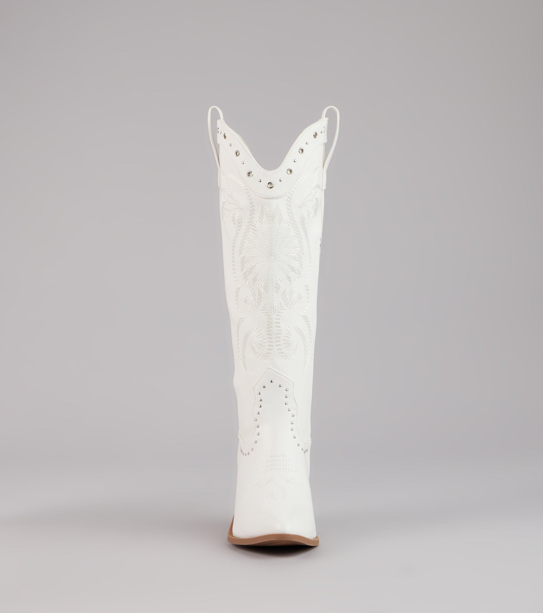 Western, but make it glam. These faux leather cowboy boots mix classic embroidery with studded detailing and a sleek pointed toe—perfect for bachelorettes, country concerts, or costume parties.