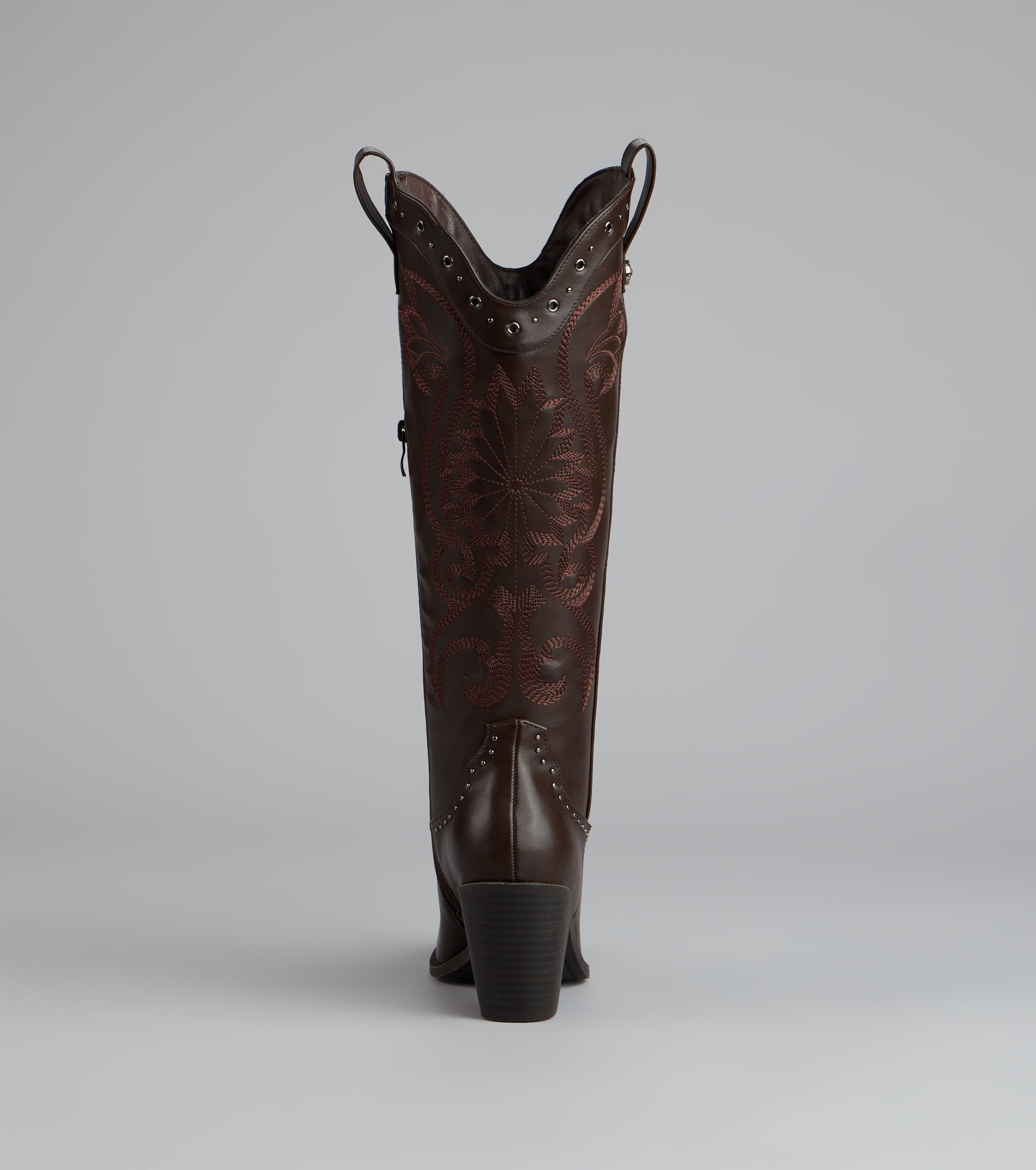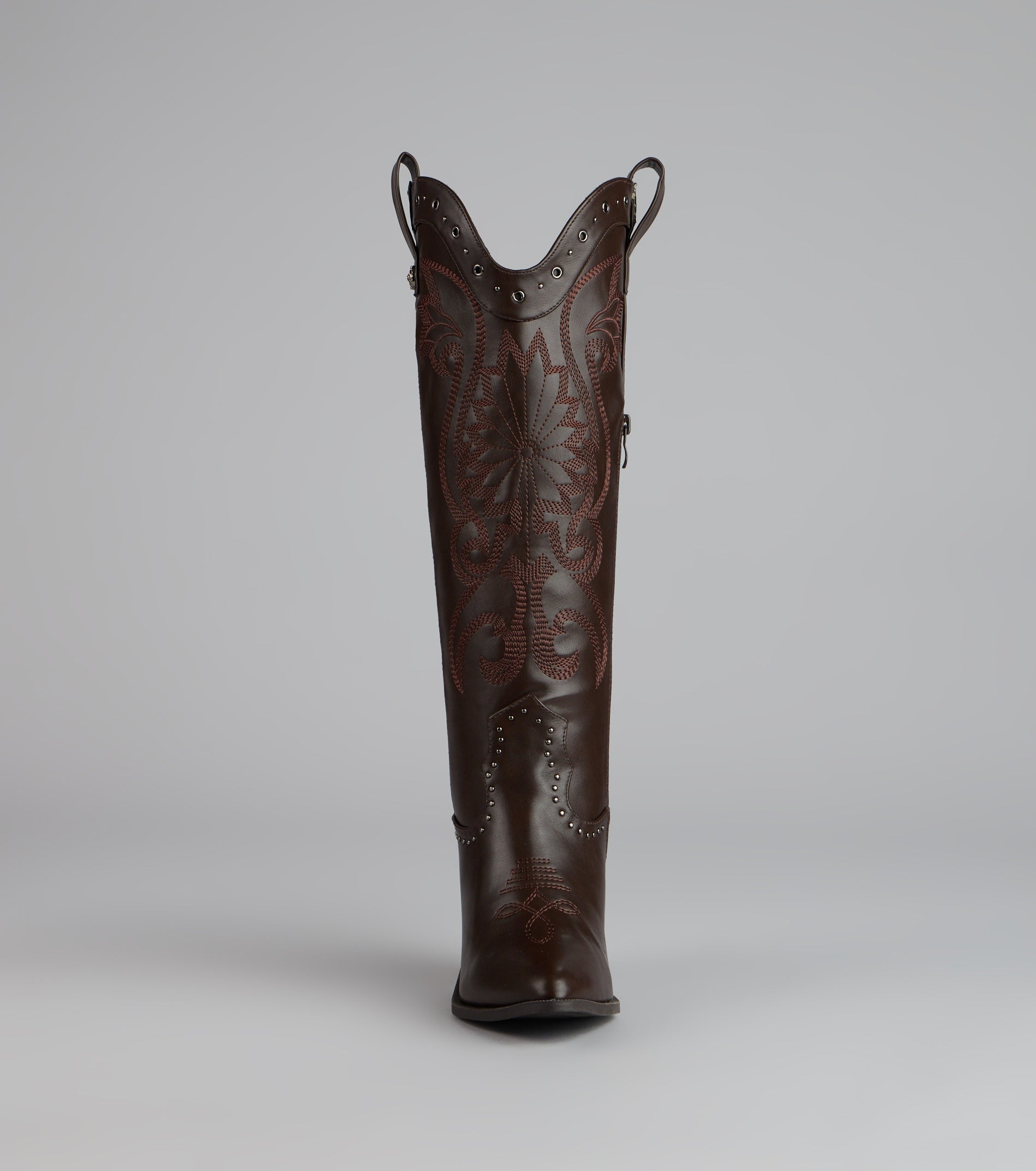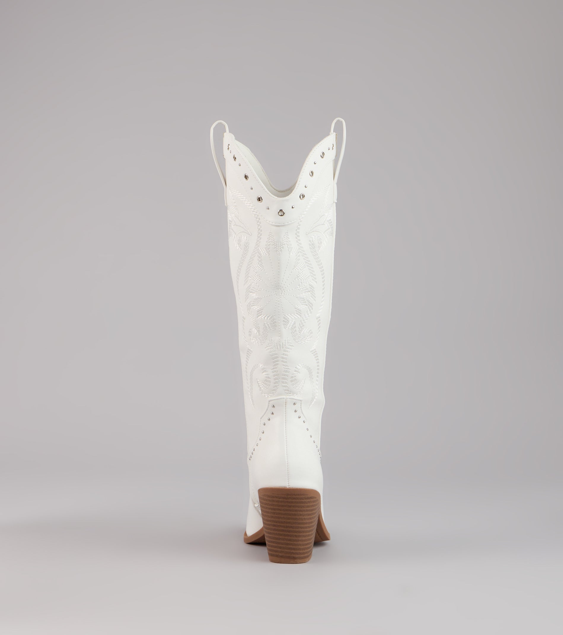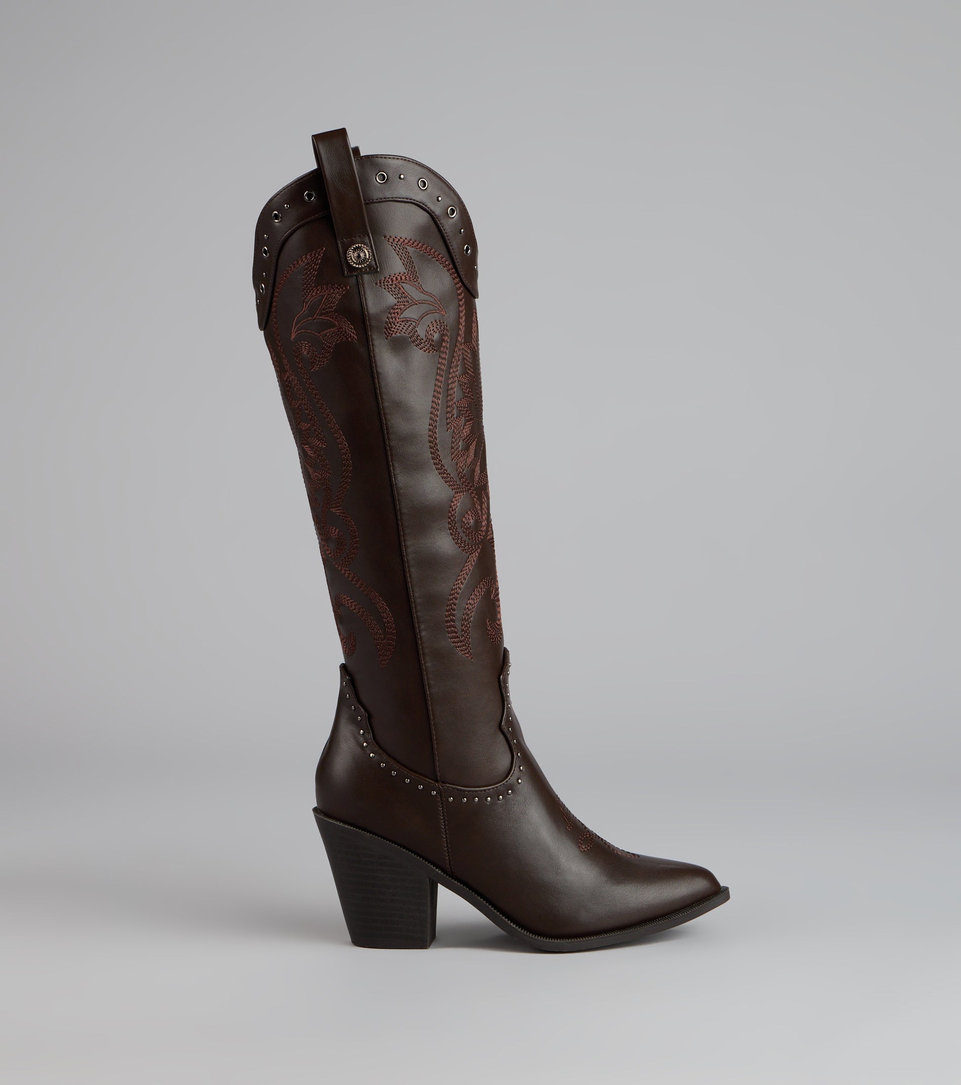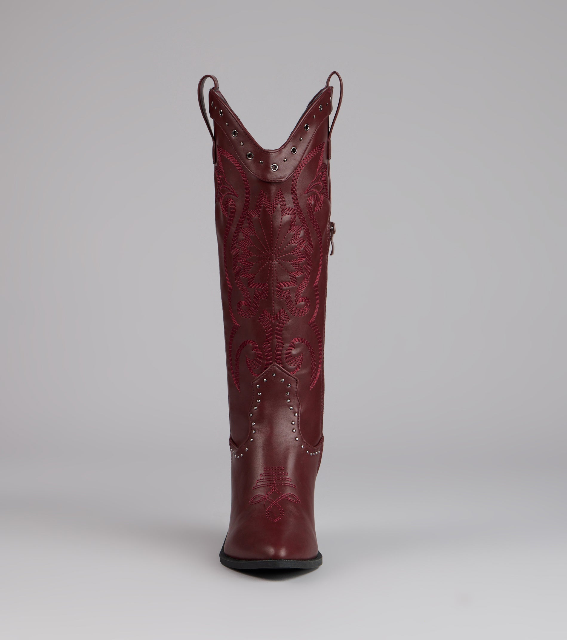 Western, but make it glam. These faux leather cowboy boots mix classic embroidery with studded detailing and a sleek pointed toe—perfect for bachelorettes, country concerts, or costume parties.