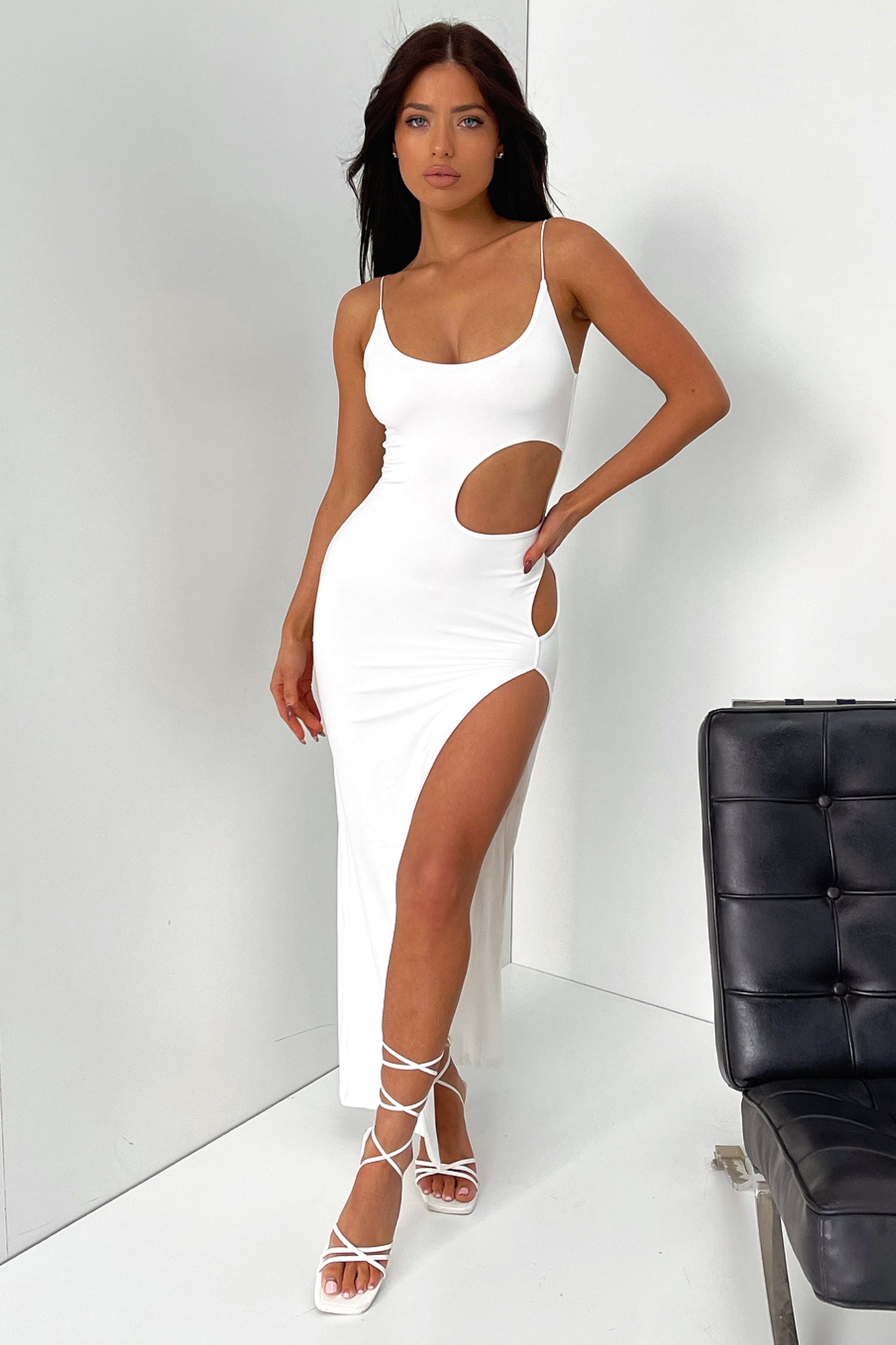 Angel energy in the Rossa Maxi Dress! She offers a body hugging fit, cheeky thigh high slit, a round neckline, thin spaghetti straps, double lining and cut out details. Style her for a cocktail evening paired with nude stilettos and dainty gold jewellery.