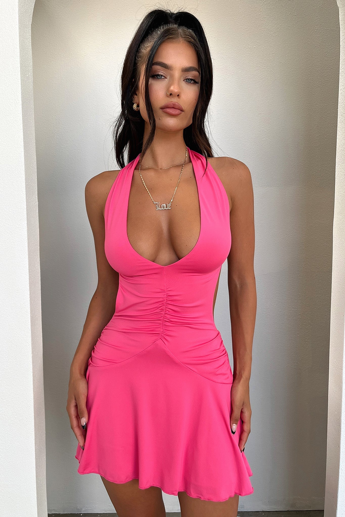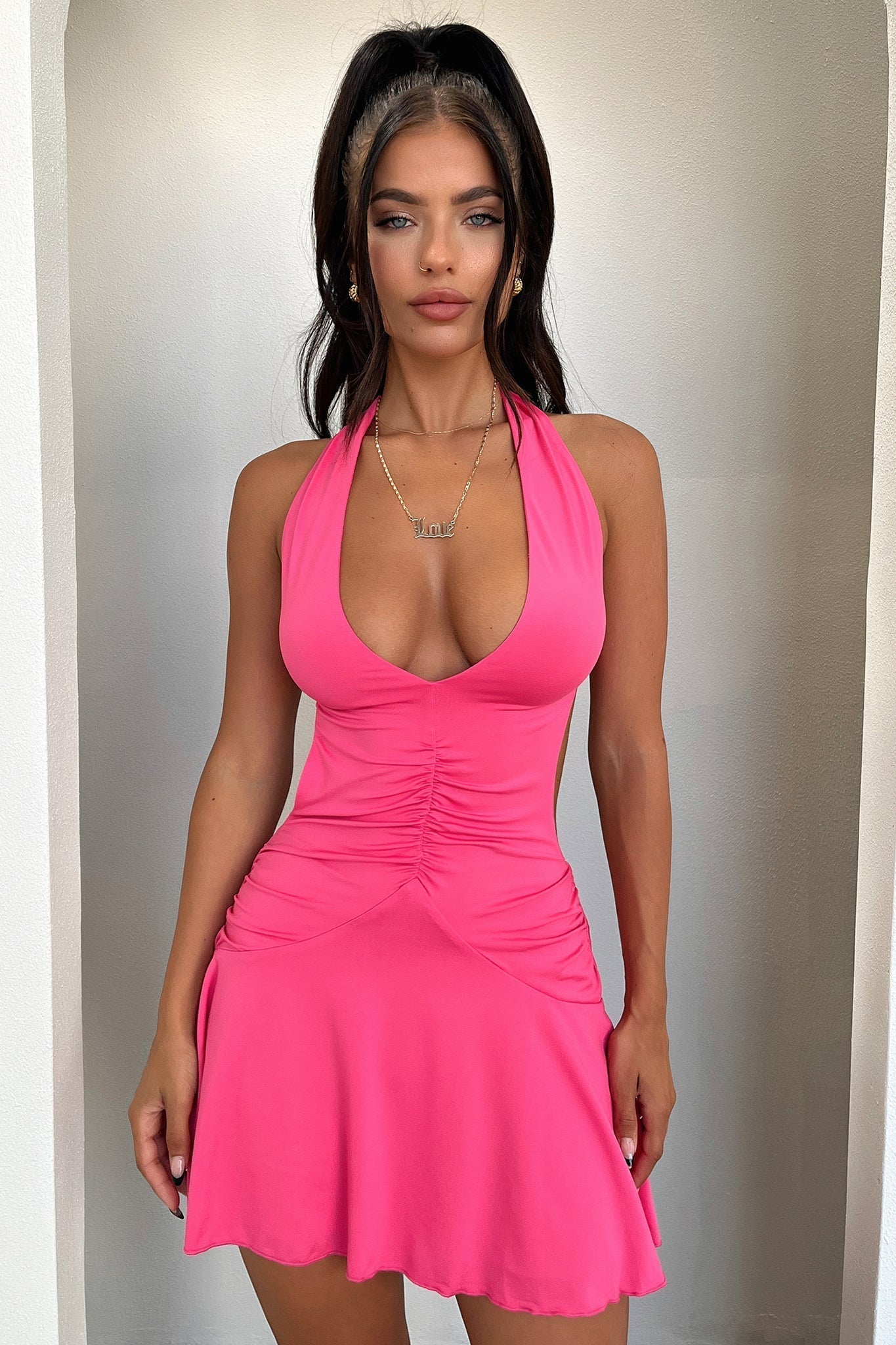 She's one to stand out in the crowd! The Sarisa Dress offers a flowy fit skirt, halter neck with tie up straps, double lining, a backless cut and double lining. Match her with Black Strappy heels and silver jewellery.