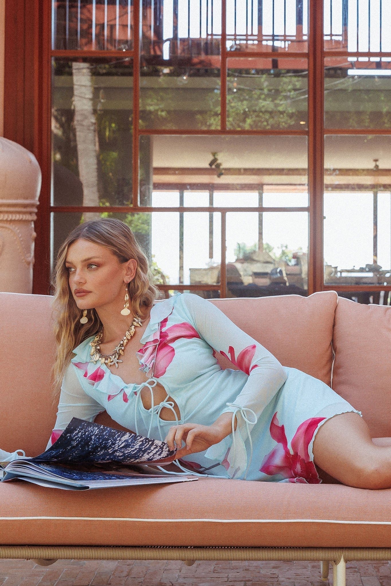 Turn heads in our hot Sea Dreaming mini dress. Featuring a pretty ruffle trim and ties in the bust. It's perfect for sunset happy hour, teamed with wedges and a tote for a look that will make them stop and stare.