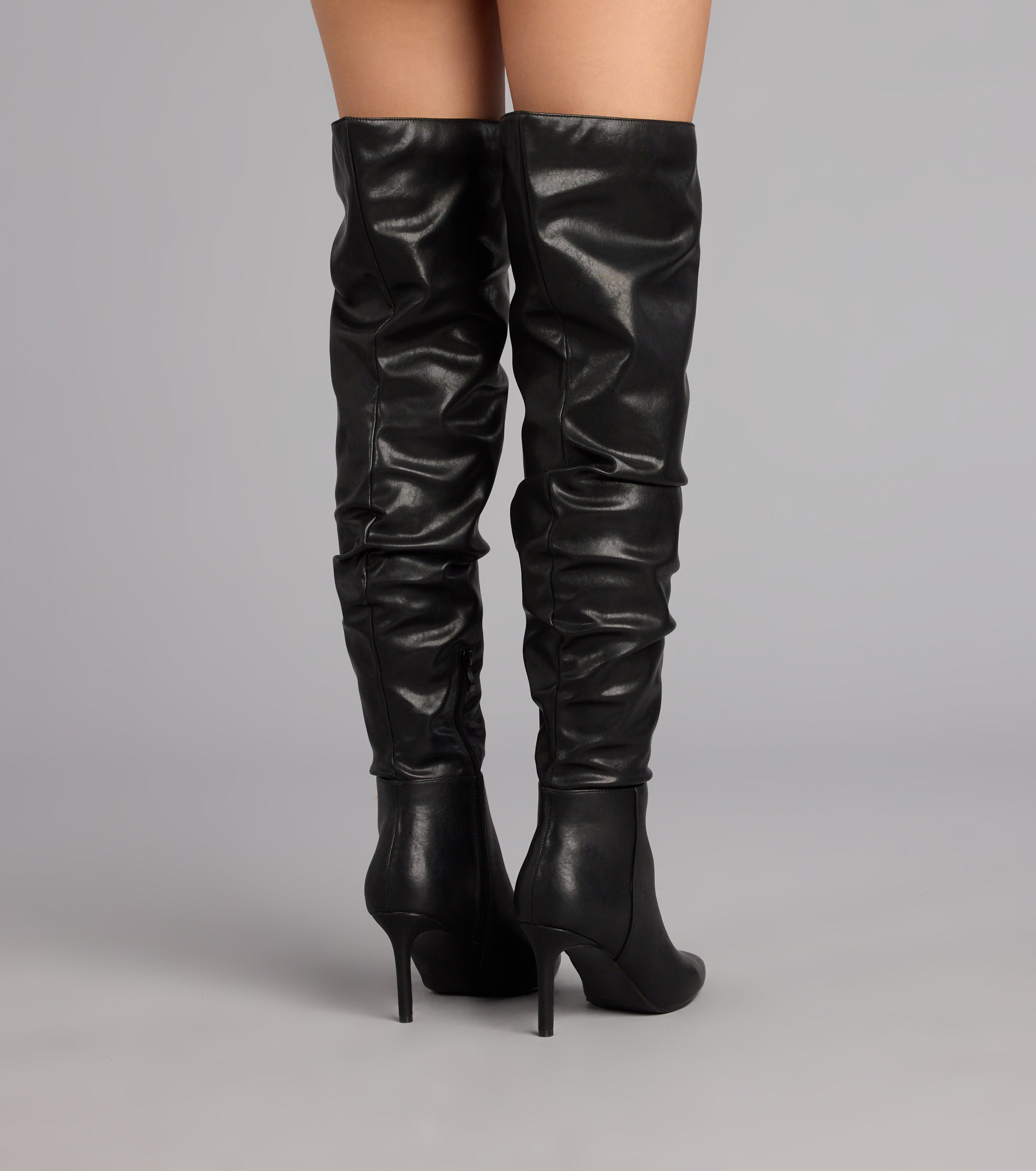 The definition of drama. These scrunch thigh-high boots strike the perfect balance of luxe and daring, with a pointed toe and sleek stiletto heel made to elevate all your fall outfits.