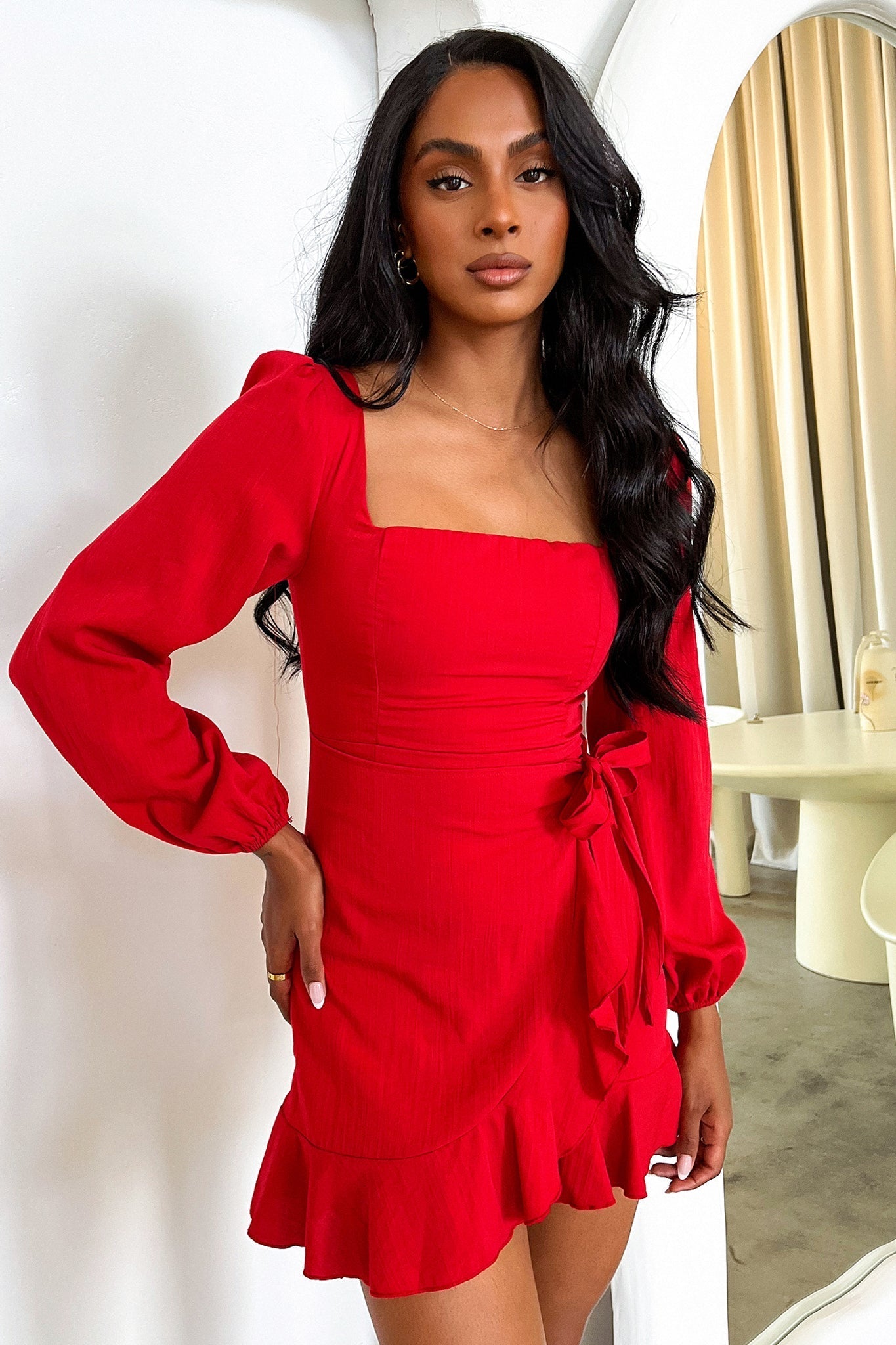 A flowy little moment! The Silvana Dress is a babe offering a flowy fit, double lining, log balloon sleeves, a square neckline, an invisible back zipper, frills along the bottom and tie up waist belts to cinch you in. Match her with Black Strappy heels and accessorise with gold jewellery.