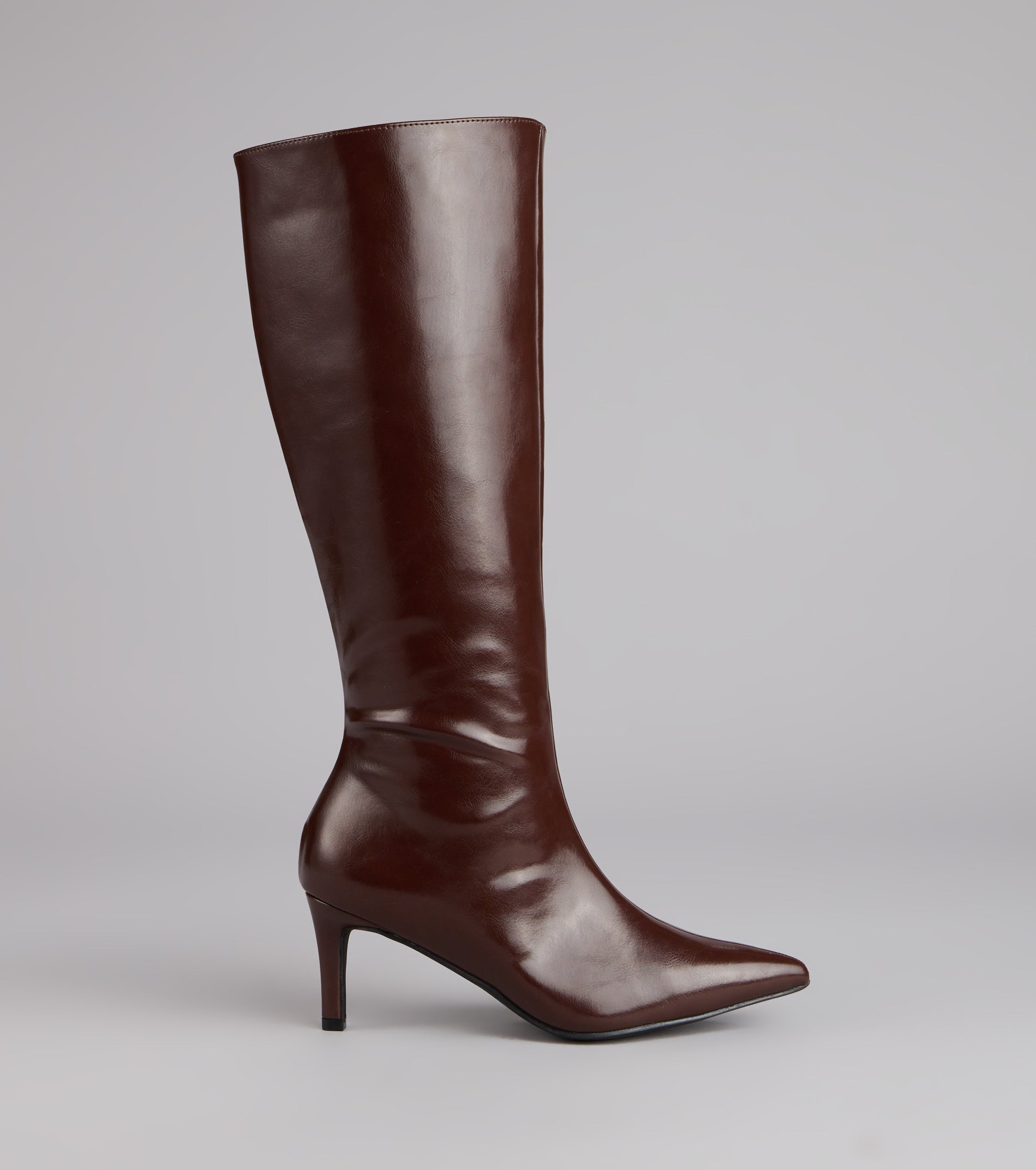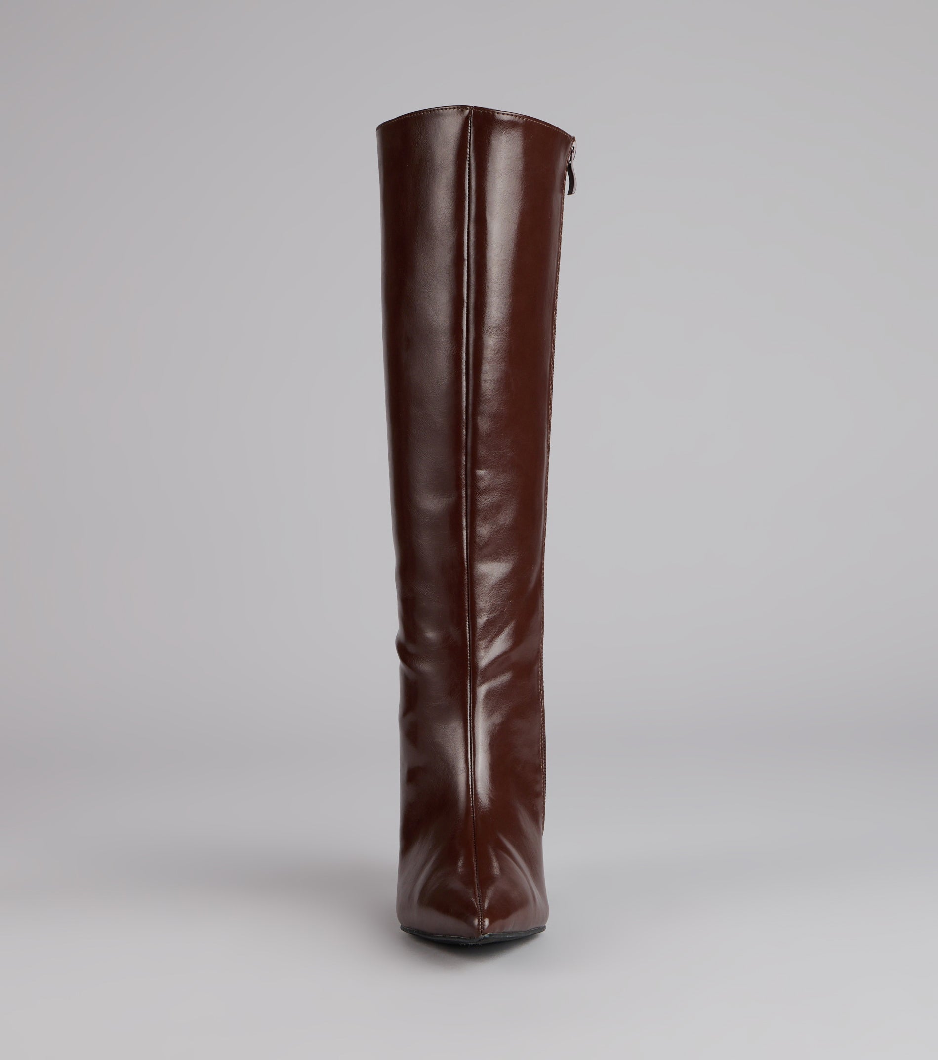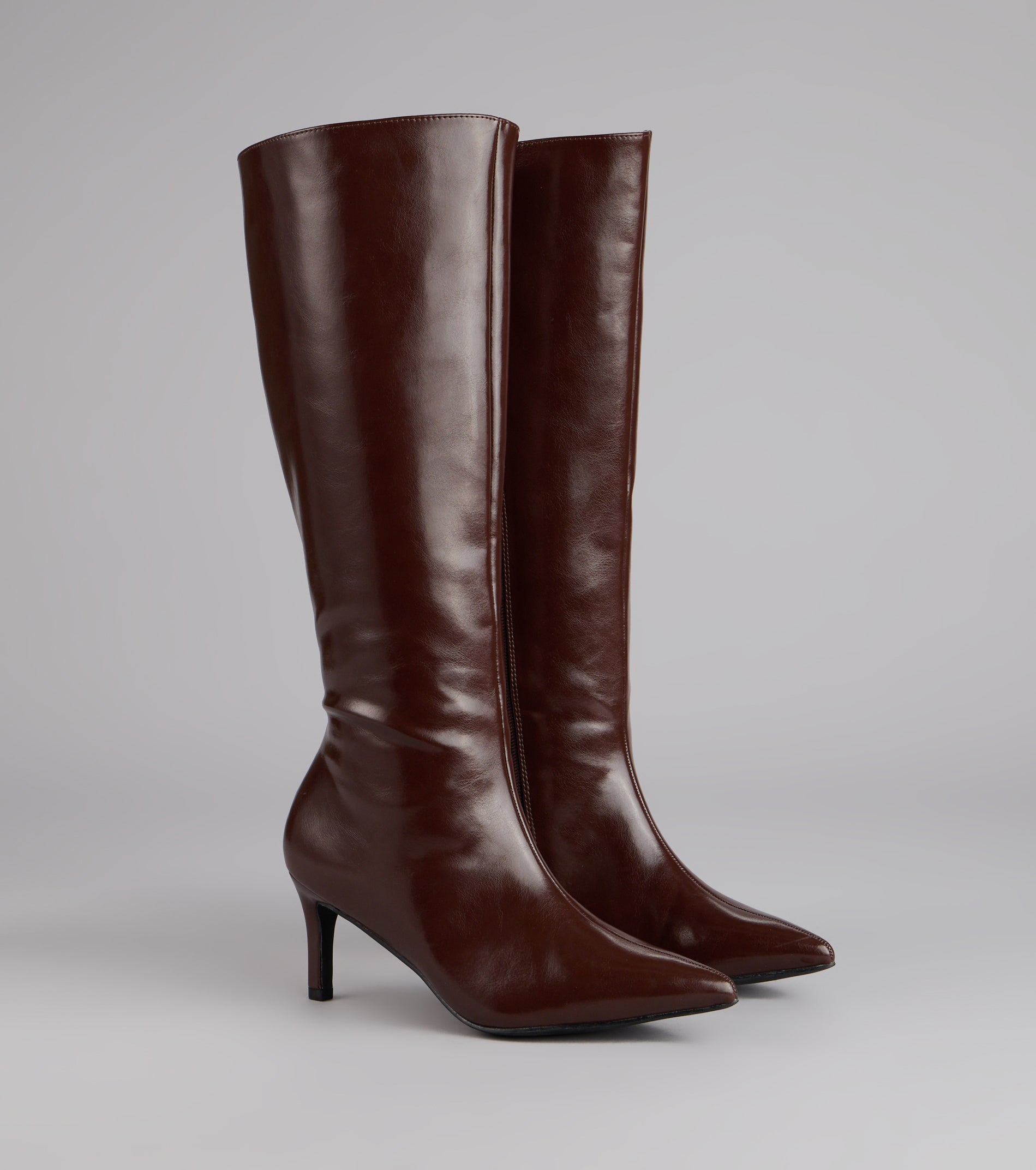 Cold-weather dressing just got elevated. These faux leather boots bring timeless polish with a pointed toe and sleek under-the-knee cut, with a stiletto heel that pairs effortlessly with fall layers.