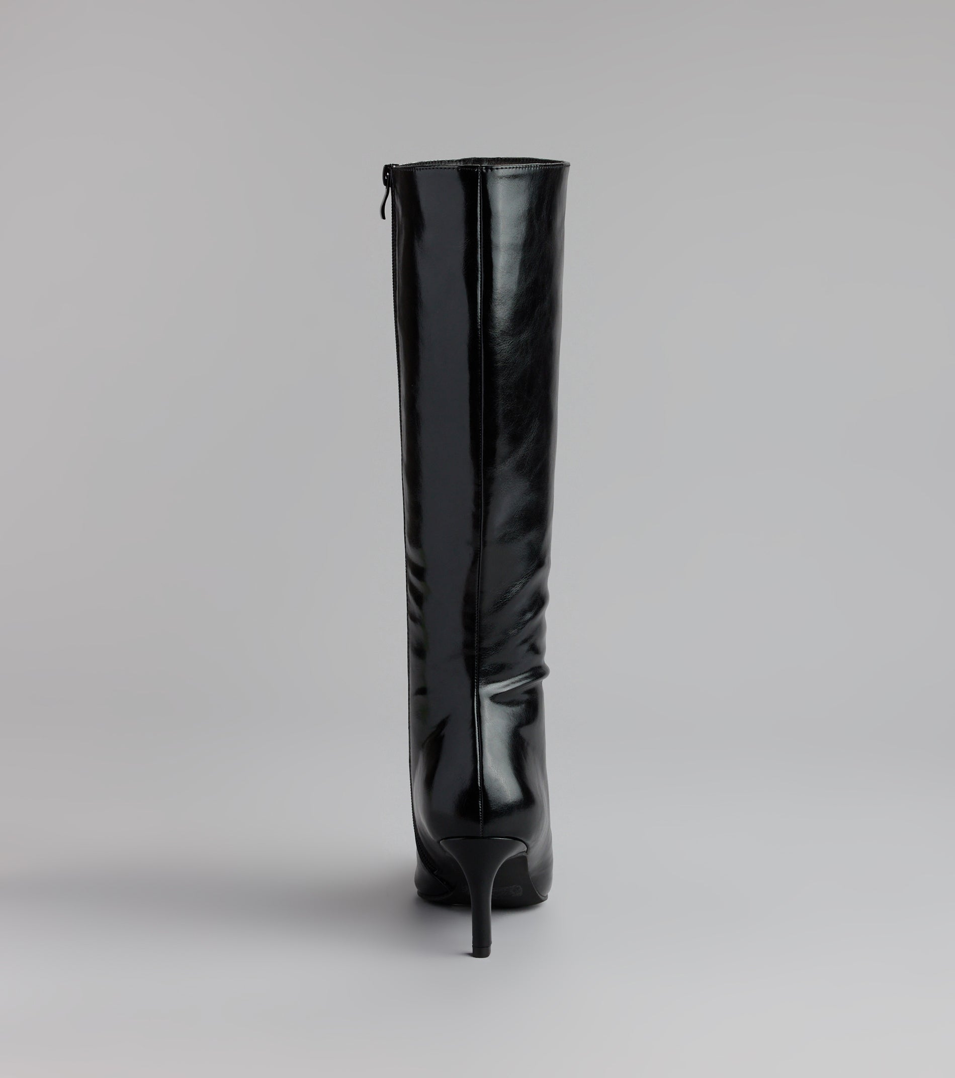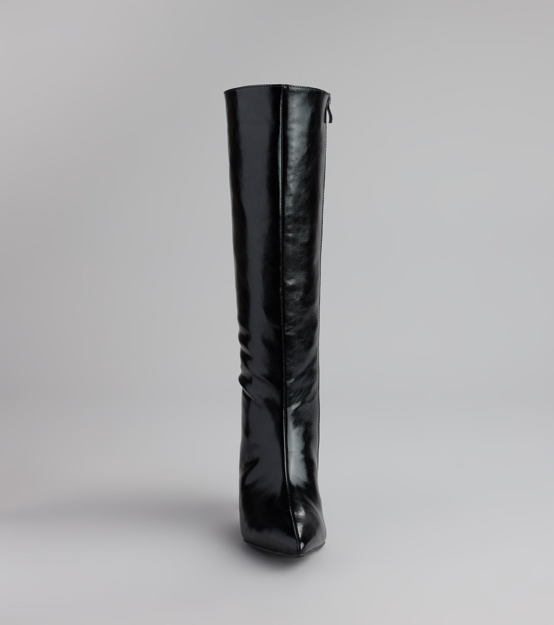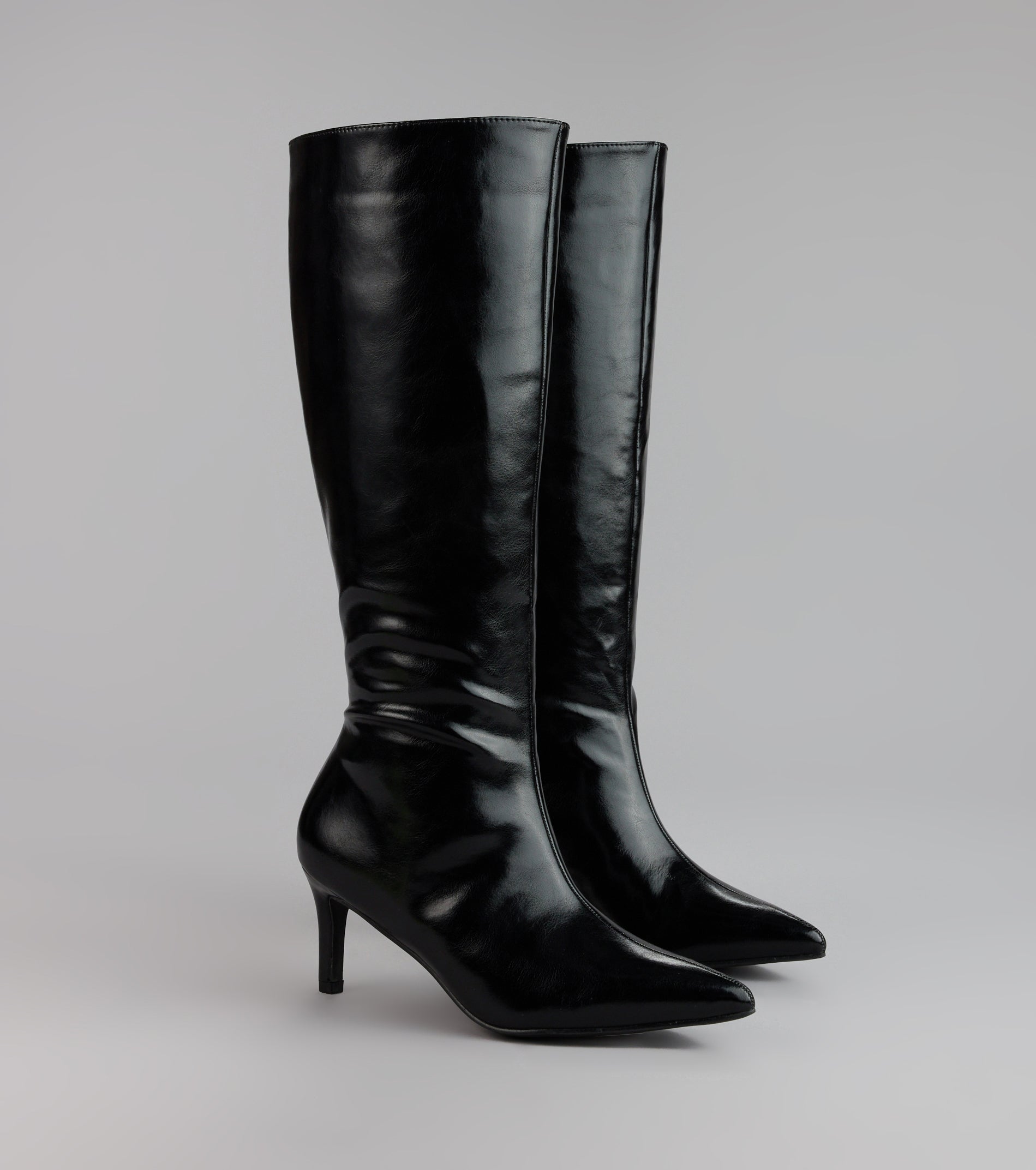Cold-weather dressing just got elevated. These faux leather boots bring timeless polish with a pointed toe and sleek under-the-knee cut, with a stiletto heel that pairs effortlessly with fall layers.