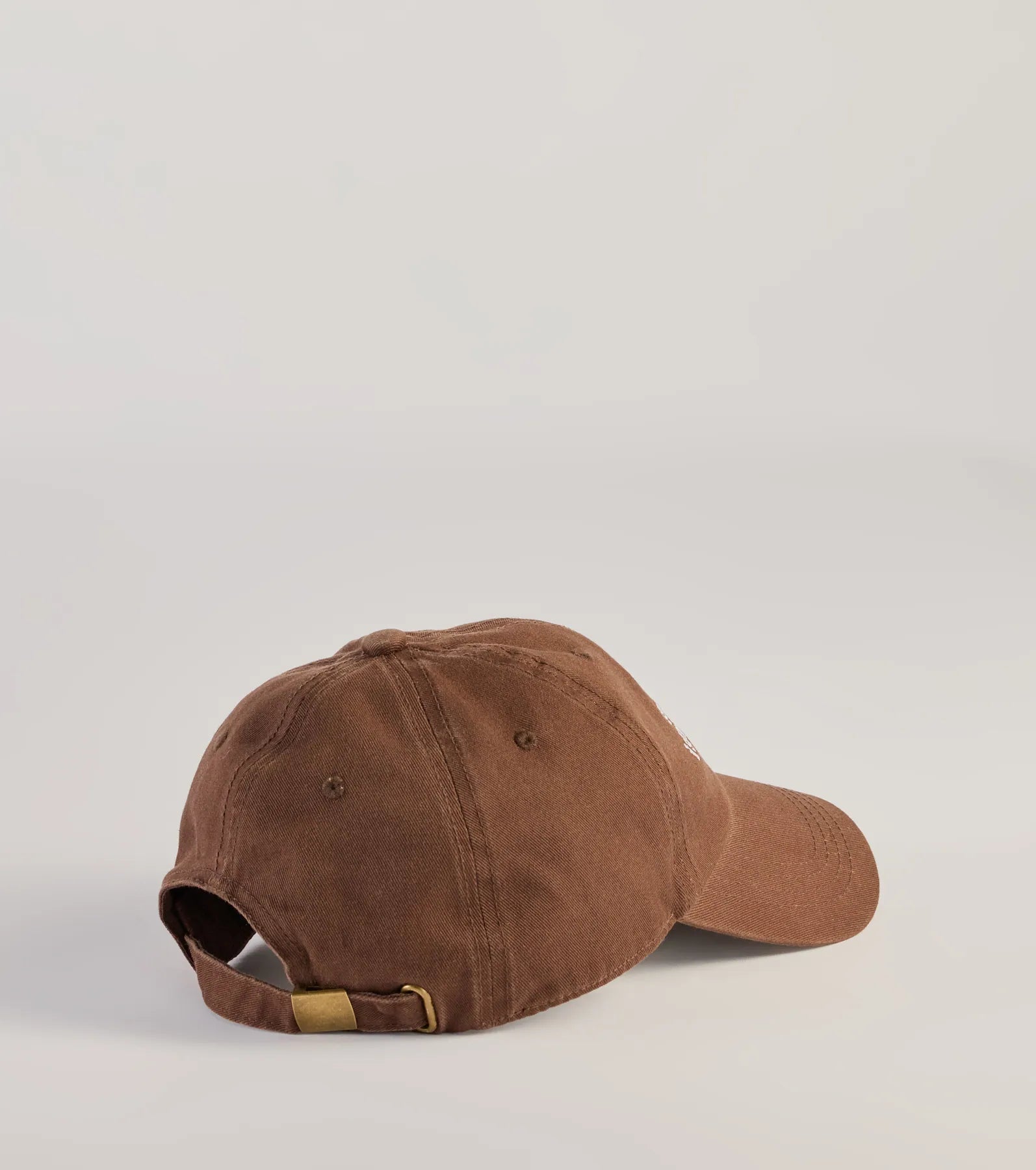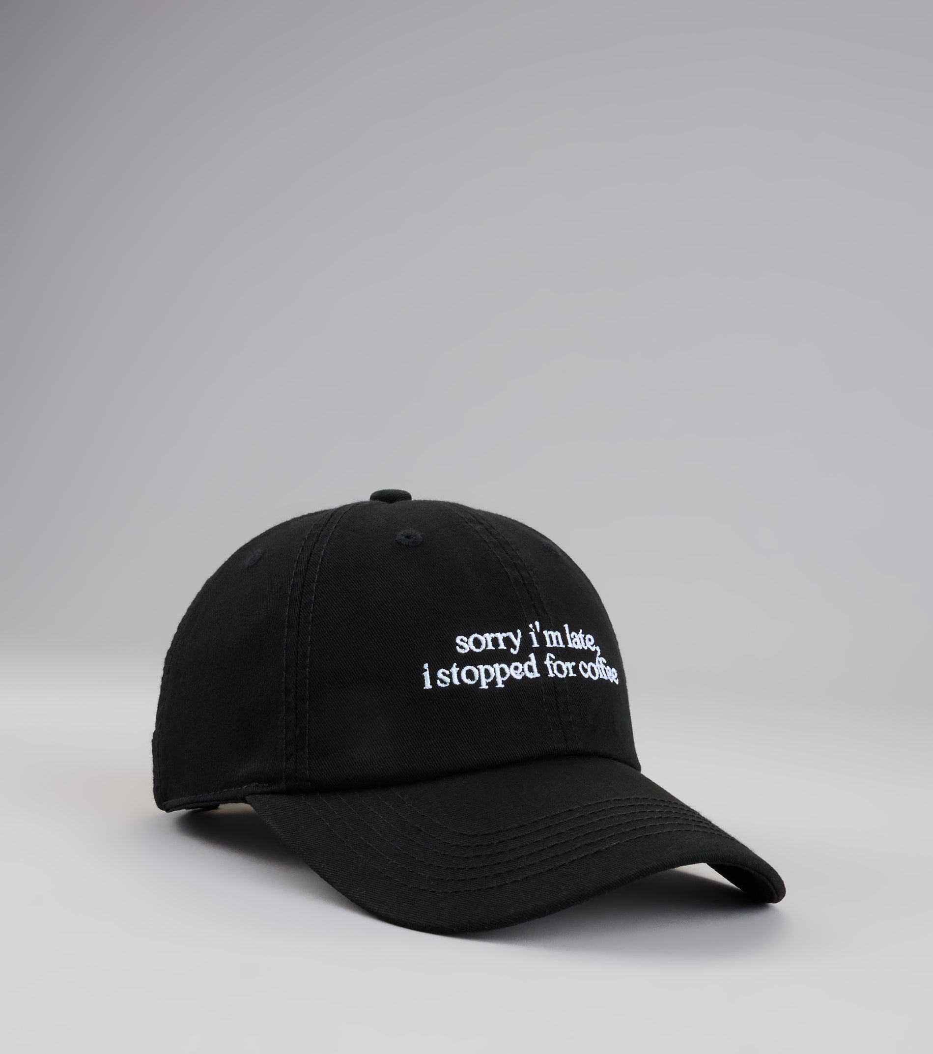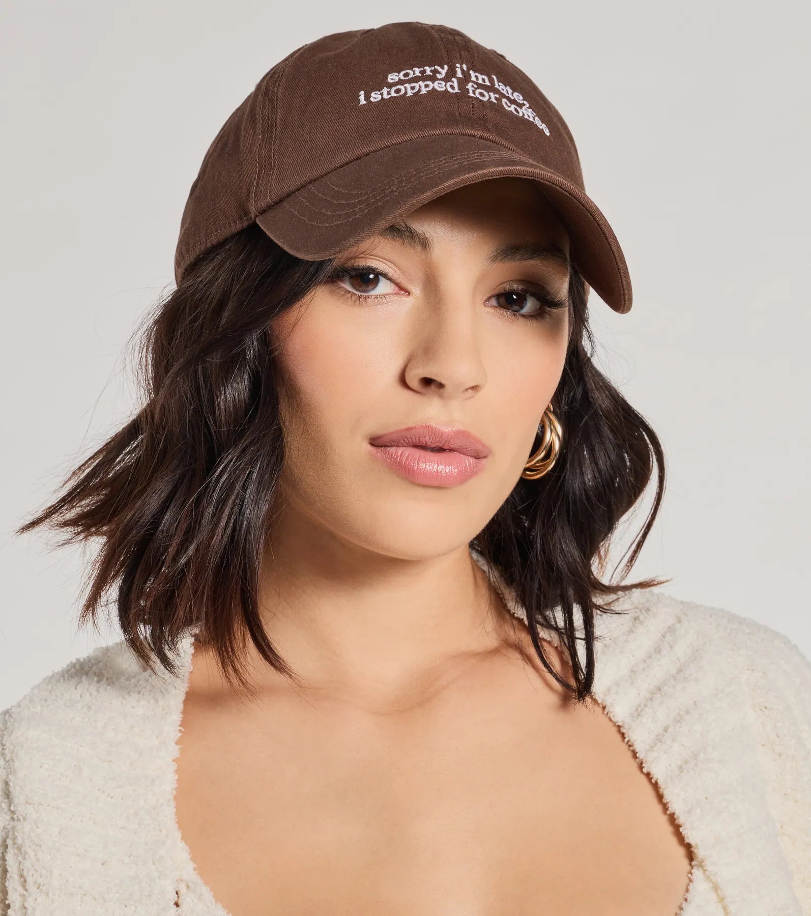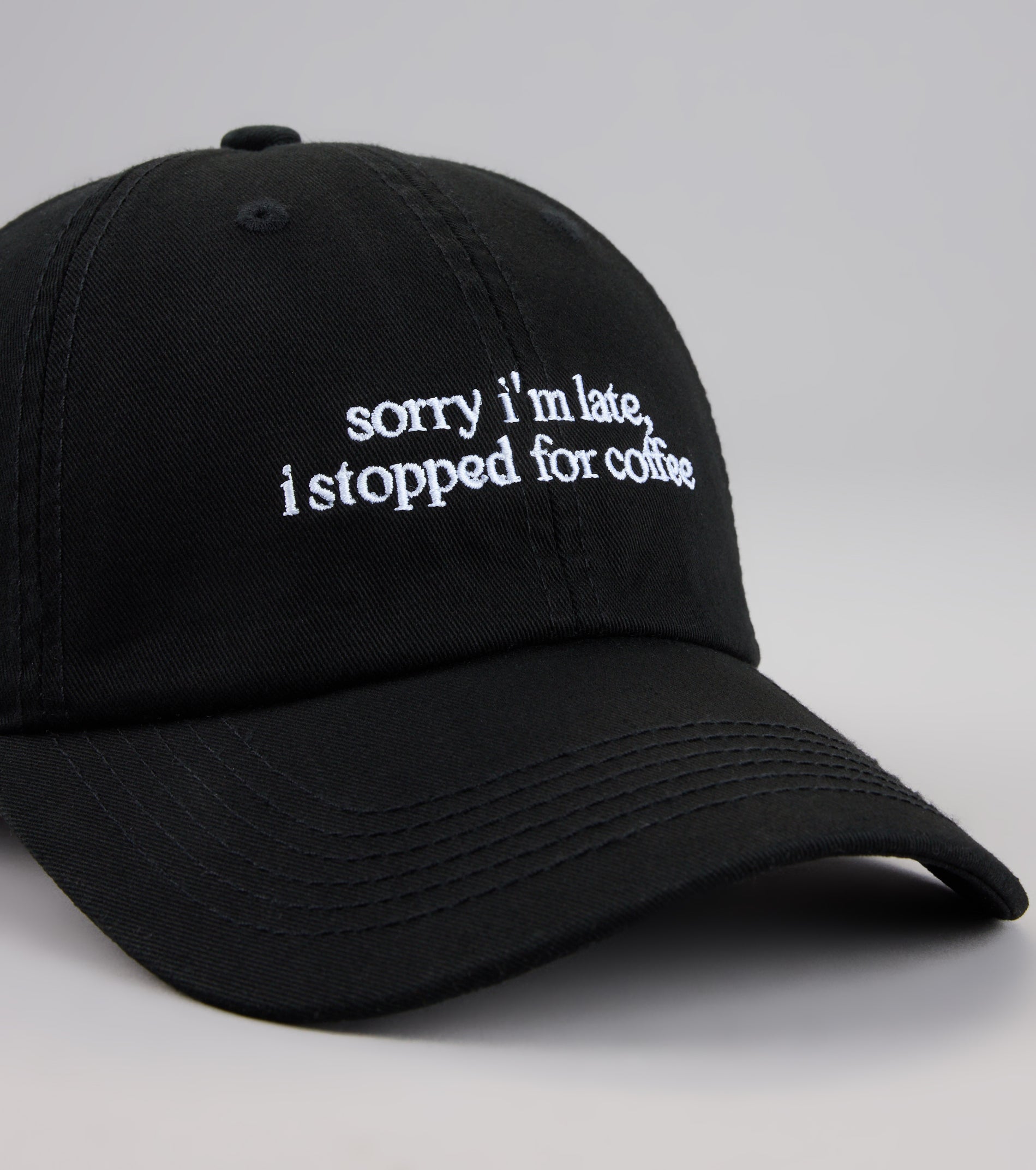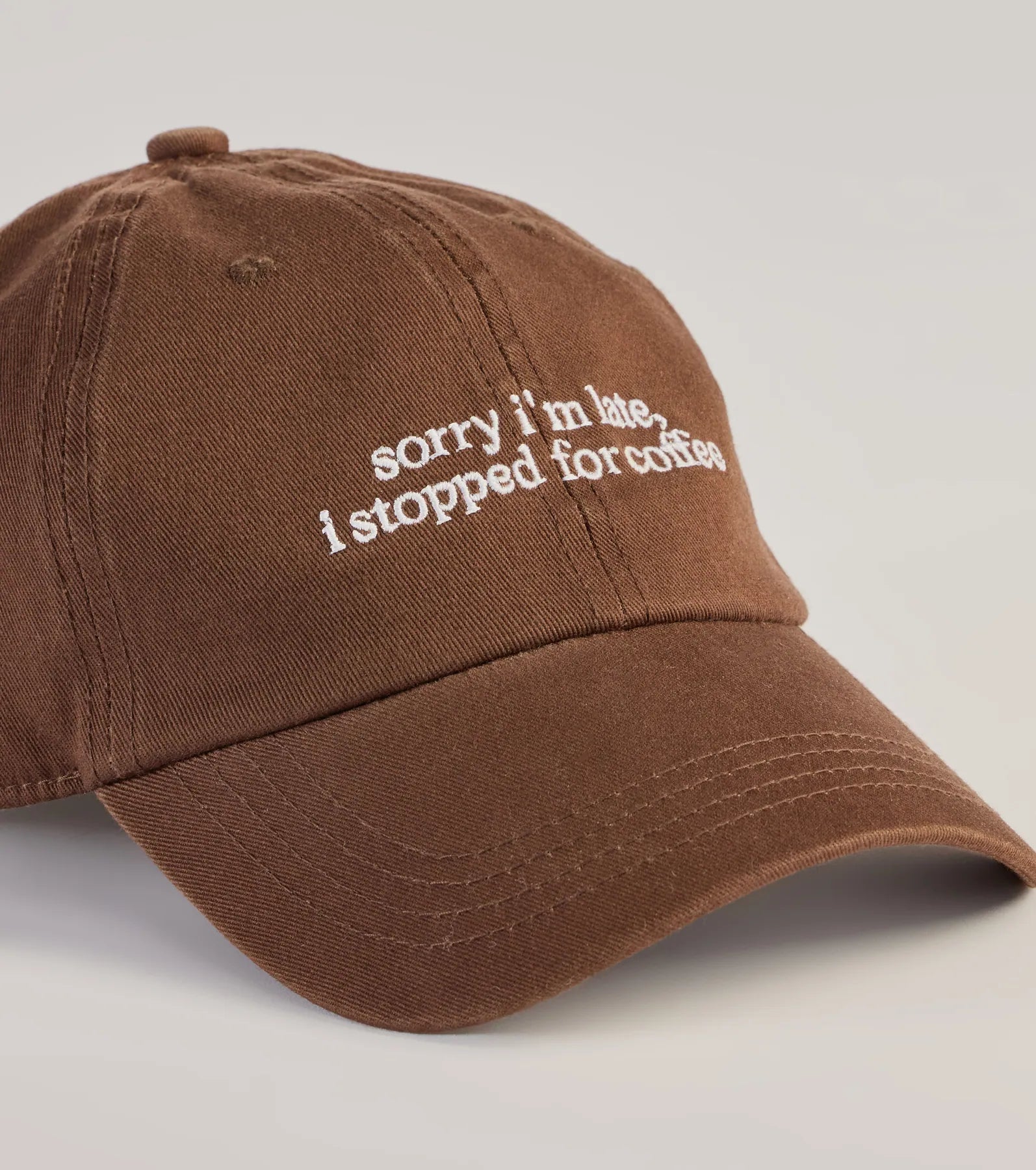 The perfect baseball cap for all coffee lovers! This adorable hat features an embroidered script reading, "sorry I'm late, I stopped for coffee," and includes a back adjustable strap with a metal buckle.