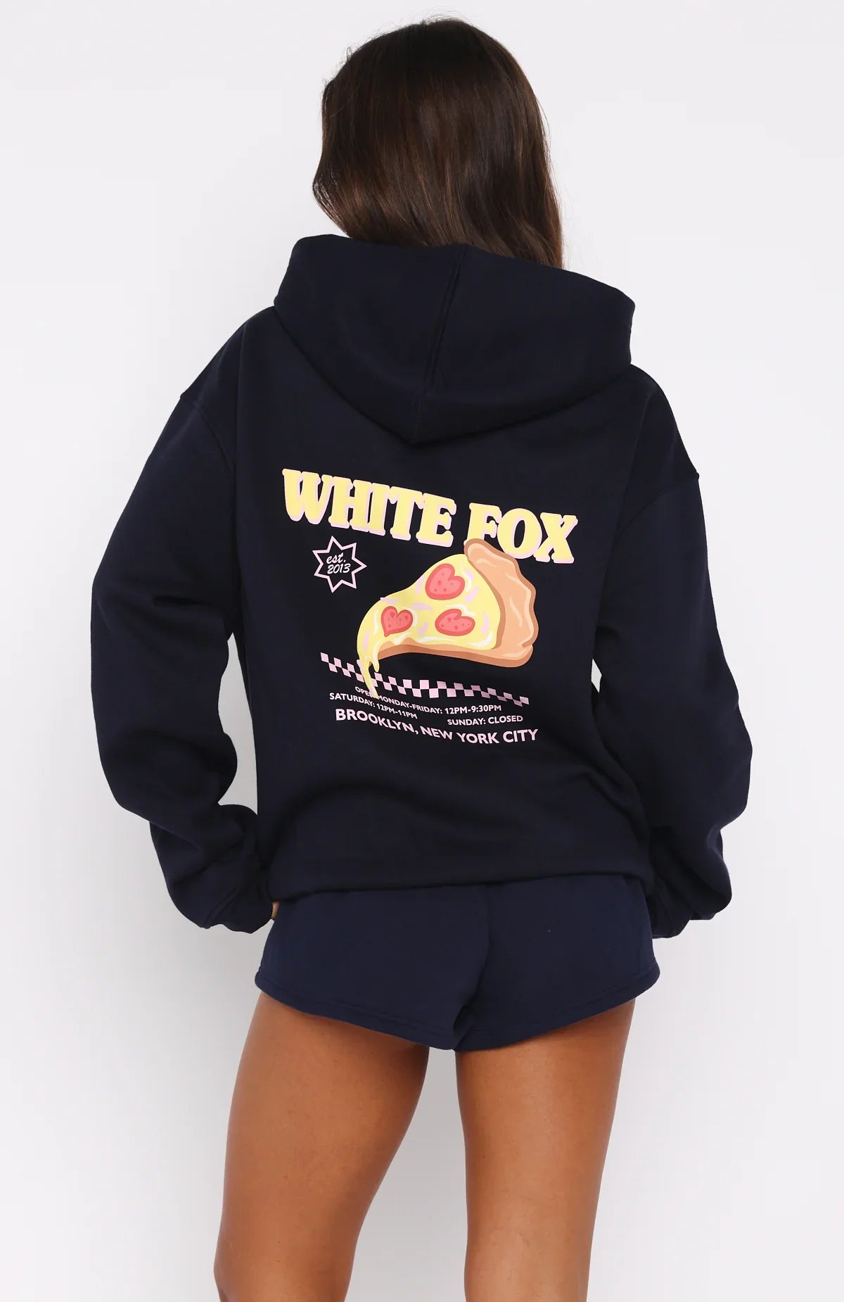 Where comfort meets street style. The Sweeter Nights Oversized Hoodie Navy is designed with a relaxed hood, slouched shoulders and ribbed hems which round out an oversized silhouette. Featuring long sleeves, a roomy front pocket, and an unlined fleece interior, this hoodie delivers a cozy feel. White Fox print text embellishes the side front and back, paired with a printed graphic. Style with lounge shorts and fun sneakers to meet the street style vibe.