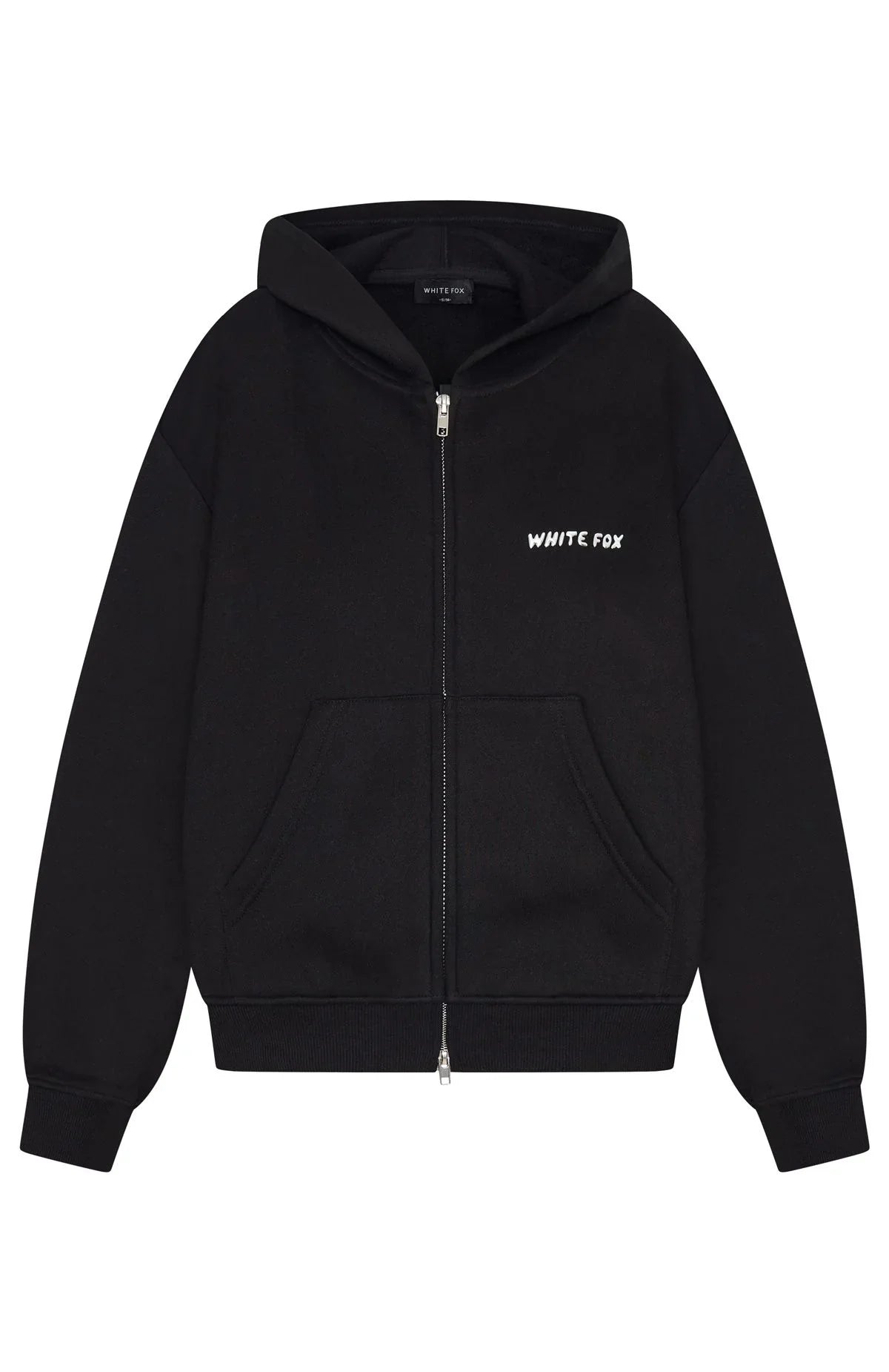Lounge lovers are obsessed with the Test Drive Boxy Zip Front Hoodie in Black! Designed with a relaxed hood, slouched shoulders, ribbed cuffs, and ribbed waist panel for a cinched look. This boxy fit hoodie features long sleeves, front zipper double ended closure, and an unlined fleece interior, this hoodie delivers a cozy feel. Finished with puff print metallic White Fox text side front. Style with the matching Test Drive Lounge Shorts for a cozy yer cool fit.