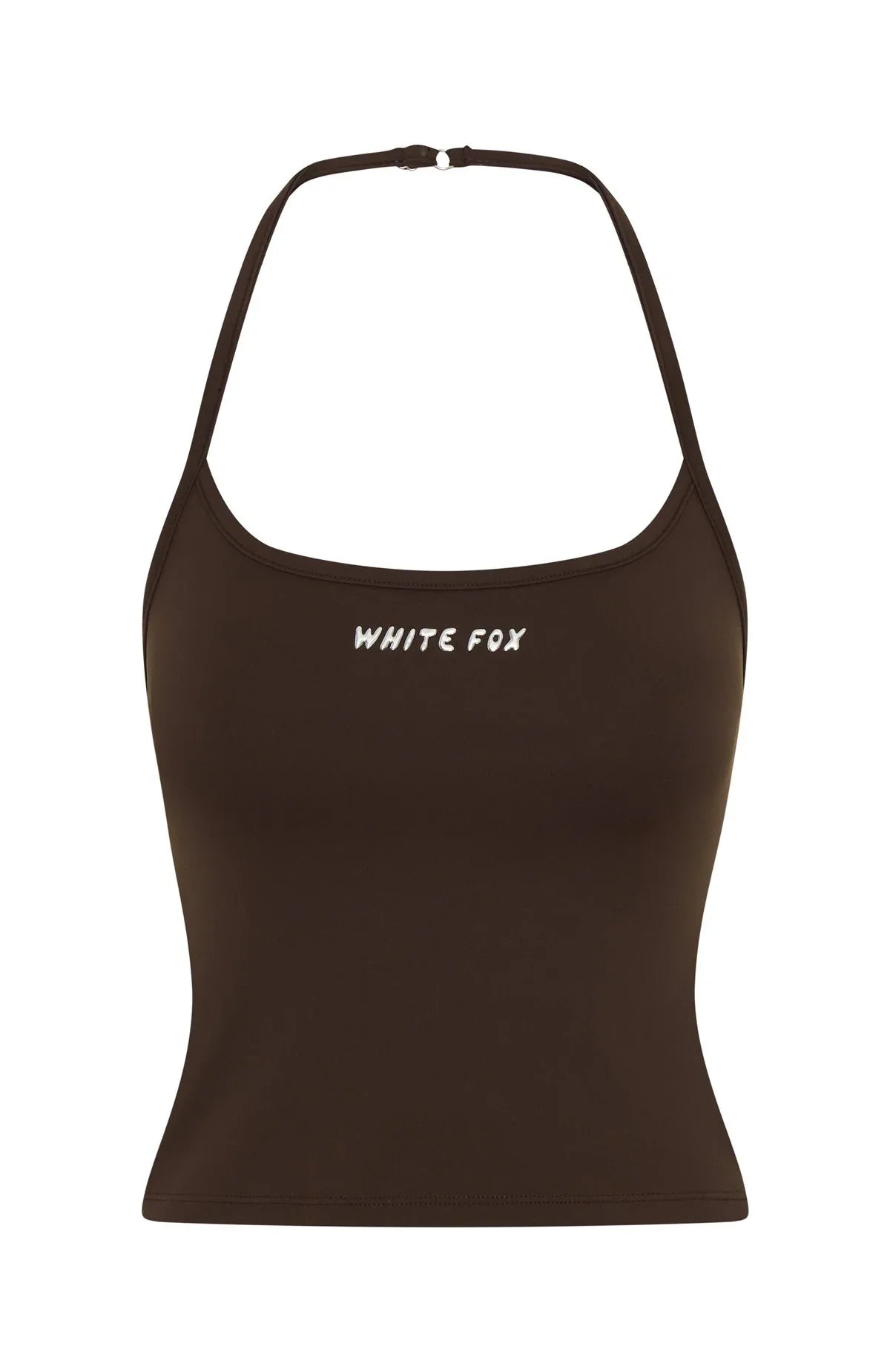Lounge lovers are obsessed with the Test Drive Halter Top Chocolate. Designed with fixed adjustable halter straps, a scoop neckline and a fitted bodice crafted in high-stretch fabrication, this sleek piece showcases a puff-print metallic White Fox text across the centre front. Style with the matching Test Drive Lounge Shorts for a cozy yet cool fit.