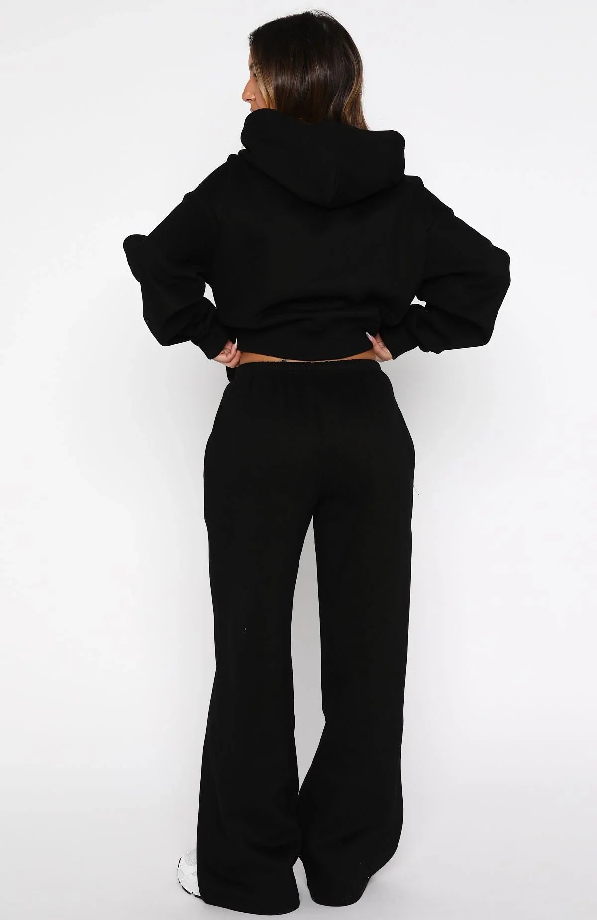 Lounge lovers are obsessed with the Test Drive Wide Leg Sweatpants in Black! Designed with a thick elasticated waistband featuring an internal drawstring tie, side pockets, and a wide-leg silhouette. The White Fox puff-print metallic text at the side adds a signature touch, while the unlined fleece interior ensures a cozy feel. Style with the matching Test Drive Oversized Sweater for a cozy yet cool fit.