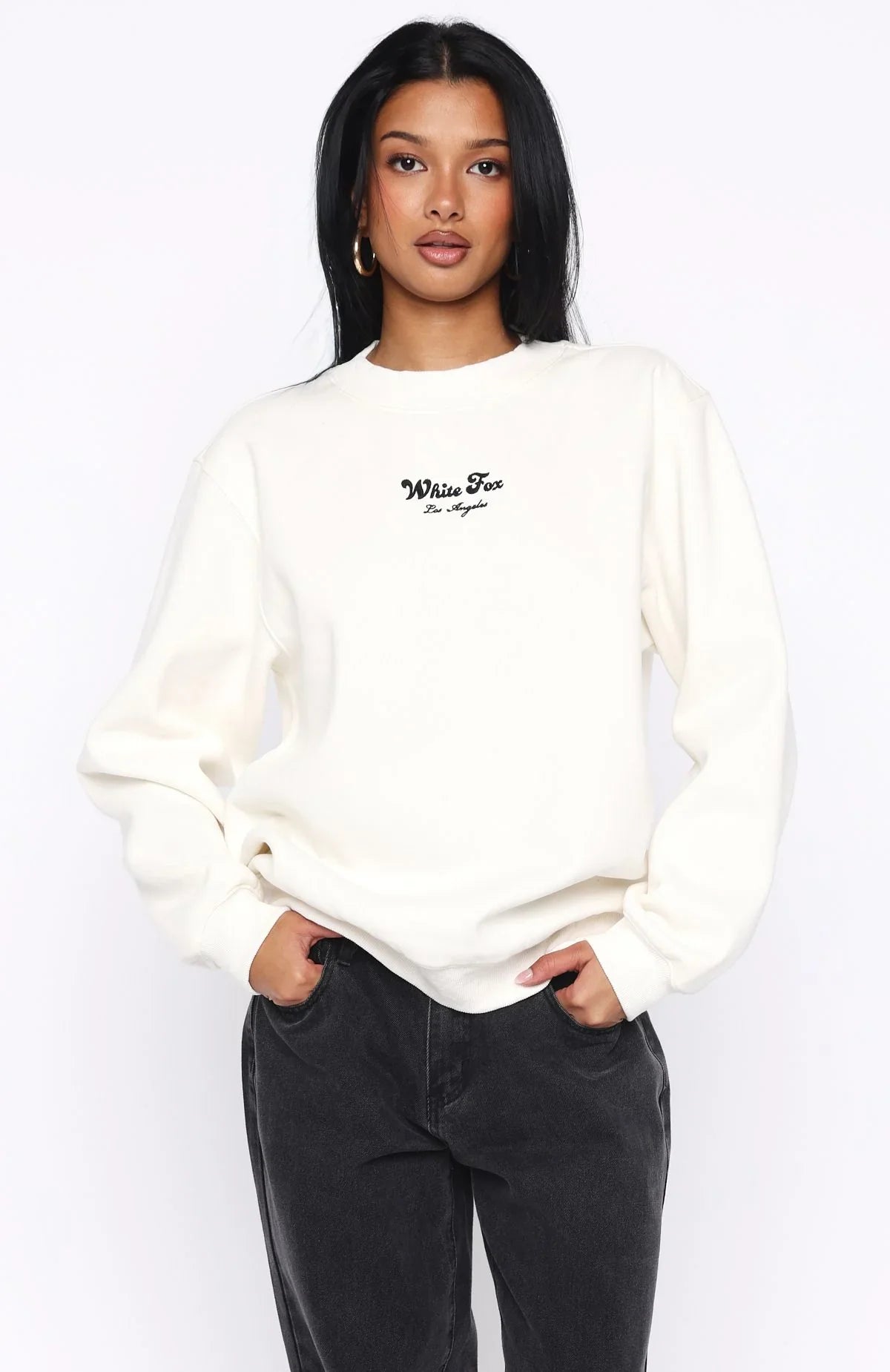 The Through Thick And Thin Oversized Sweater in Cream redefines loungewear with a dainty edge. Designed with slouched shoulders and ribbed hems which round out an oversized silhouette. Featuring long sleeves, and an unlined fleece interior, this hoodie delivers a cozy feel. White Fox and Los Angeles stitched text embellishes the centre front and back. Pair with your go-to jeans and layered gold jewellery for a chill weekend fit.