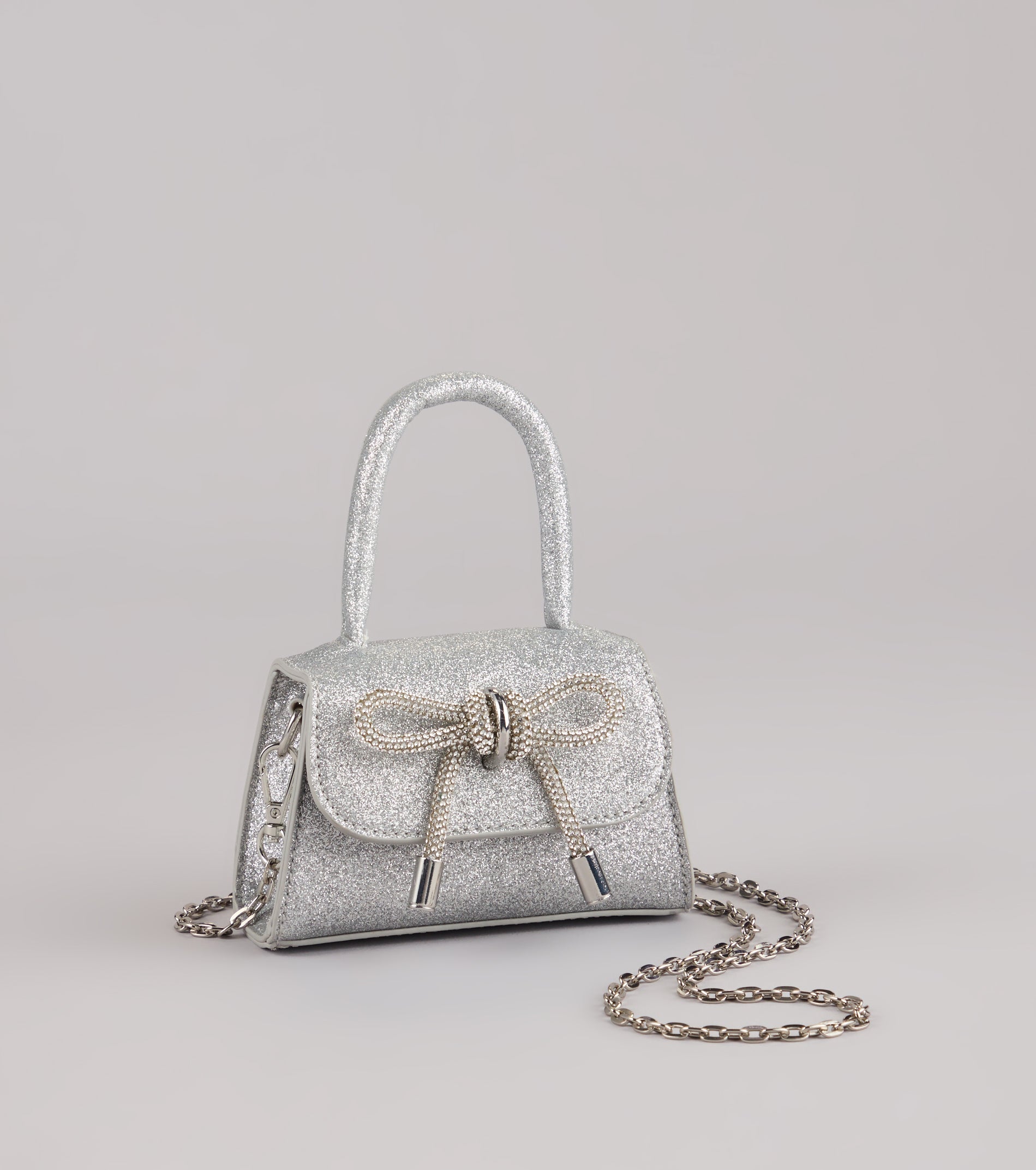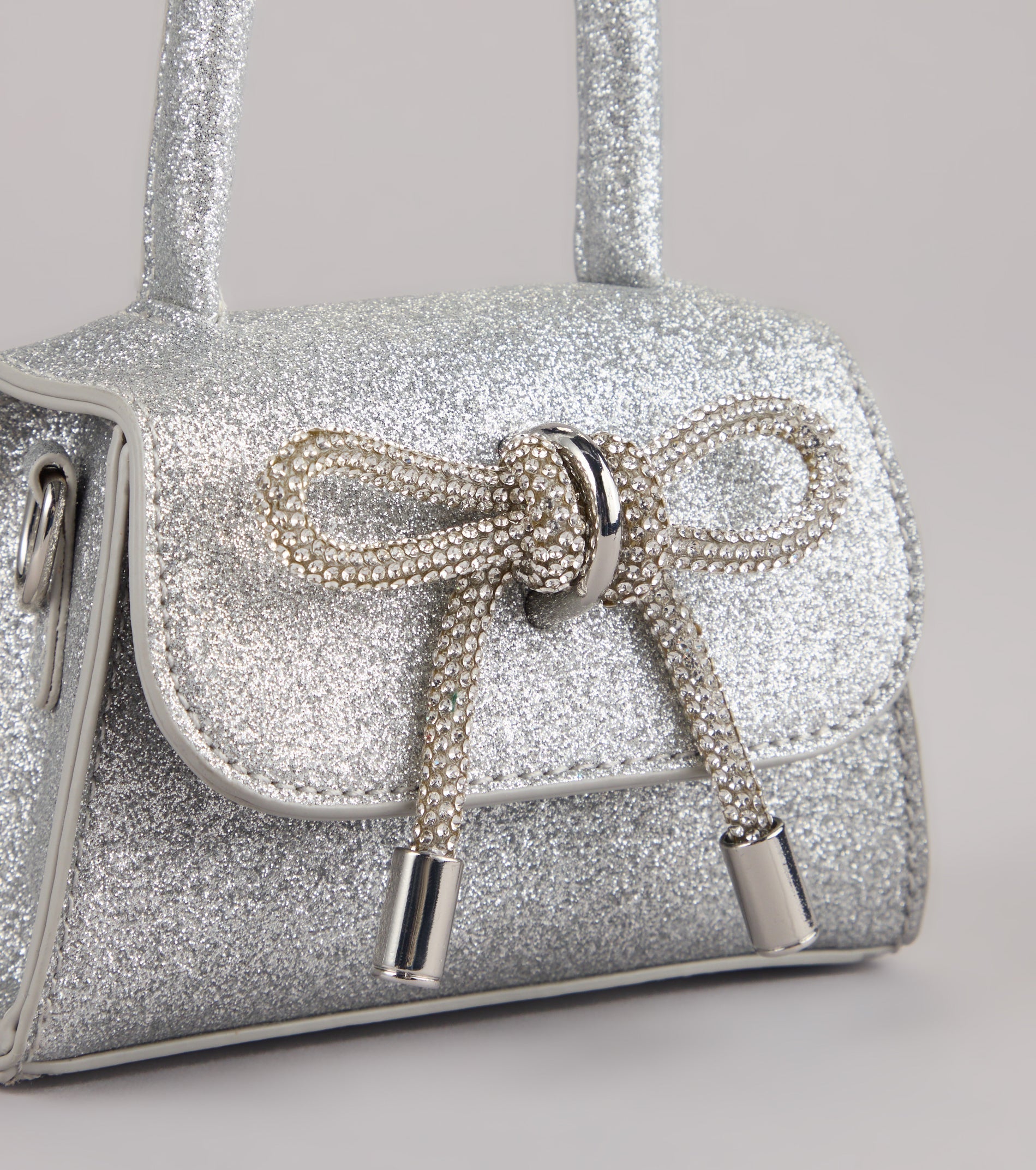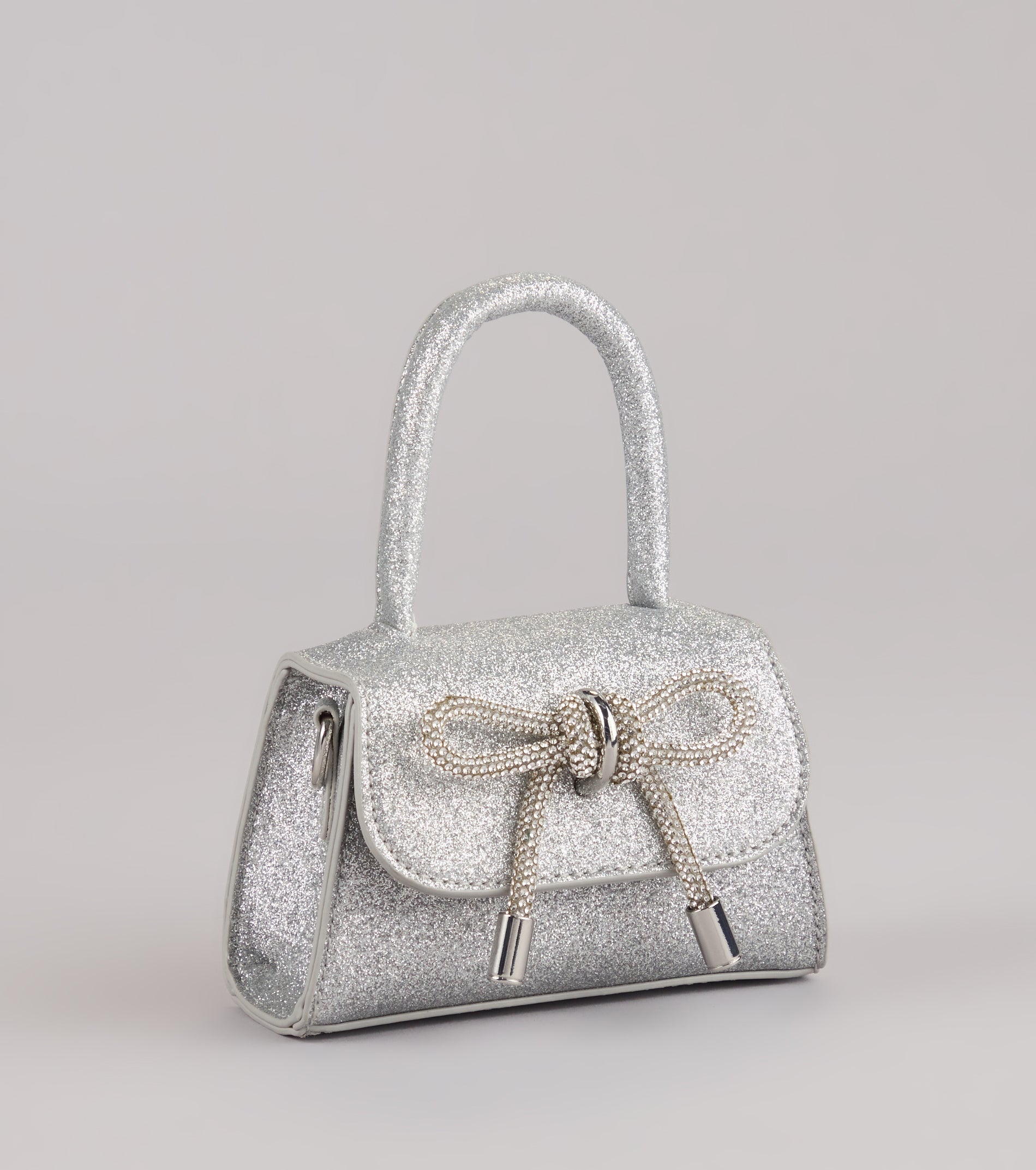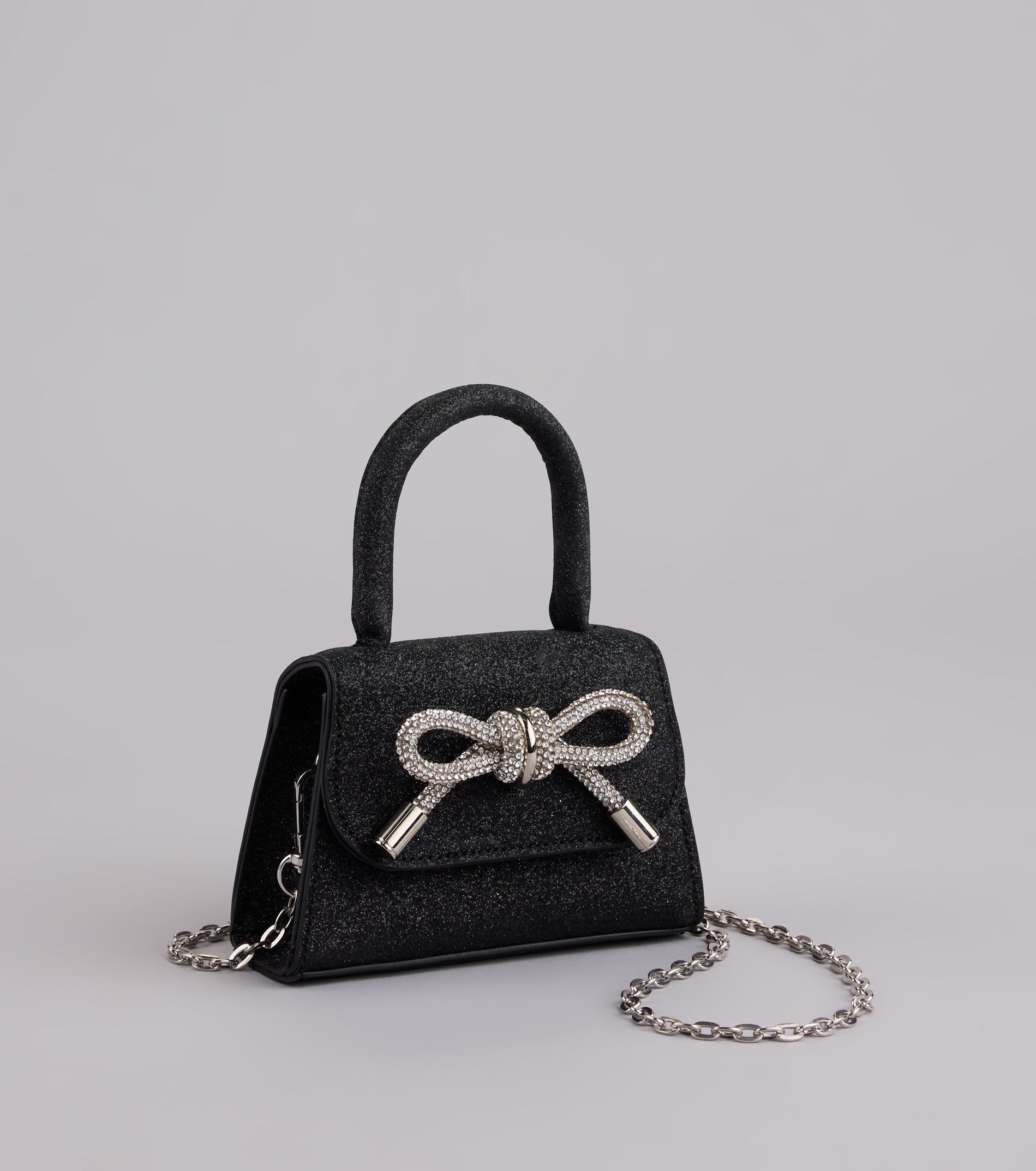 A little glam goes a long way. This mini bag shines with glitter and a rhinestone bow—perfect for adding sparkle to any date night or dressy night out!